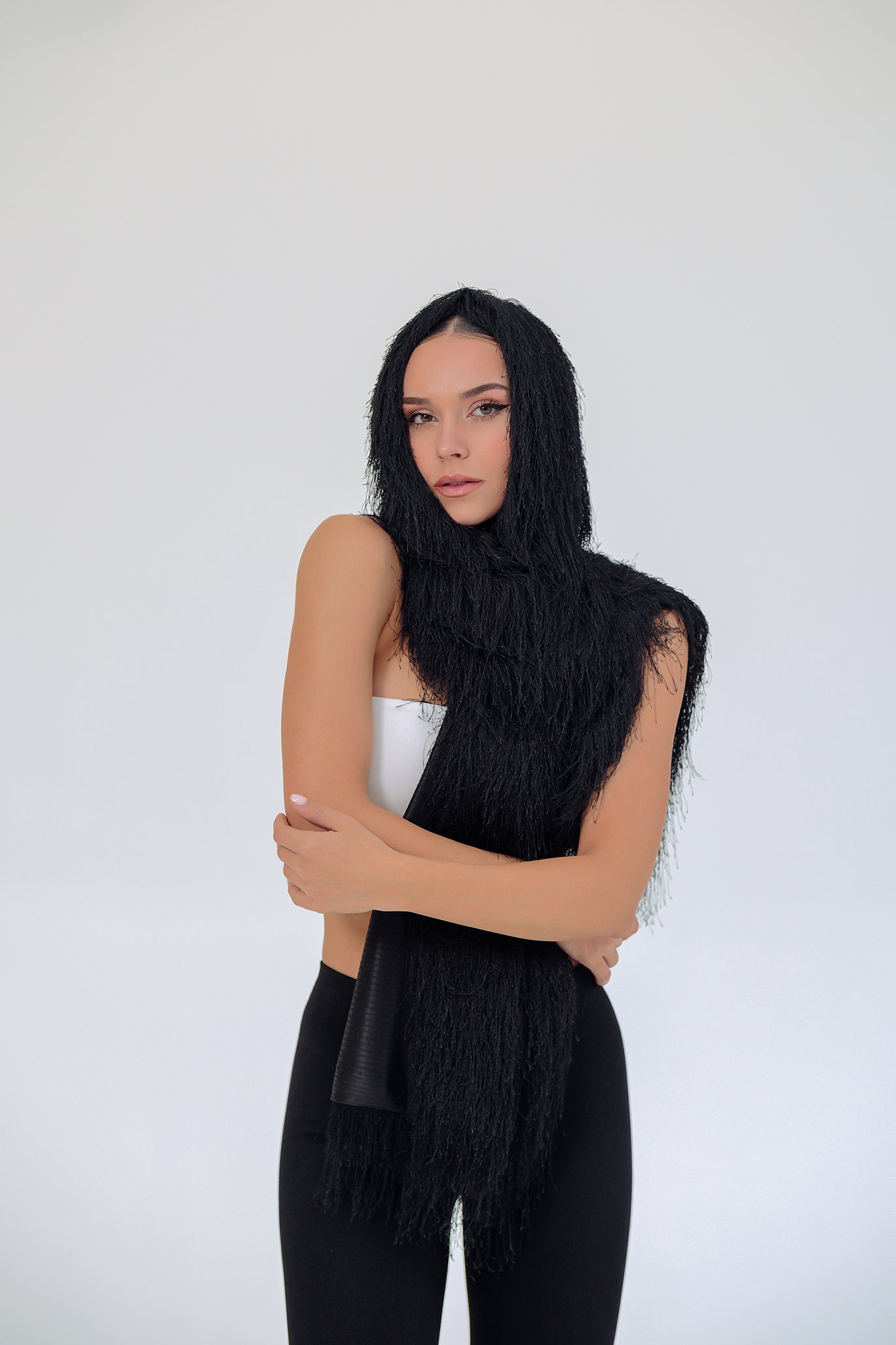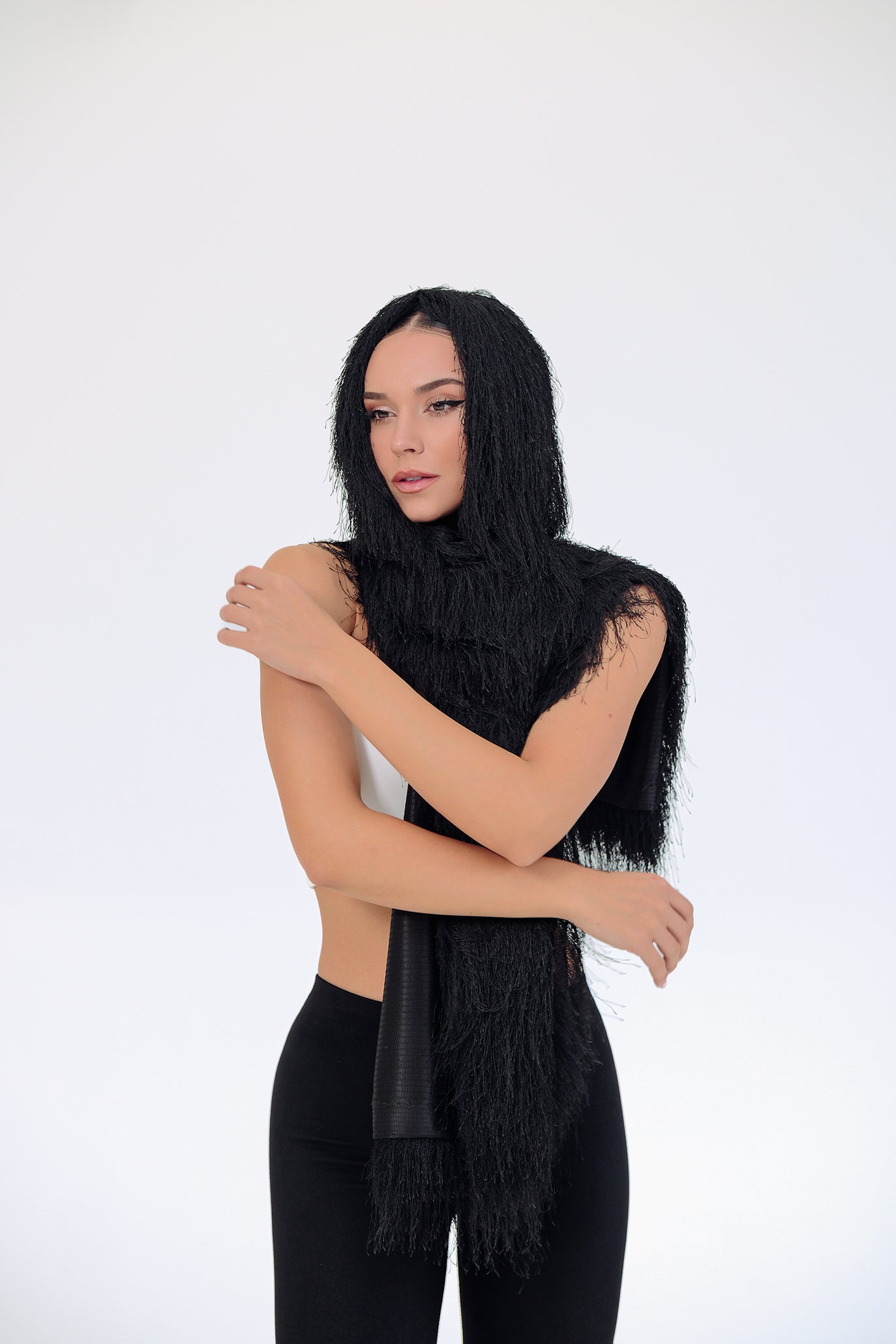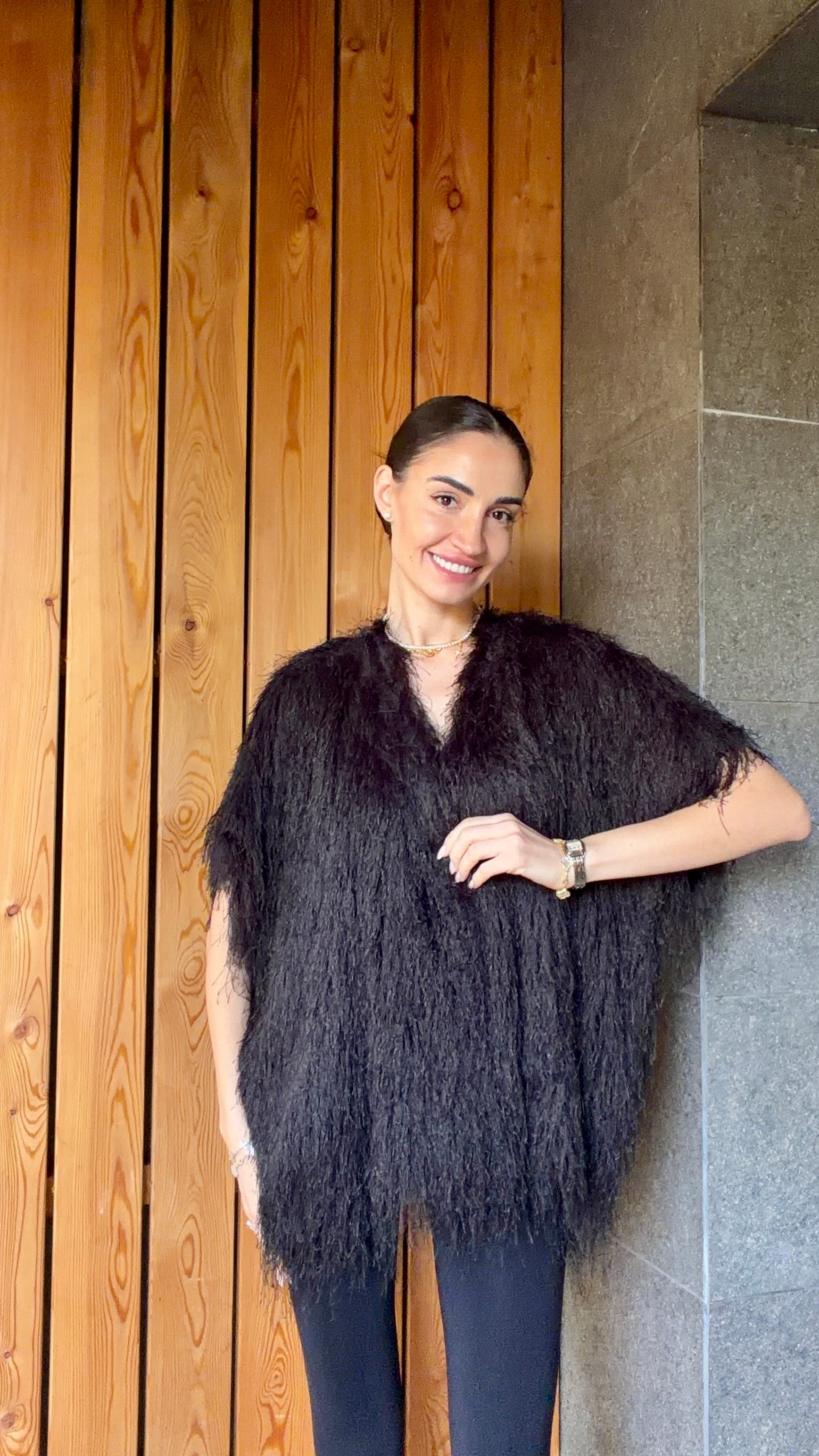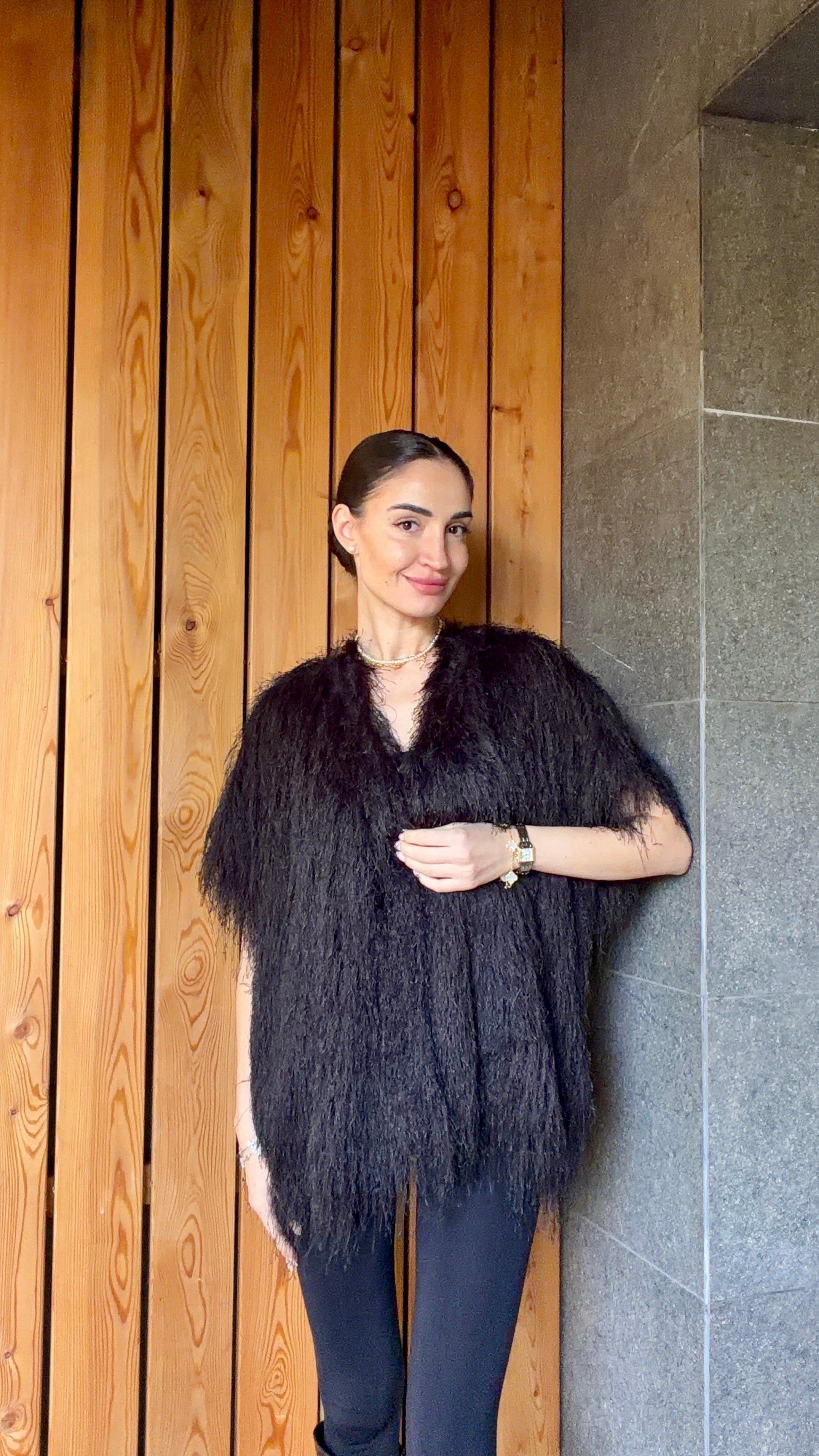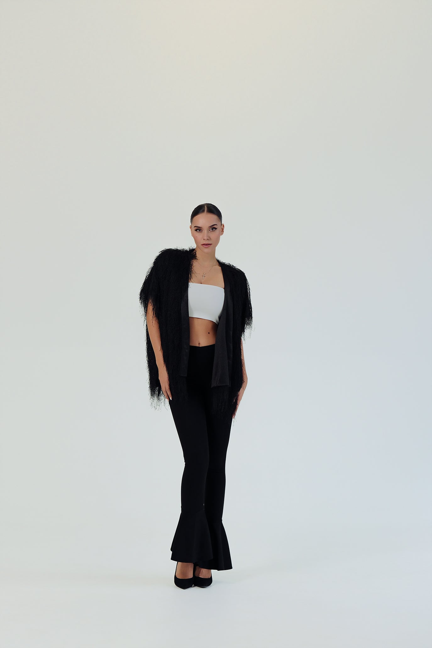 Ефектна къса жилетка, изработена от специални конци - ресни с ефект на пера или косъм. Къс ръкав тип наметка, дължина до към средата на бедрото и леко движение при всяка стъпка. Идеален завършек върху рокли, костюми и гащеризони. Дължина на наметалото - 75см.