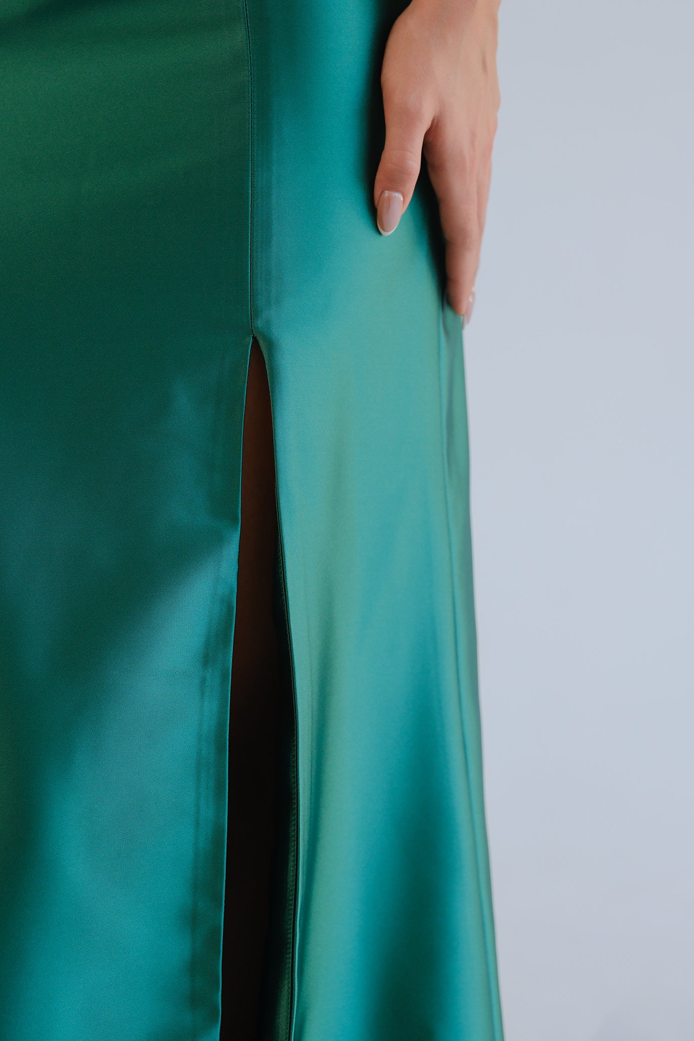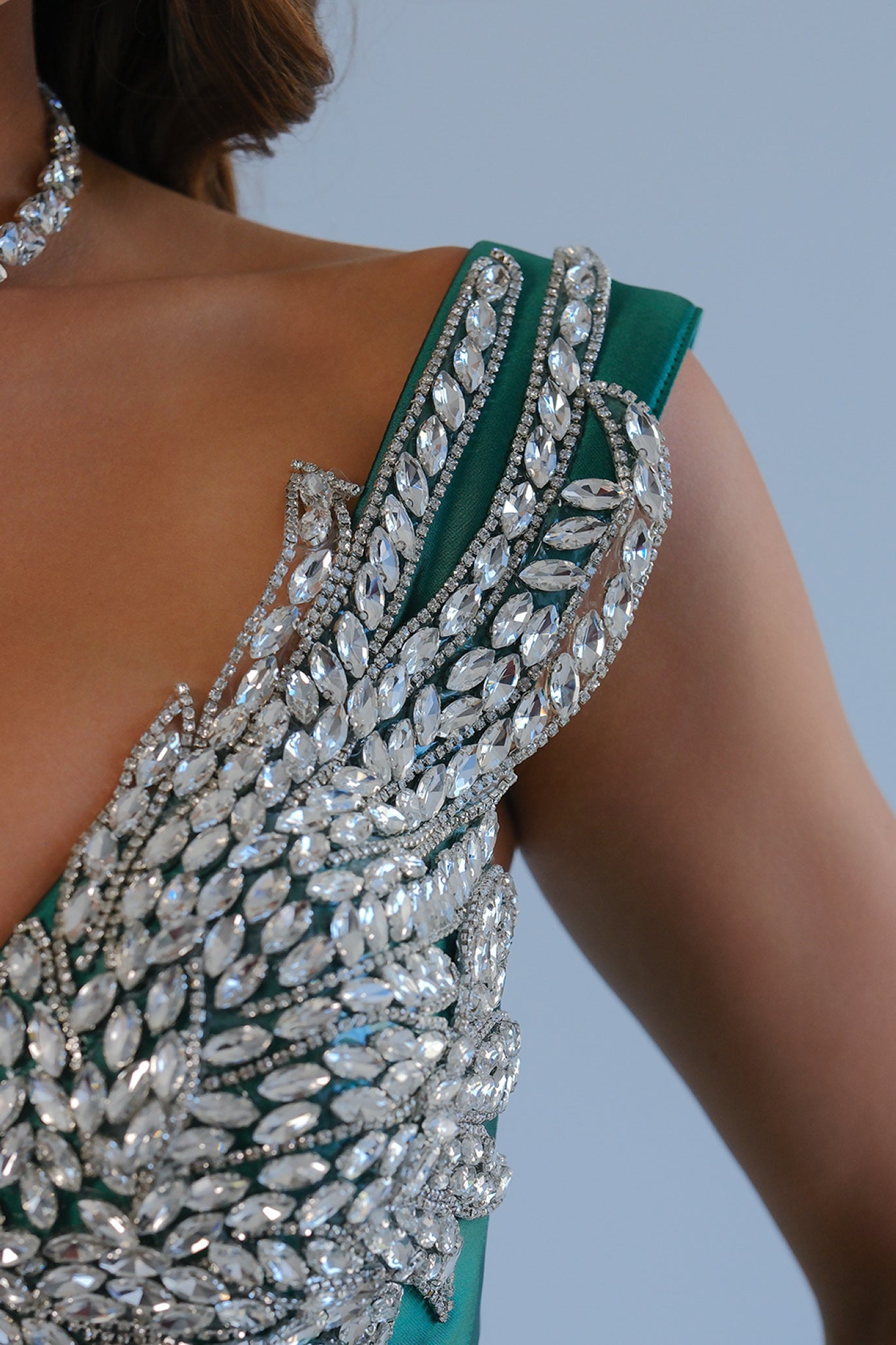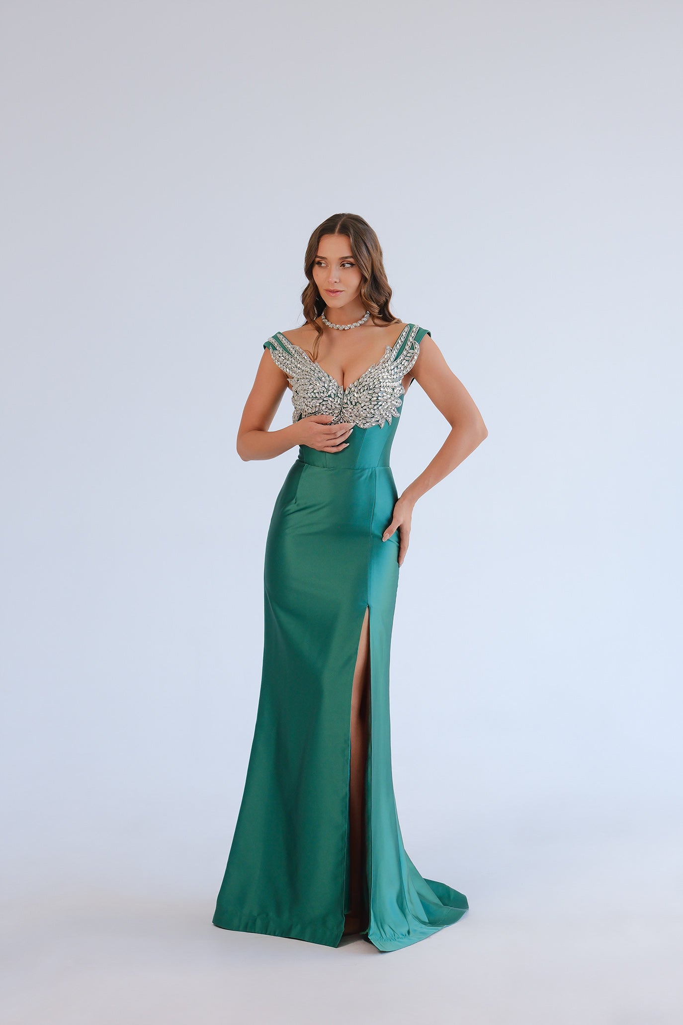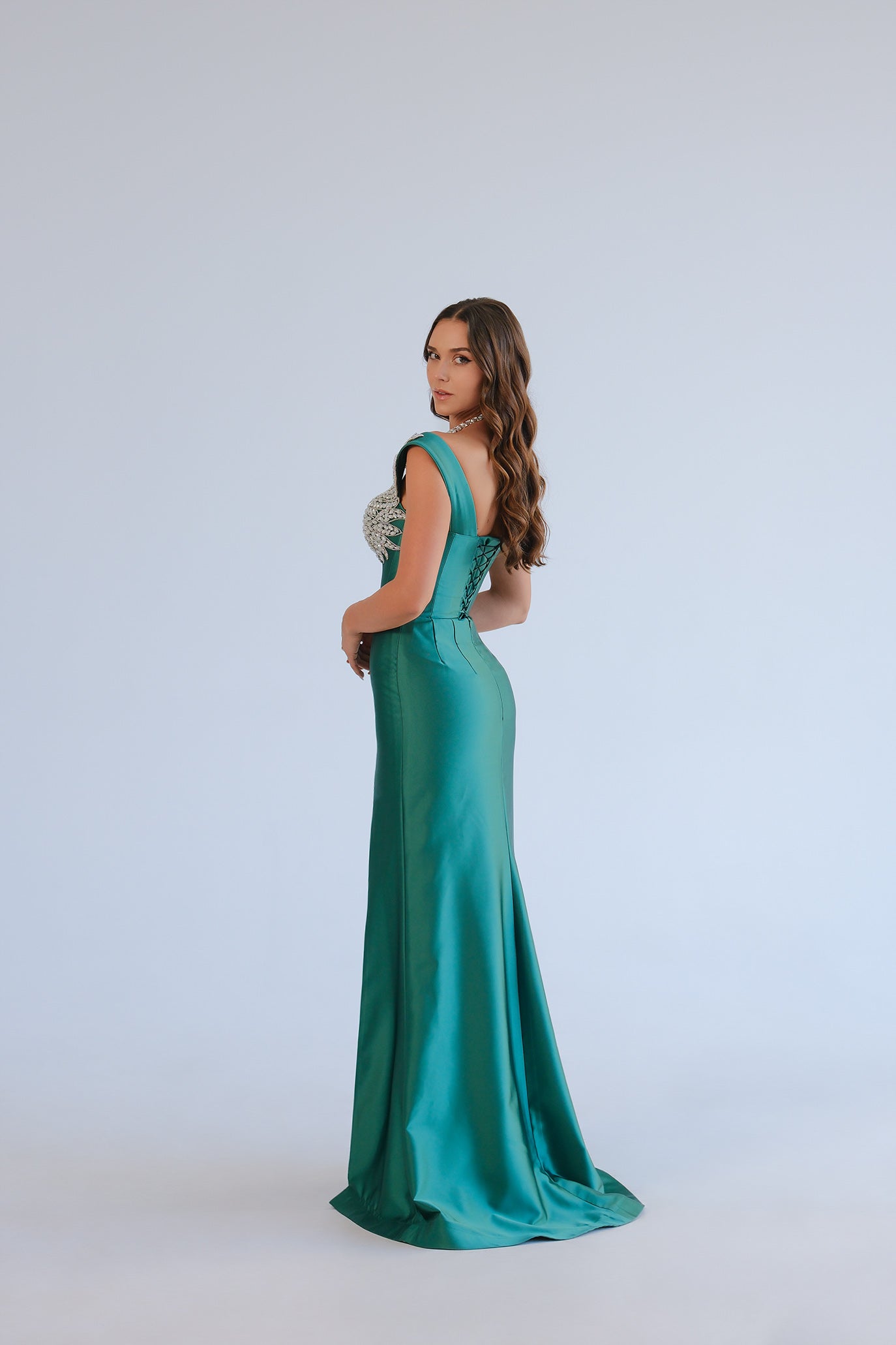 Вечерна рокля с изваяна корсетна горна част и широки презрамки, богато украсени с ръчно нашити кристали и пайети, които оформят ефектен 3D мотив около деколтето. Стегнатата талия преминава в дълга, прилепнала пола с висока цепка отпред за елегантен и издължен силует. Корсетът е със вградени банели и подплатени чашки за стабилност и поддръжка, а връзките на гърба позволяват прецизно напасване към фигурата. Материята е сатен с мек блясък; роклята е изцяло подплатена и не прозира. Продуктът пристига в персонализиран калъф за съхранение.