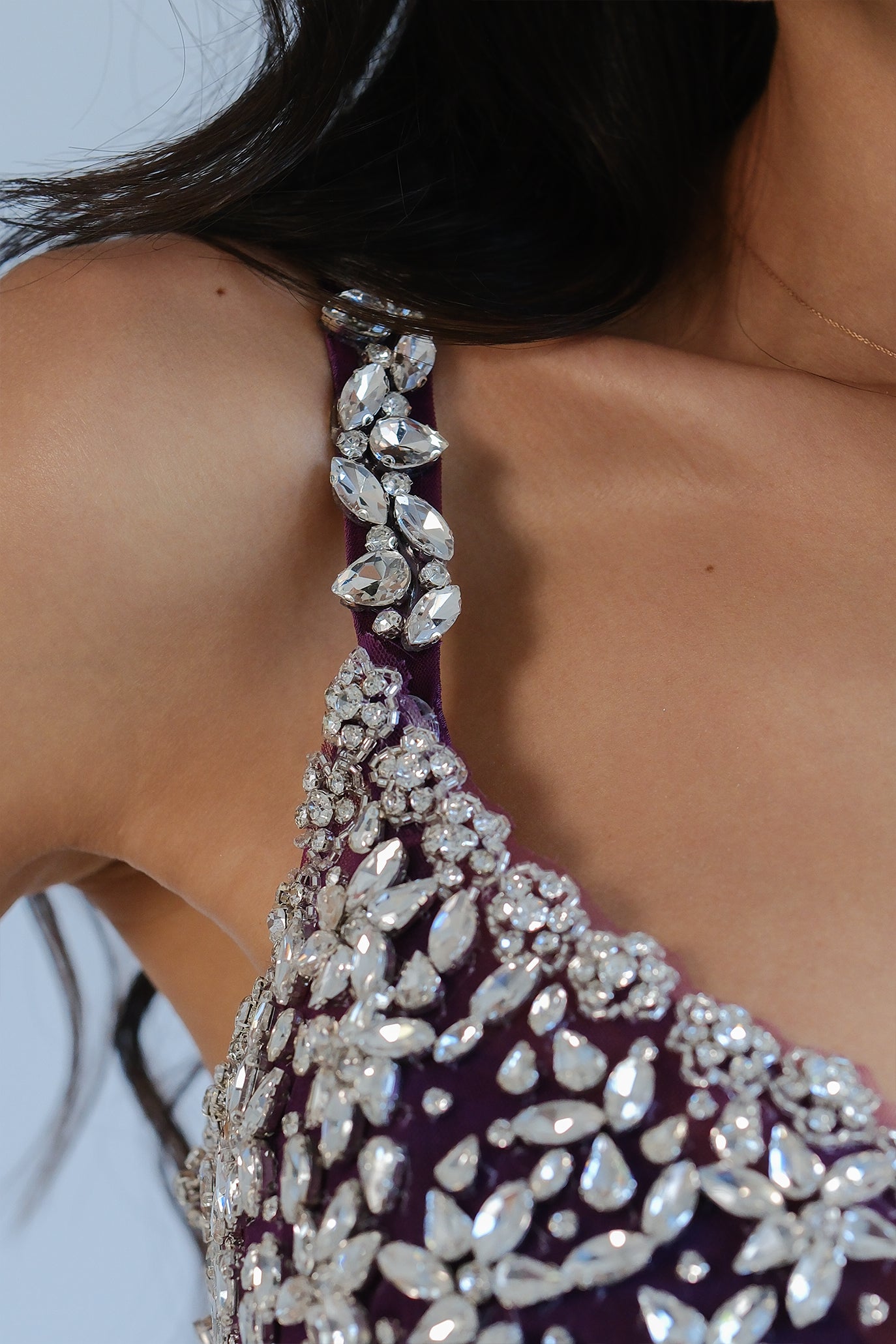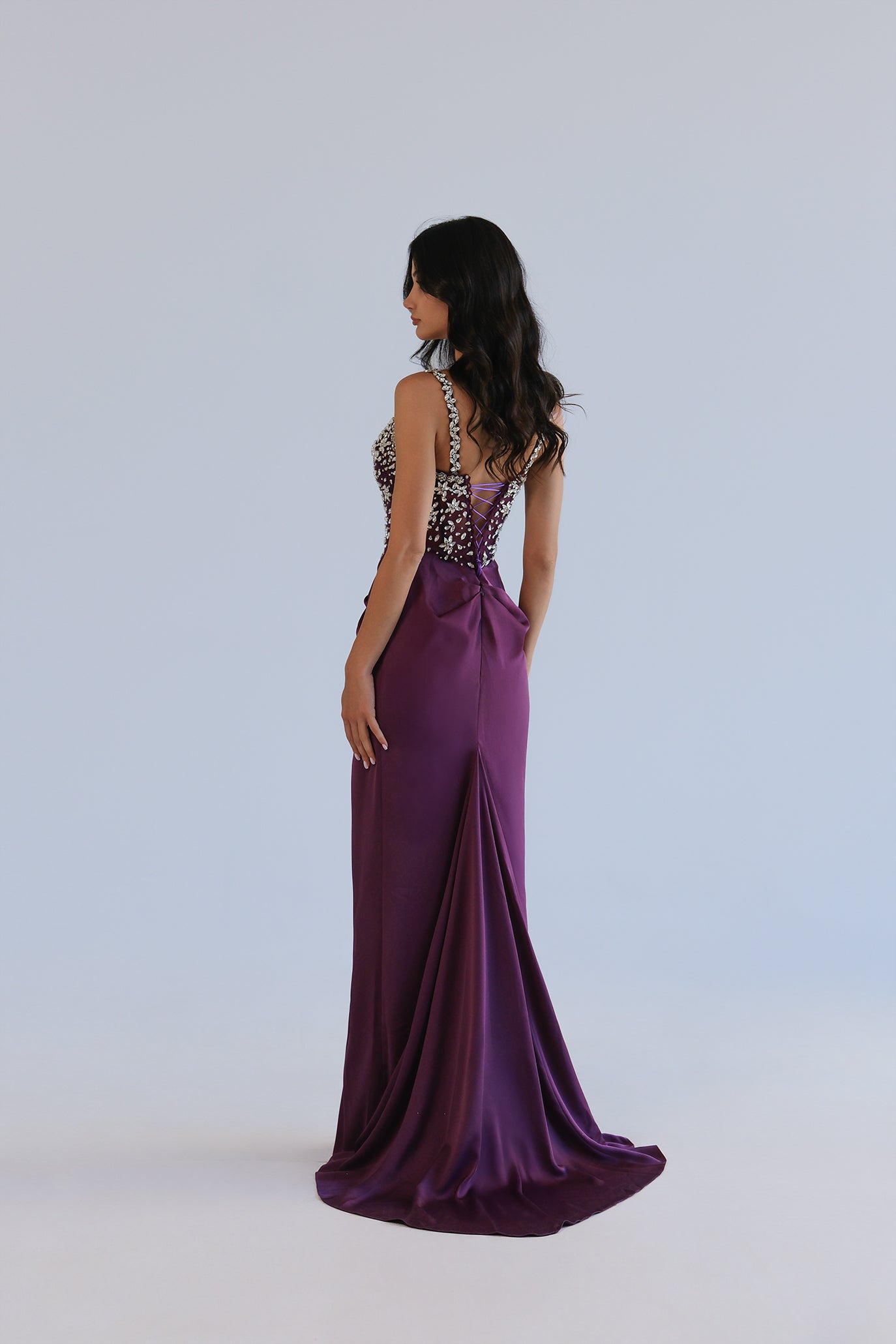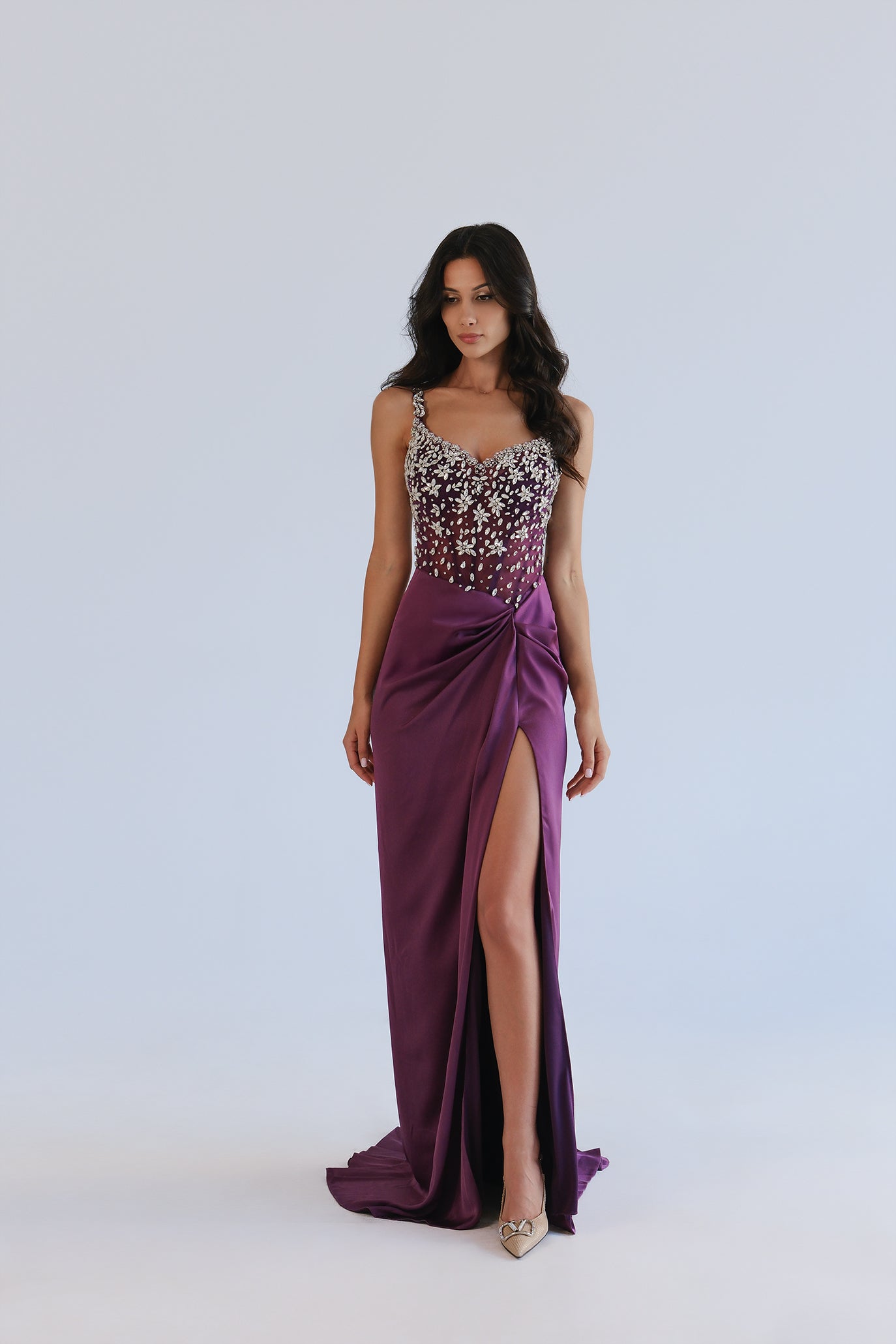 Елегантна дълга вечерна рокля с изваяна линия и висока цепка. Горната част е корсетна – богато декорирана с кристали и камъни във флорални мотиви, с искрящи презрамки и вградени чашки за сигурна поддръжка. С деколте, подчертаващо бюста. Полата е от фин сатен с красив драпаж по бедрото, прилепнала по тялото и завършваща с лек шлейф за ефектно падане. Продуктът пристига в персонализиран калъф.