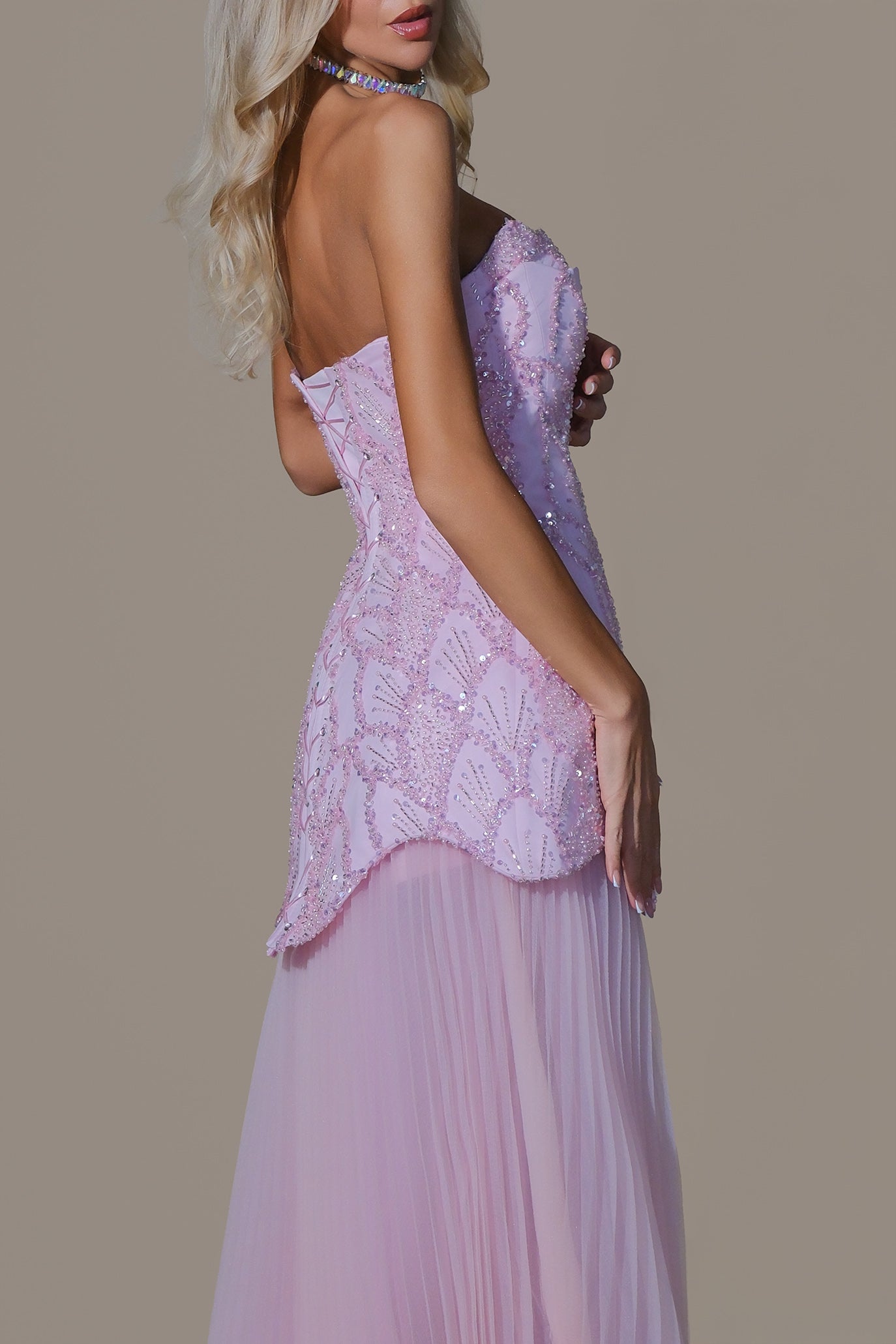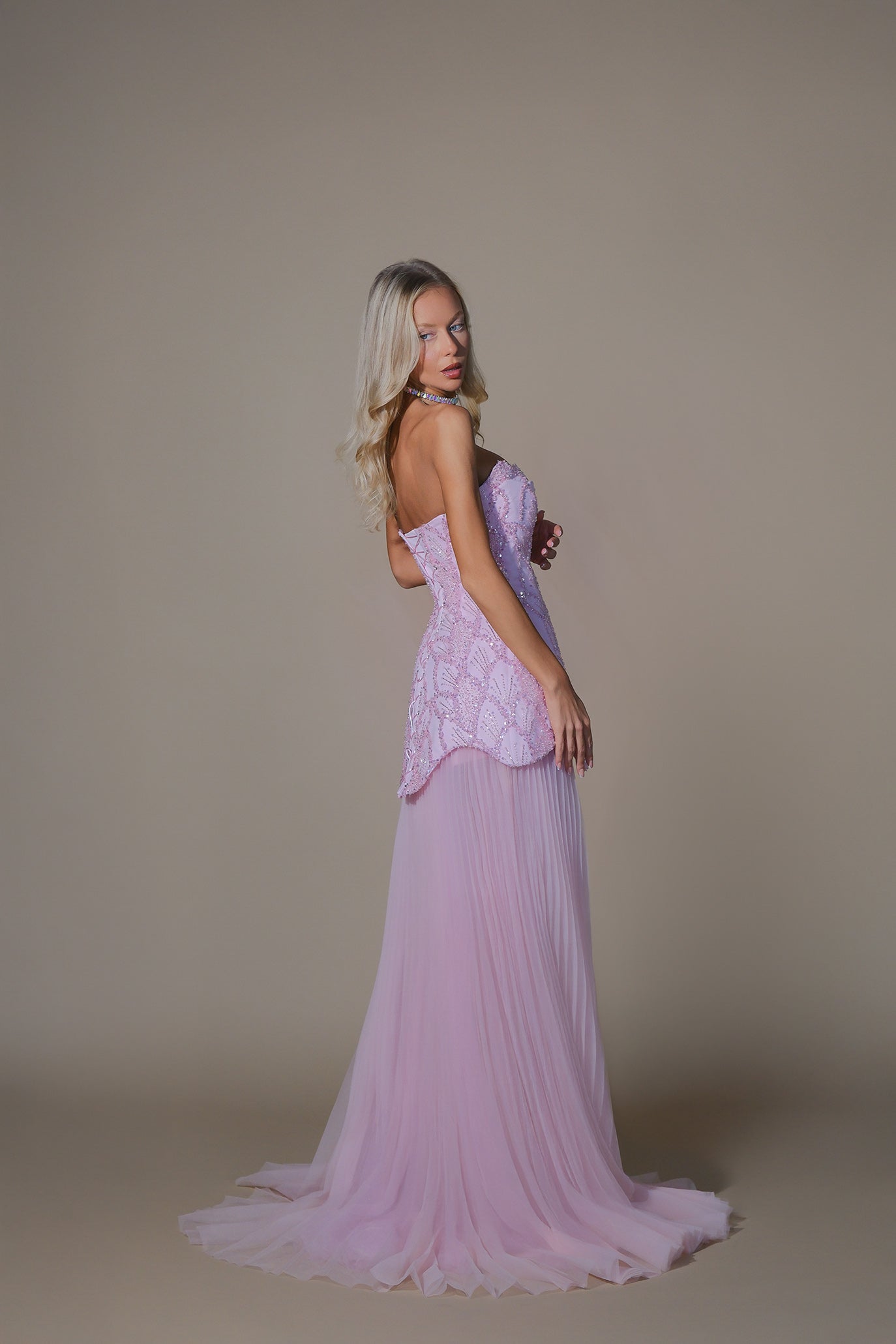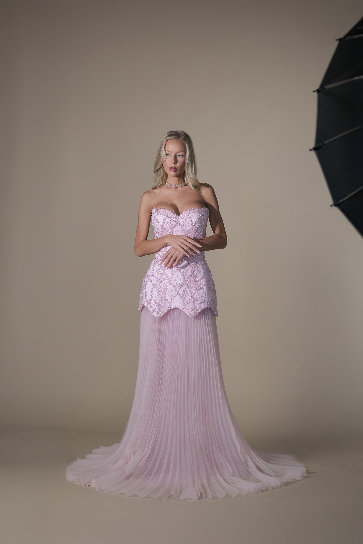 Впечатляваща вечерна рокля, изцяло ръчно изработена. Моделът е с дължина до пода и силует русалка, който елегантно издължава фигурата. Горната част е корсет със сърцевидно деколте, нестандартна издължена форма и връзки на гърба, които осигуряват перфектно прилягане към тялото. Оформя талията и придава стабилност. Върху ханша пада асиметричен пеплум с лек обем. Долната част е оформена в свободна пола от полупрозрачен плисиран тюл, създаващ ефект на движение.