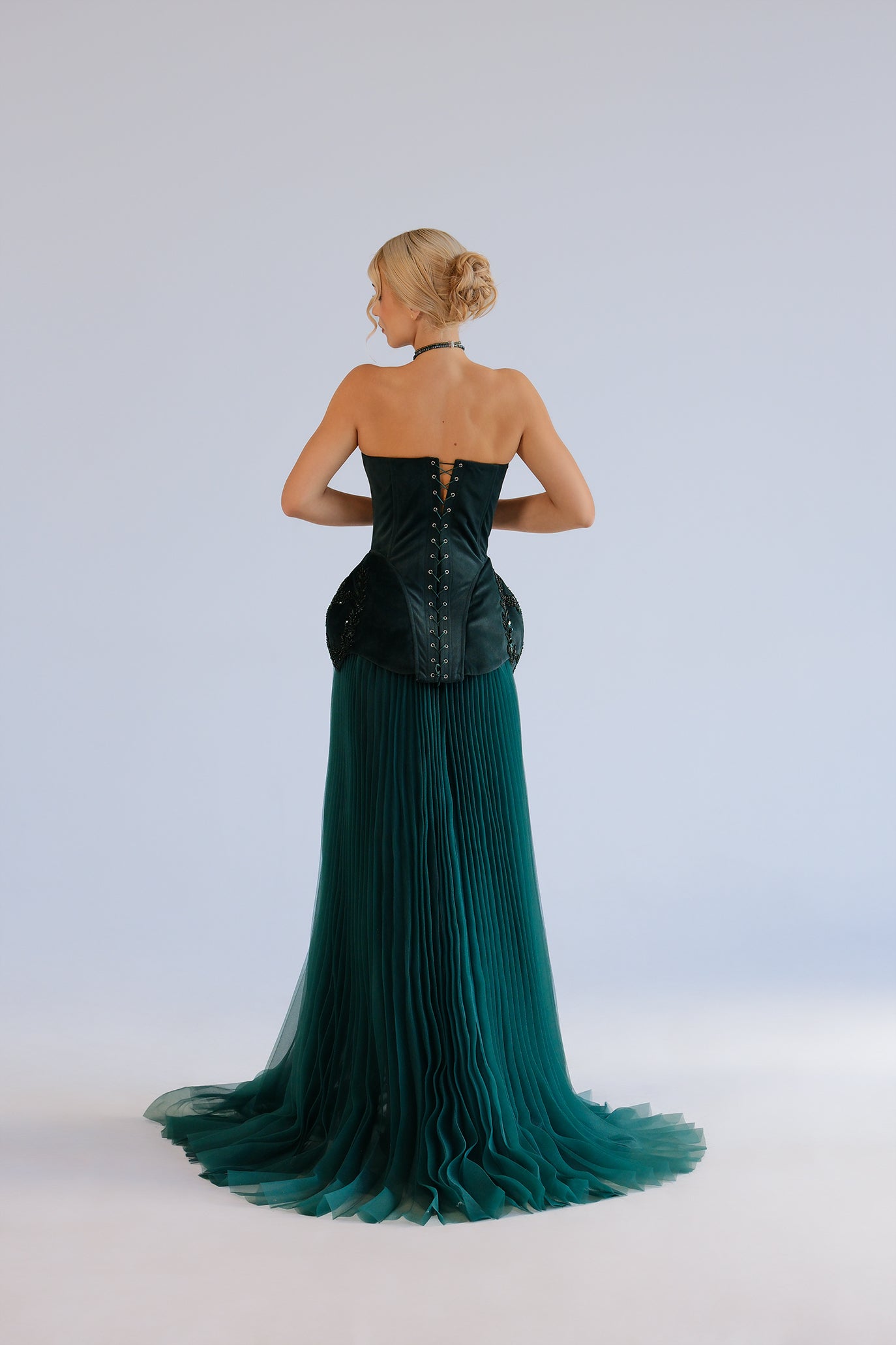 Впечатляваща вечерна рокля, изцяло ръчно изработена. Моделът е с дължина до пода и силует русалка, който елегантно издължава фигурата. Горната част е корсет със сърцевидно деколте, нестандартна издължена форма и връзки на гърба, които осигуряват перфектно прилягане към тялото. Оформя талията и придава стабилност. Върху ханша пада асиметричен пеплум с лек обем. Долната част е оформена в свободна пола от полупрозрачен плисиран тюл, създаващ ефект на движение.