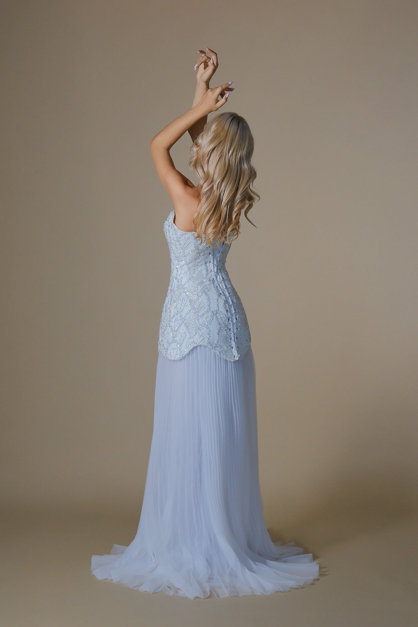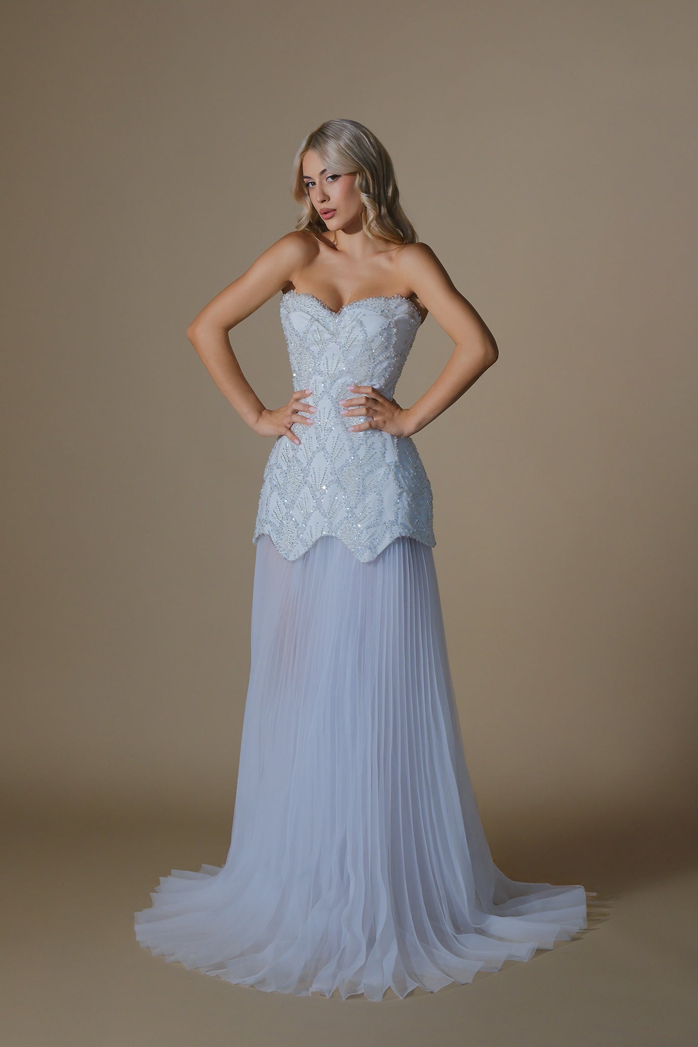 Впечатляваща вечерна рокля, изцяло ръчно изработена. Моделът е с дължина до пода и силует русалка, който елегантно издължава фигурата. Горната част е корсет със сърцевидно деколте, нестандартна издължена форма и връзки на гърба, които осигуряват перфектно прилягане към тялото. Оформя талията и придава стабилност. Върху ханша пада асиметричен пеплум с лек обем. Долната част е оформена в свободна пола от полупрозрачен плисиран тюл, създаващ ефект на движение.