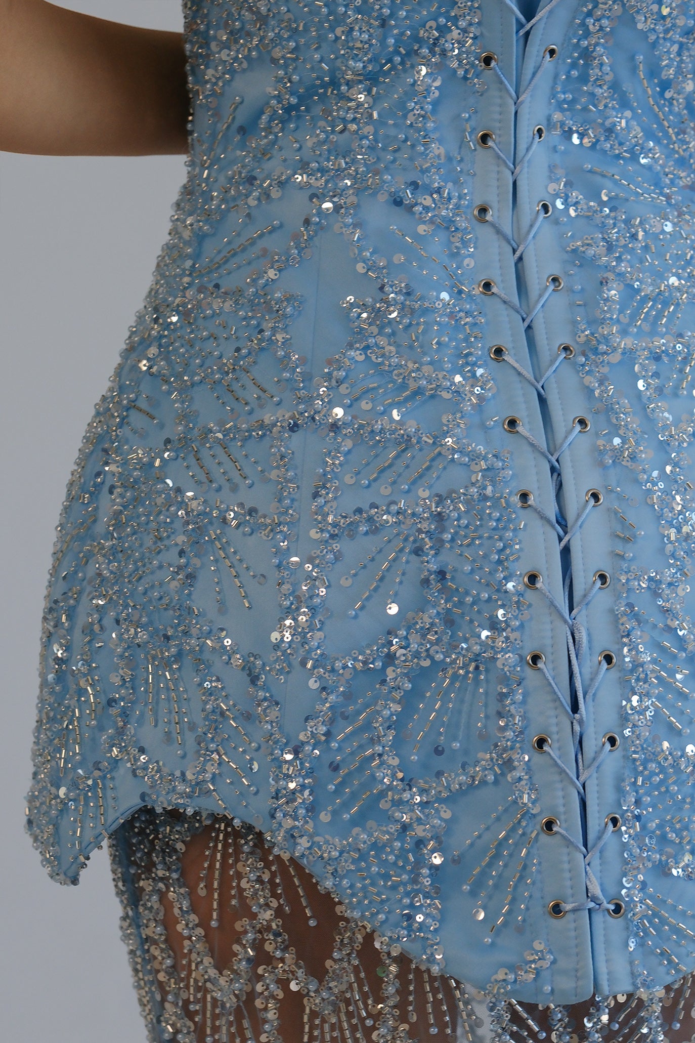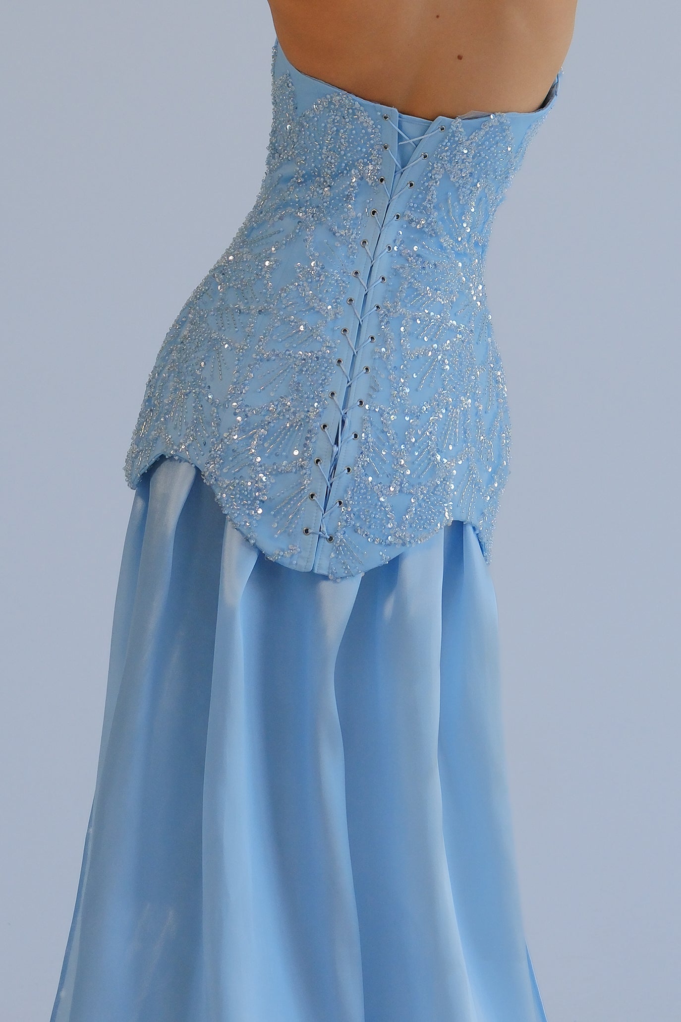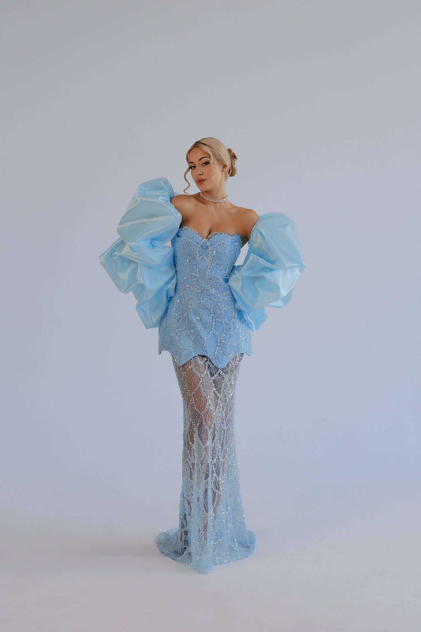 Впечатляваща вечерна рокля, изцяло ръчно изработена. Моделът е с дължина до пода и силует русалка, който елегантно издължава фигурата. Горната част е корсет със сърцевидно деколте, нестандартна издължена форма и връзки на гърба, които осигуряват перфектно прилягане към тялото. Оформя талията и придава стабилност. Върху ханша пада асиметричен пеплум с лек обем. Долната част е оформена в свободна пола от блестящ полупрозрачен плат, създаващ ефект на движение и блясък. Към роклята може да се добавят обемни ефектни ръкави и шлейф.