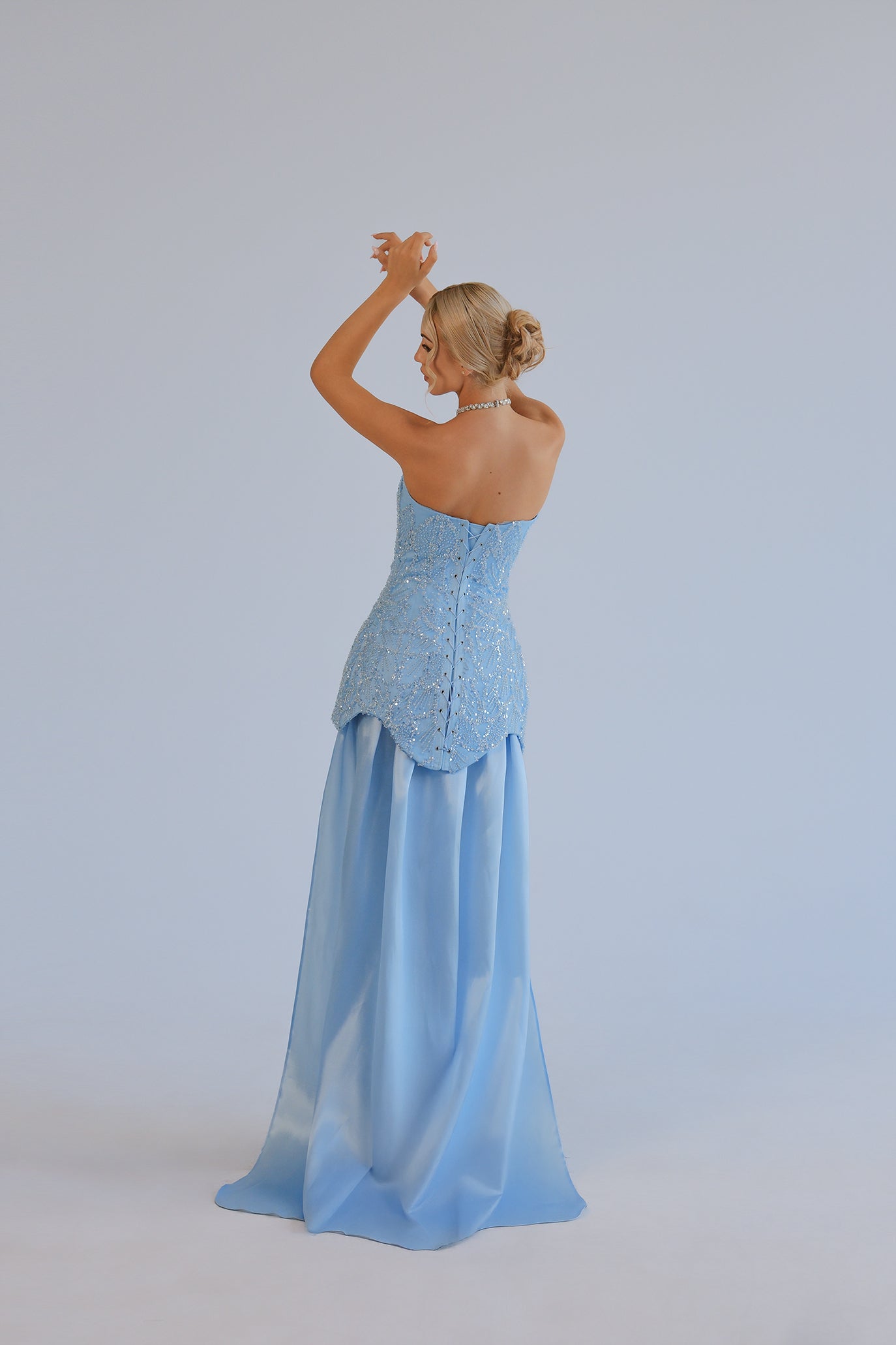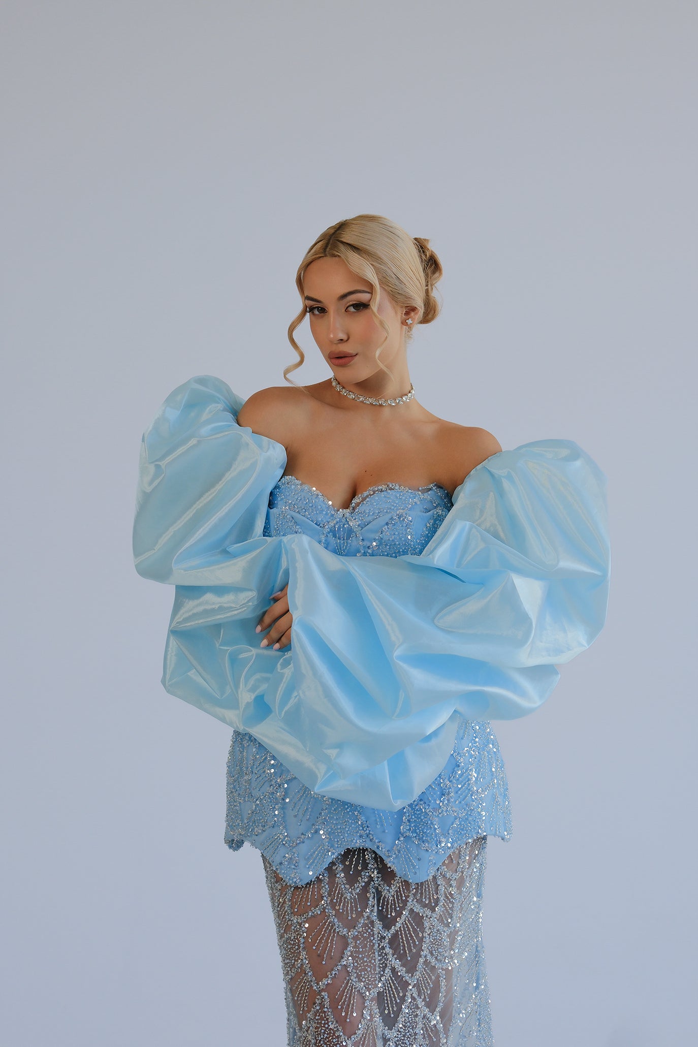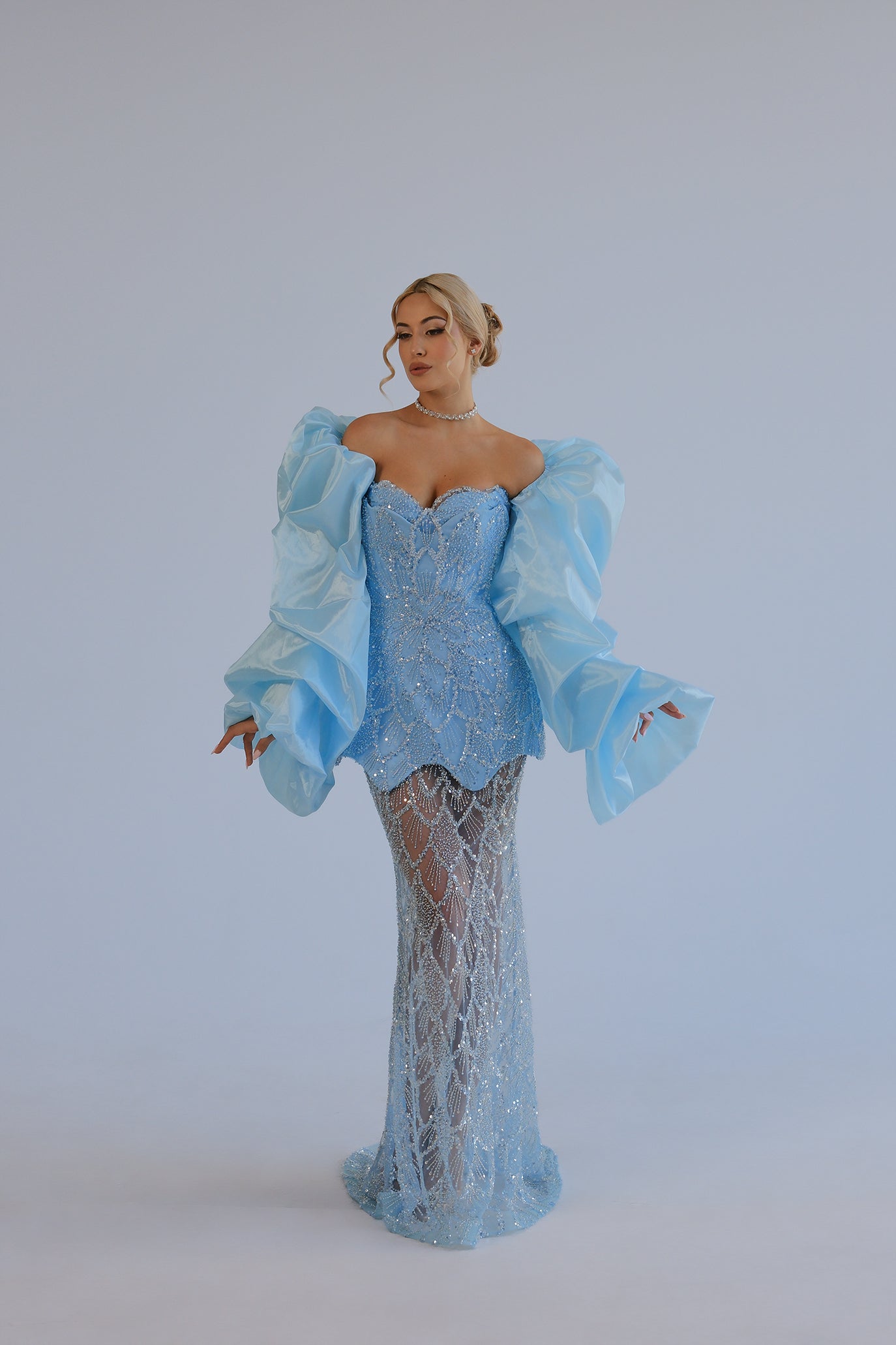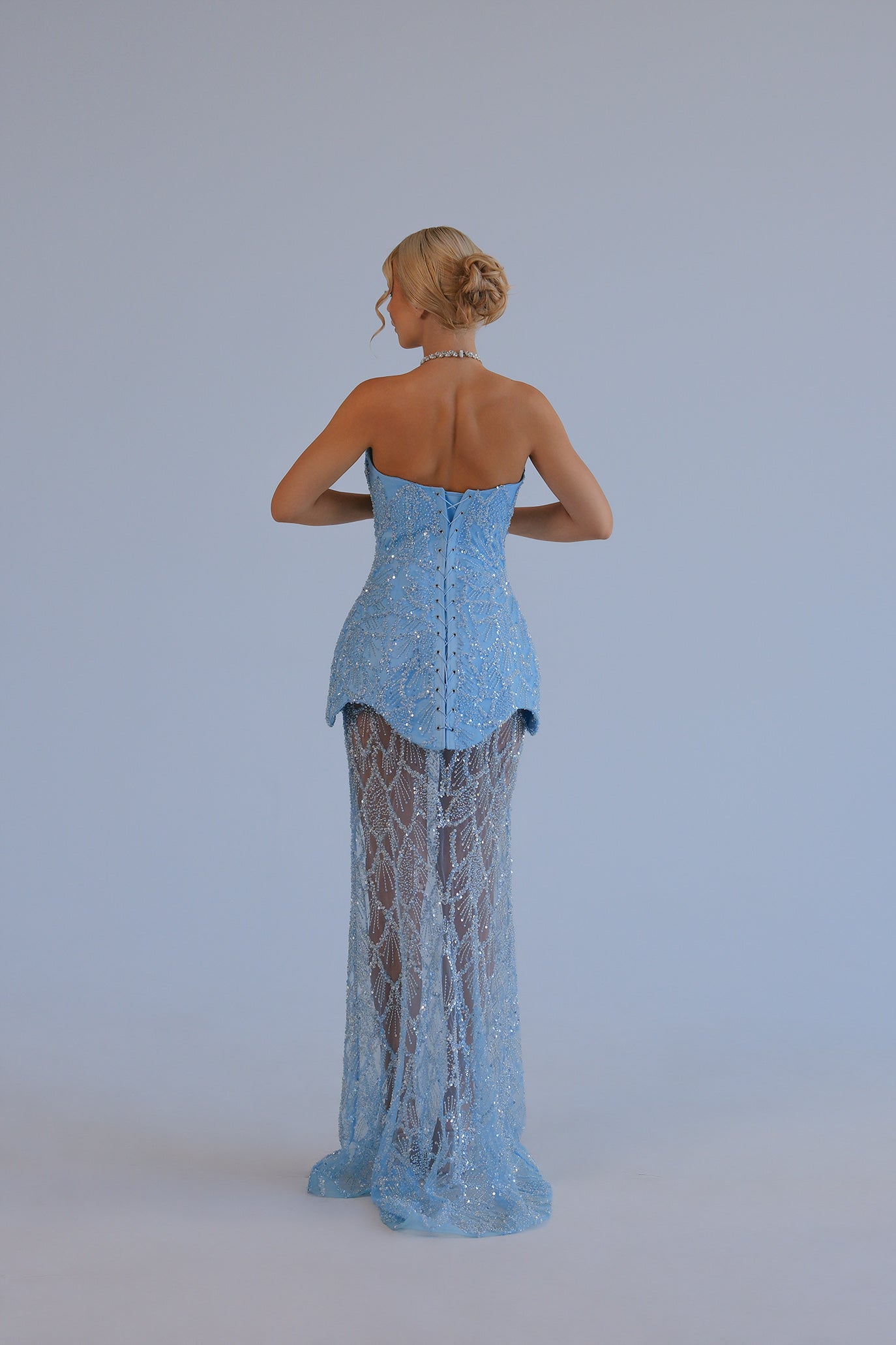 Впечатляваща вечерна рокля, изцяло ръчно изработена. Моделът е с дължина до пода и силует русалка, който елегантно издължава фигурата. Горната част е корсет със сърцевидно деколте, нестандартна издължена форма и връзки на гърба, които осигуряват перфектно прилягане към тялото. Оформя талията и придава стабилност. Върху ханша пада асиметричен пеплум с лек обем. Долната част е оформена в свободна пола от блестящ полупрозрачен плат, създаващ ефект на движение и блясък. Към роклята може да се добавят обемни ефектни ръкави и шлейф.