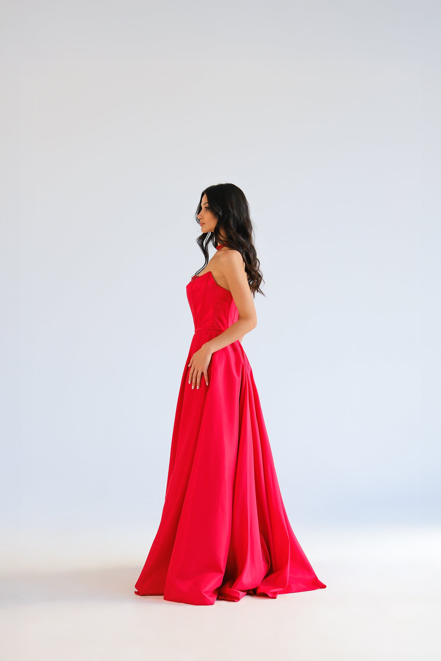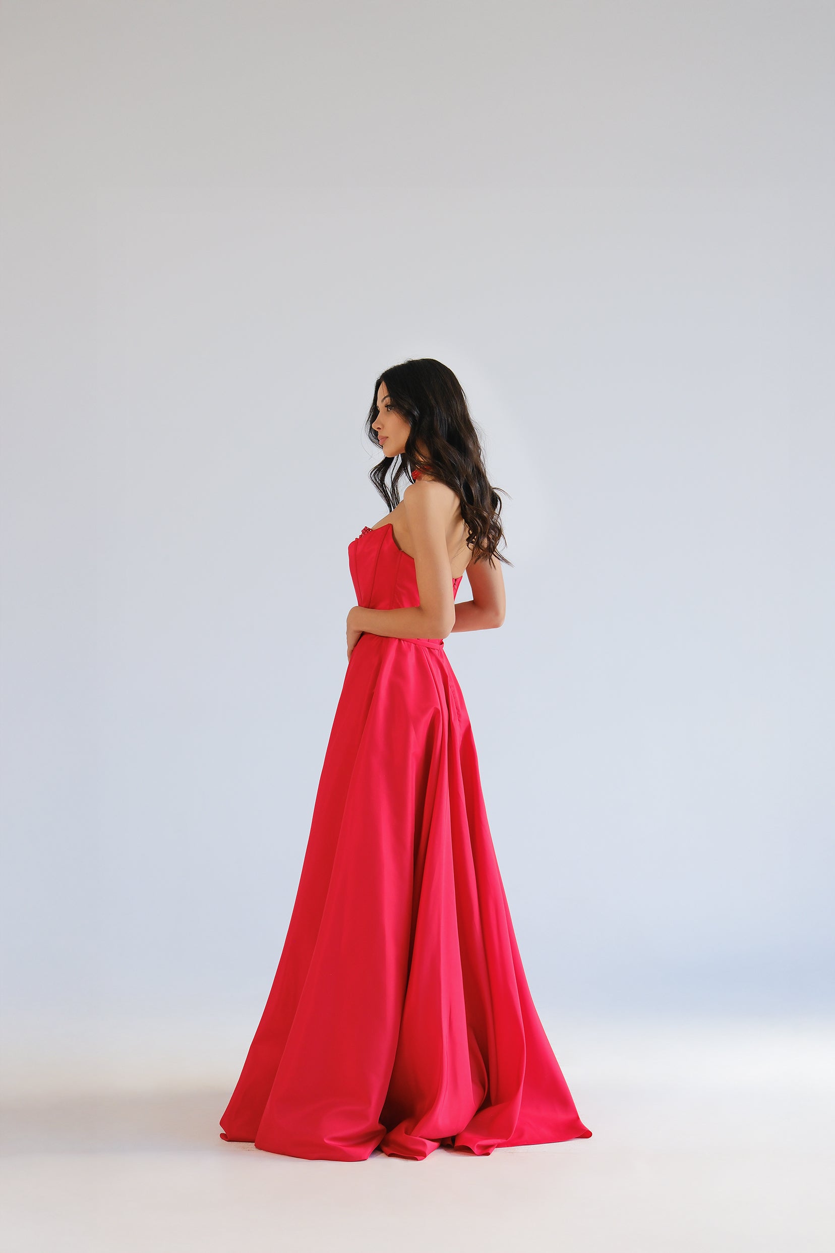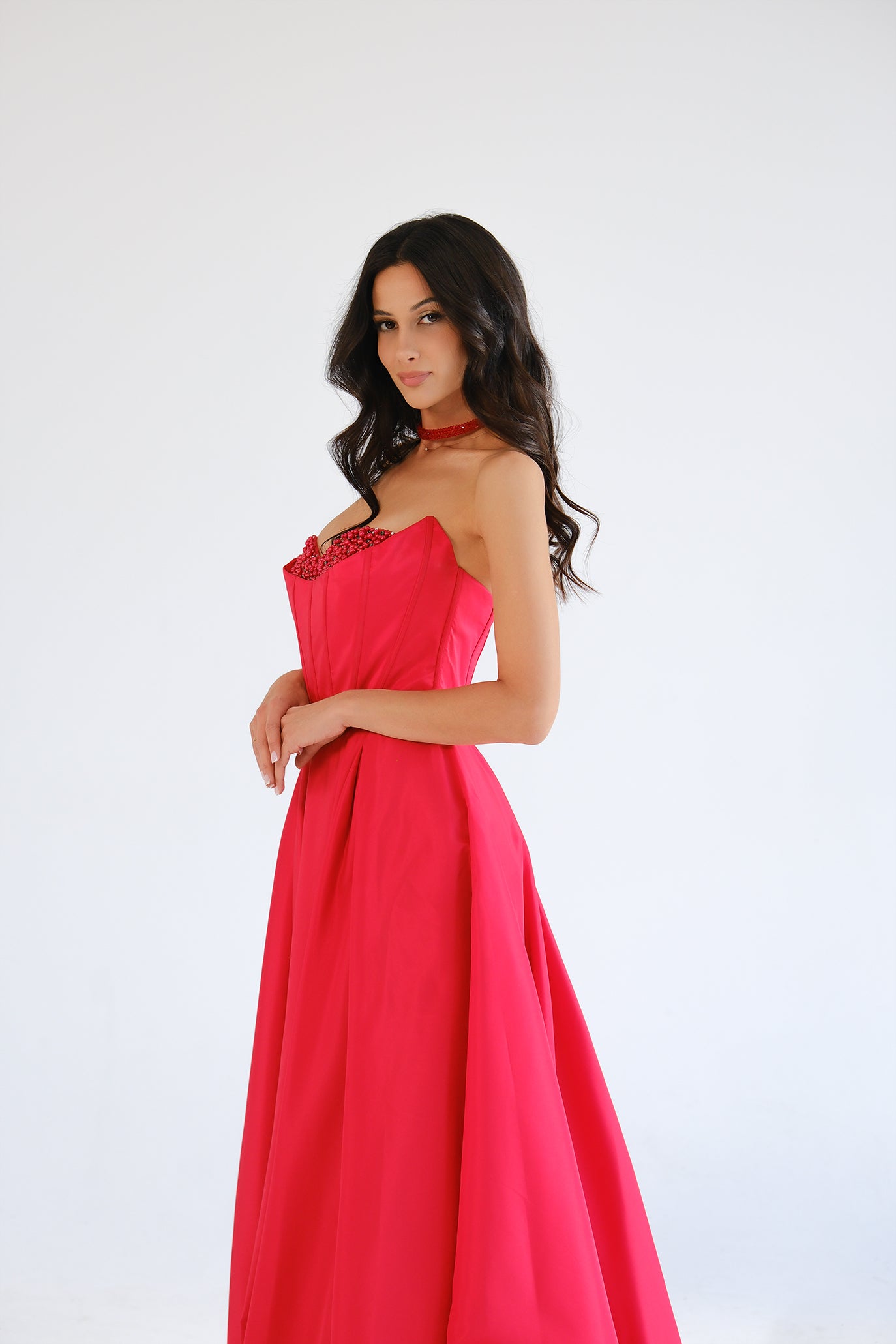Елегантна дълга бална рокля без презрамки със сърцевидно деколте. Горната част е корсетна с фини банели за перфектна стойка и е богато декорирана с мъниста и кристали по чашките за изискан блясък. Талията е подчертана, а полата пада в обемна А-линия и деликатен шлейф за впечатляваща силуетна линия. Продуктът пристига в персонализиран калъф.
