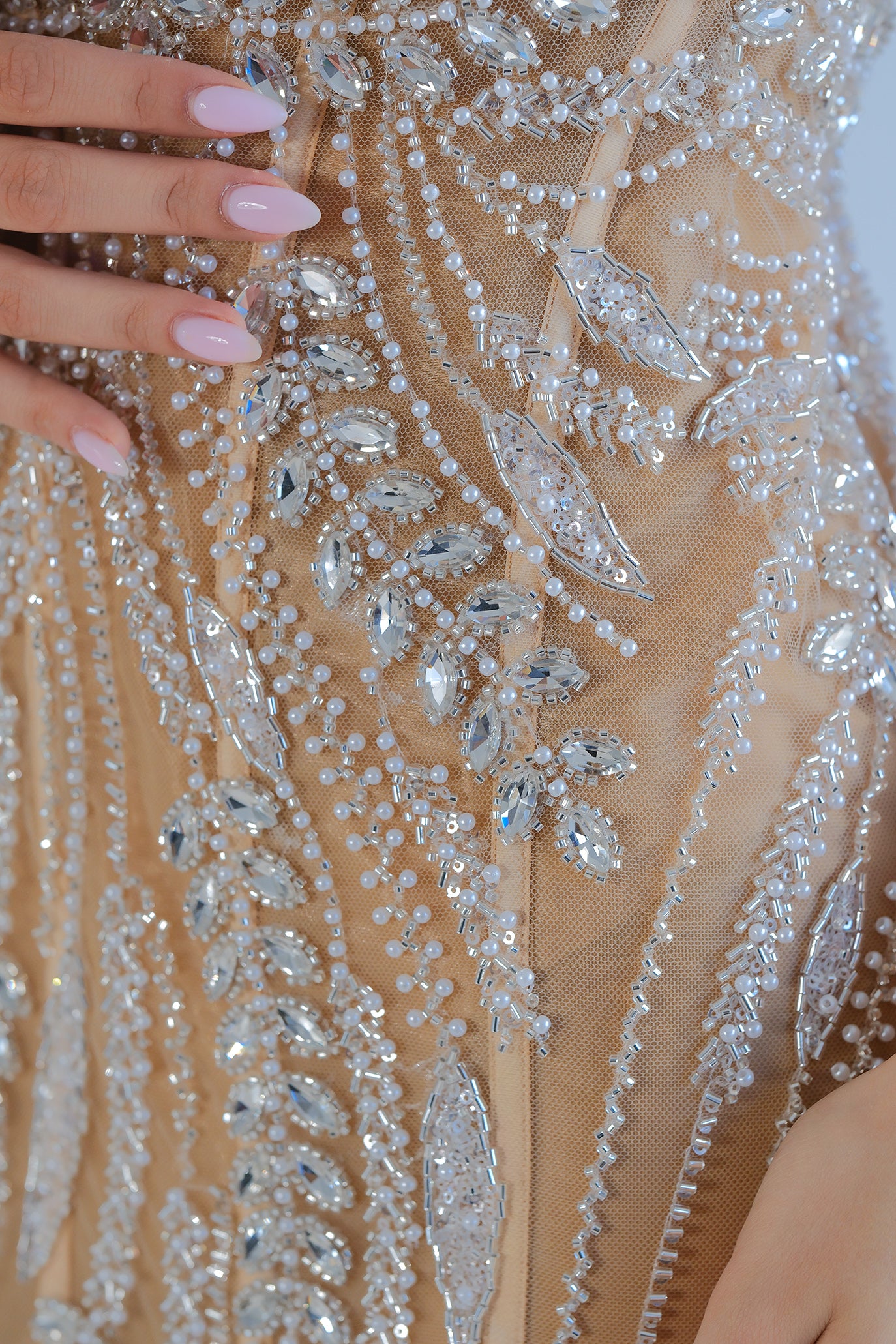 Блясък при всяко движение - това е рокля Alma. С мека подплата, която стига малко над средата на бедрото за комфортно усещане през цялата вечер. Горният пласт на роклята е полупрозрачен мрежест плат с изящни флорални блестящи детайли. Роклята е изключително удобна за носене и поради наличието на презрамки, регулиращи се връзки отзад на гърба и вградените чашки.