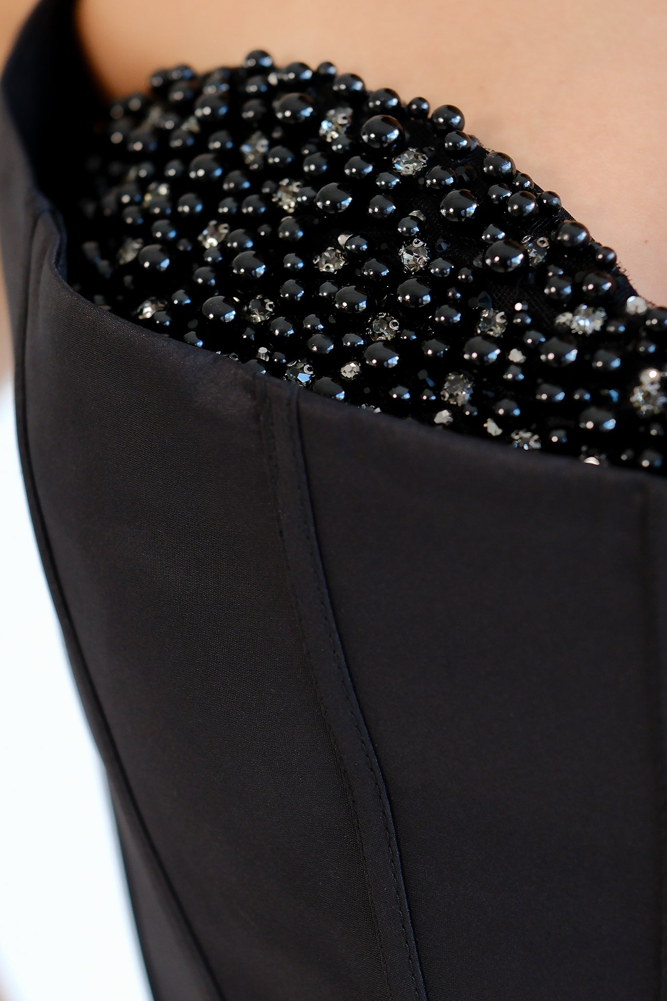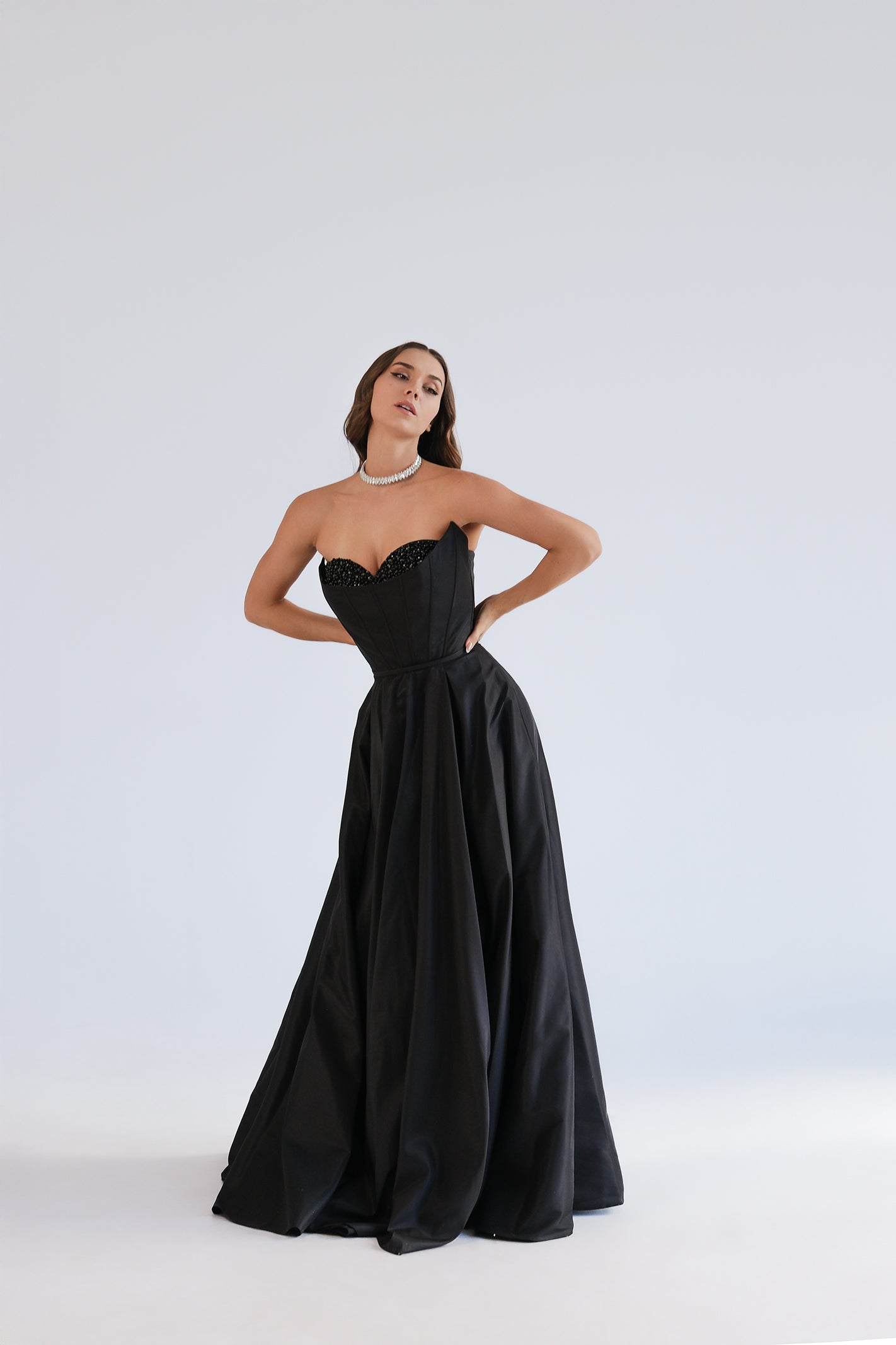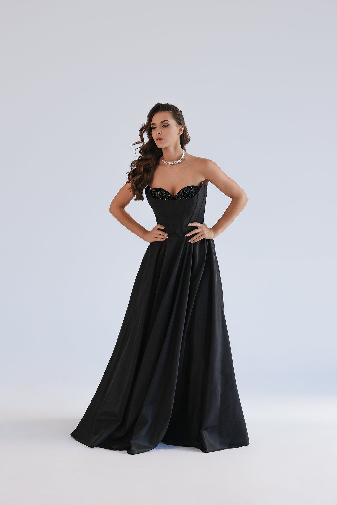 Елегантна дълга бална рокля без презрамки със сърцевидно деколте. Горната част е корсетна с фини банели за перфектна стойка и е богато декорирана с мъниста и кристали по чашките за изискан блясък. Талията е подчертана, а полата пада в обемна А-линия и деликатен шлейф за впечатляваща силуетна линия. Продуктът пристига в персонализиран калъф.