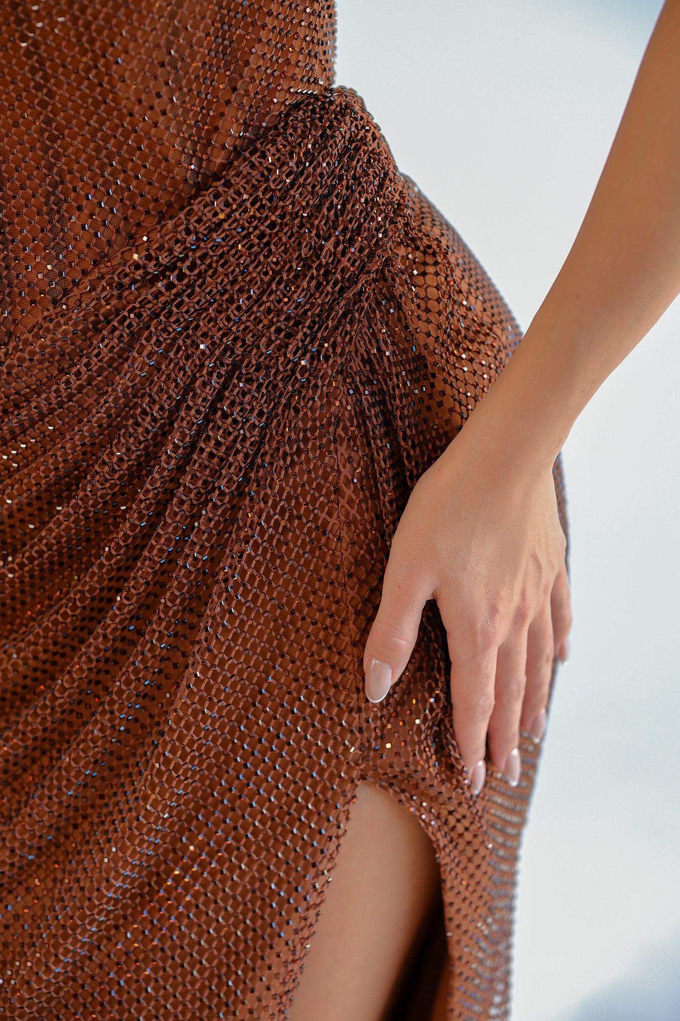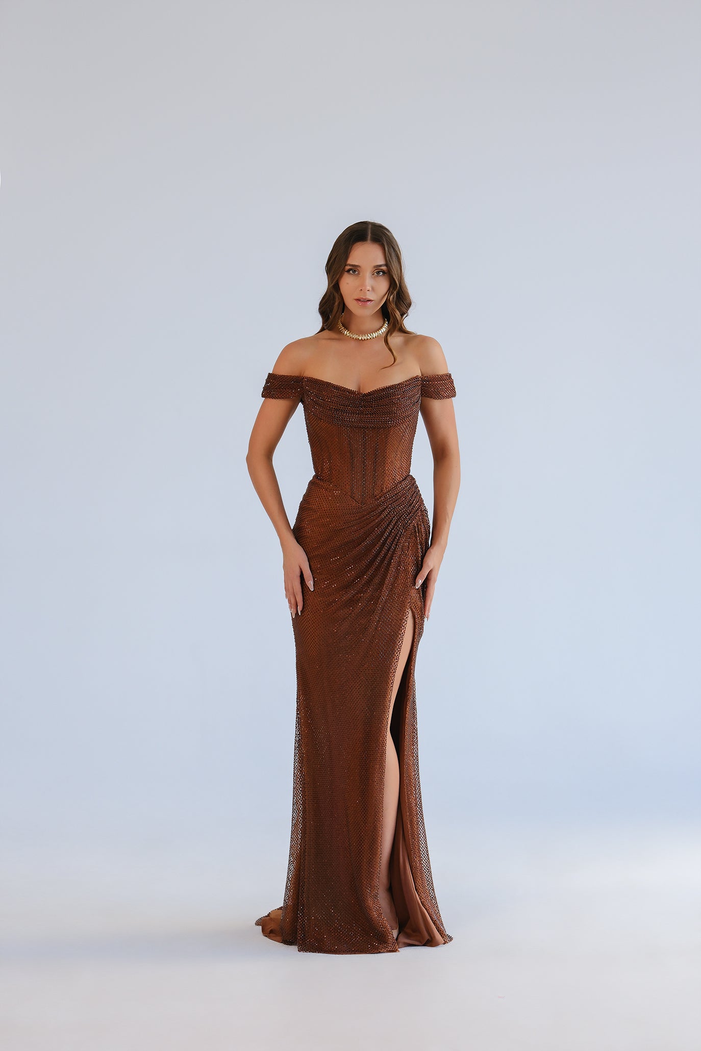 Елегантна дълга вечерна рокля с падащи off-shoulder ръкави и красиво надиплена горна част. Талията е оформена с деликатен полупрозрачен корсет, който подчертава силуета. Полата е по тялото с висока цепка отпред и лек шлейф за ефектна линия. Моделът е изработен от материя, богато обсипана с микропайети, които придават интензивен блясък. Вградени чашки и лека подплата за стабилност и комфорт. Продуктът пристига в персонализиран калъф.