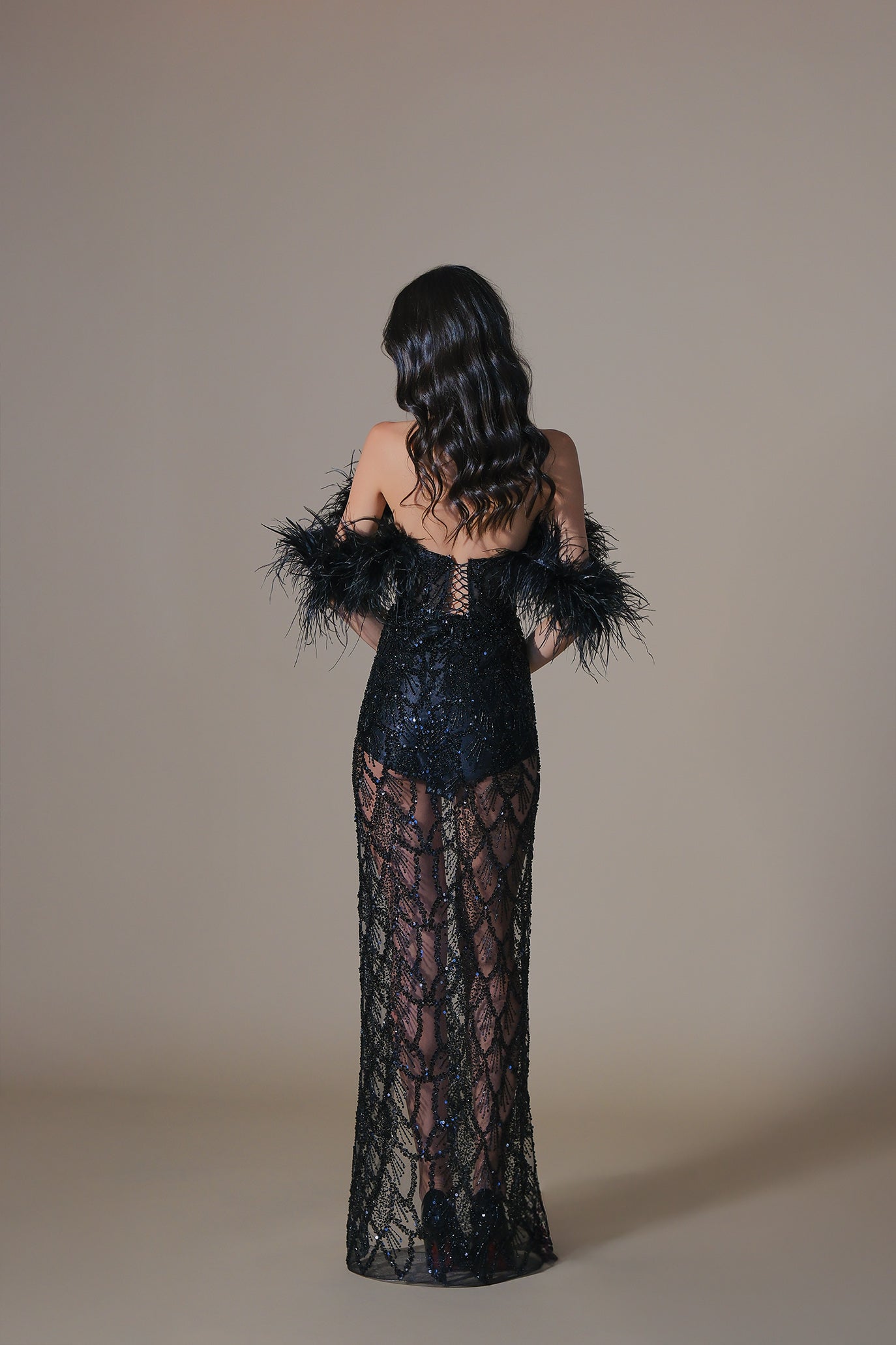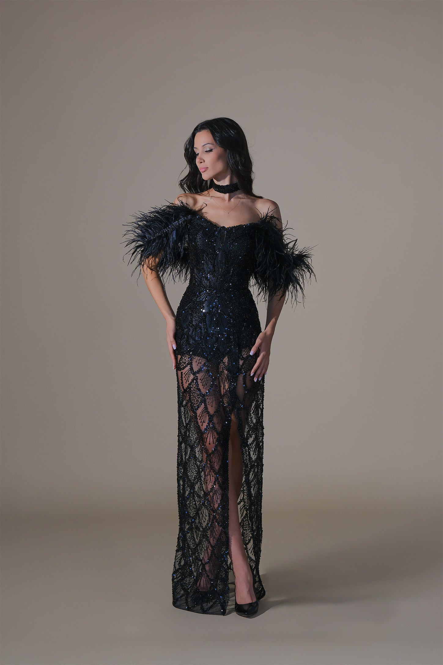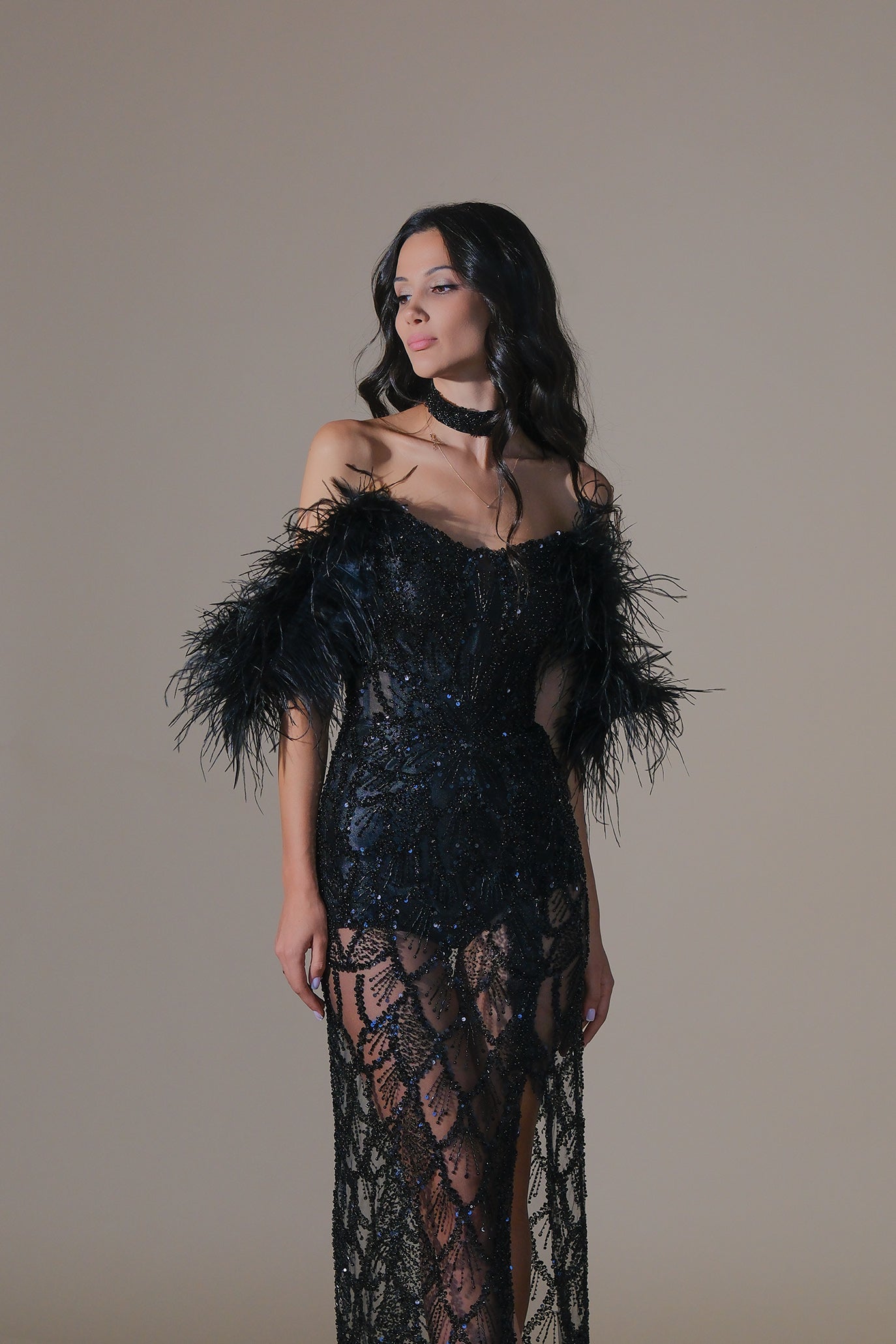 Впечатляваща вечерна рокля с ефектно паднало рамо от обемни пера, които подчертават линията на деколтето. Горната част е тип корсет със сърцевидно деколте, който оформя талията и осигурява стабилност. Цялата рокля е изработена от специален плат, бродиран с черни кристали и пайети. Полата е дълга до пода със смела висока цепка, а отдолу има мини подплата/боди за комфорт и прикритие без да се губи „nude“ ефектът.