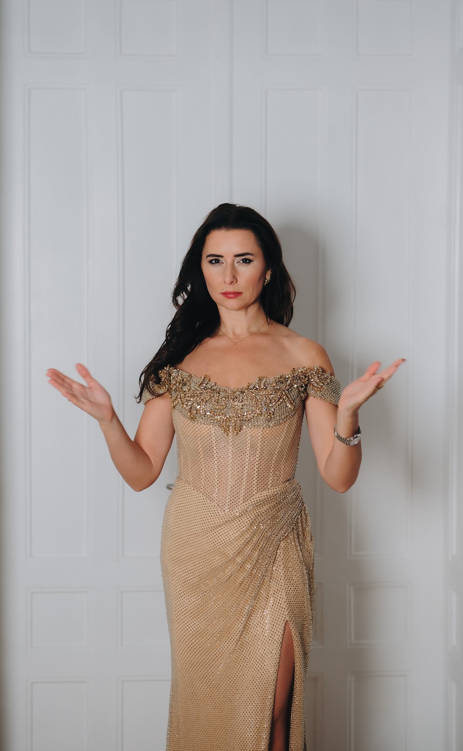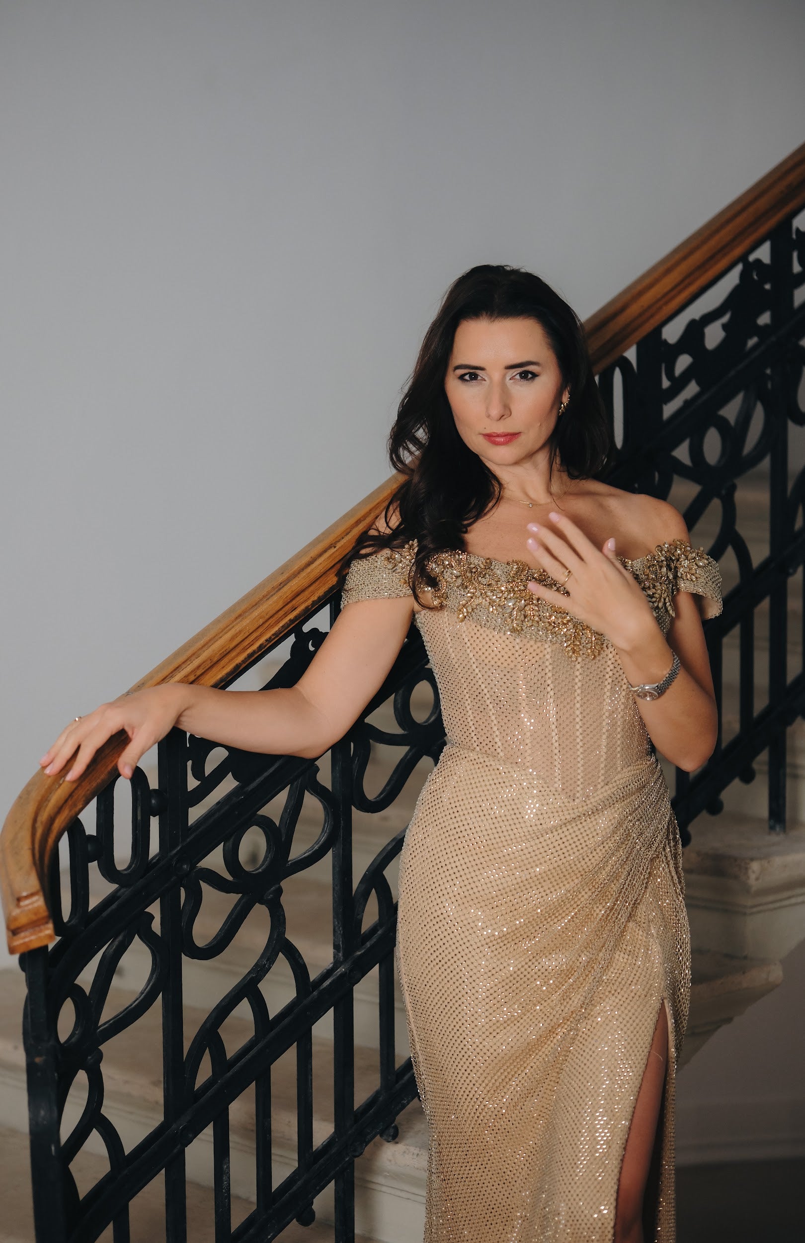 Елегантна дълга вечерна рокля с off-shoulder деколте и изящно декориран корсет. Горната част е полупрозрачна с фини банели и ръчно нашити кристали в златна гама, които преливат като бижу около бюста и раменете. Полата е по тялото с ефектно драпиране на бедрото, висока цепка отпред и лек шлейф за удължен силует. Моделът е изработен от златист плат с микропайети, който дава интензивен блясък и комфорт при движение. Вградени чашки и тънка подплата за стабилност и удобство. Продуктът пристига в персонализиран калъф.