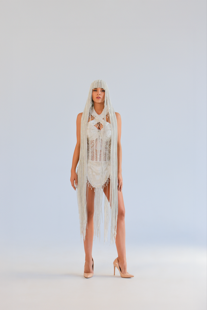 Перука със сребристи кристали и перли. Основа е силиконова и плътно приляга към главата. Към основата са закрепени над 500 кристални и перлени ленти, дълги според ръста на човека - до към средата на прасеца. Това е един от нашите ексклузивни продукти и е любим на чуждестранните ни клиенти.