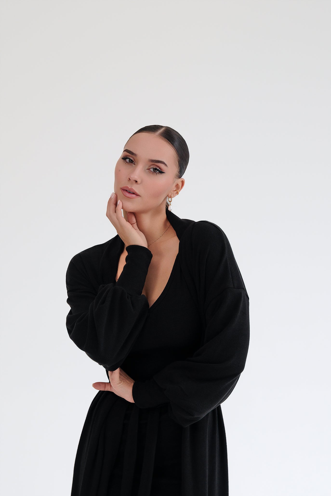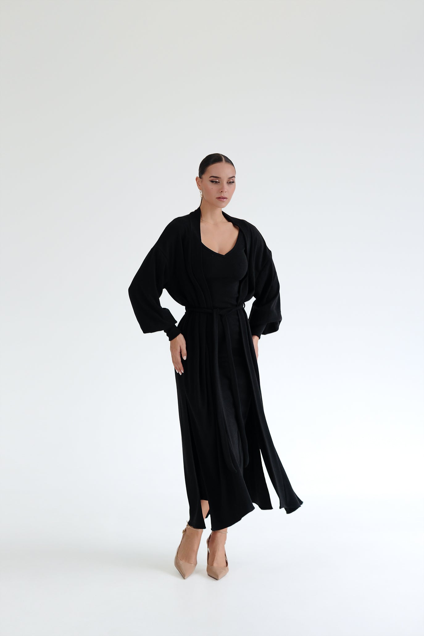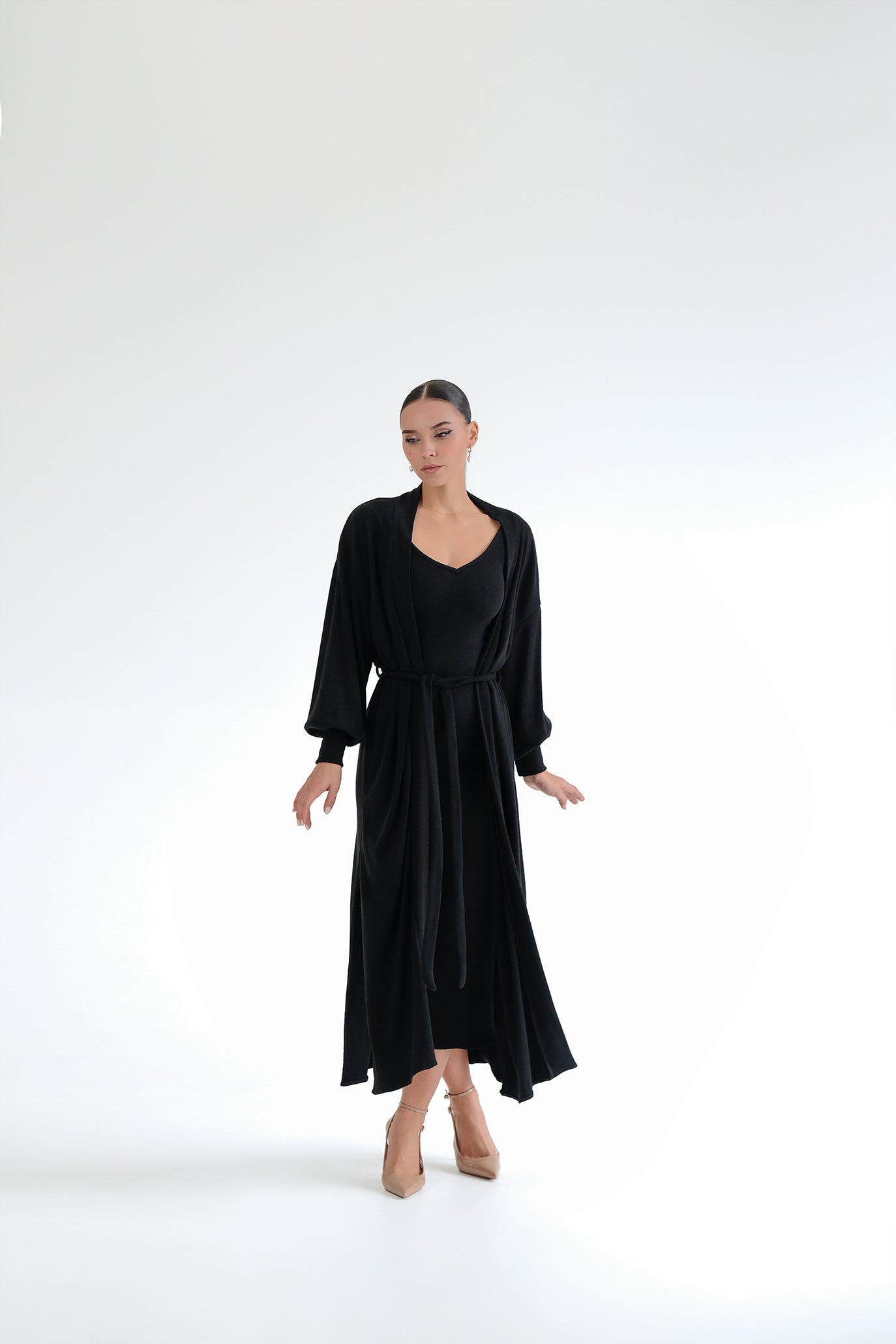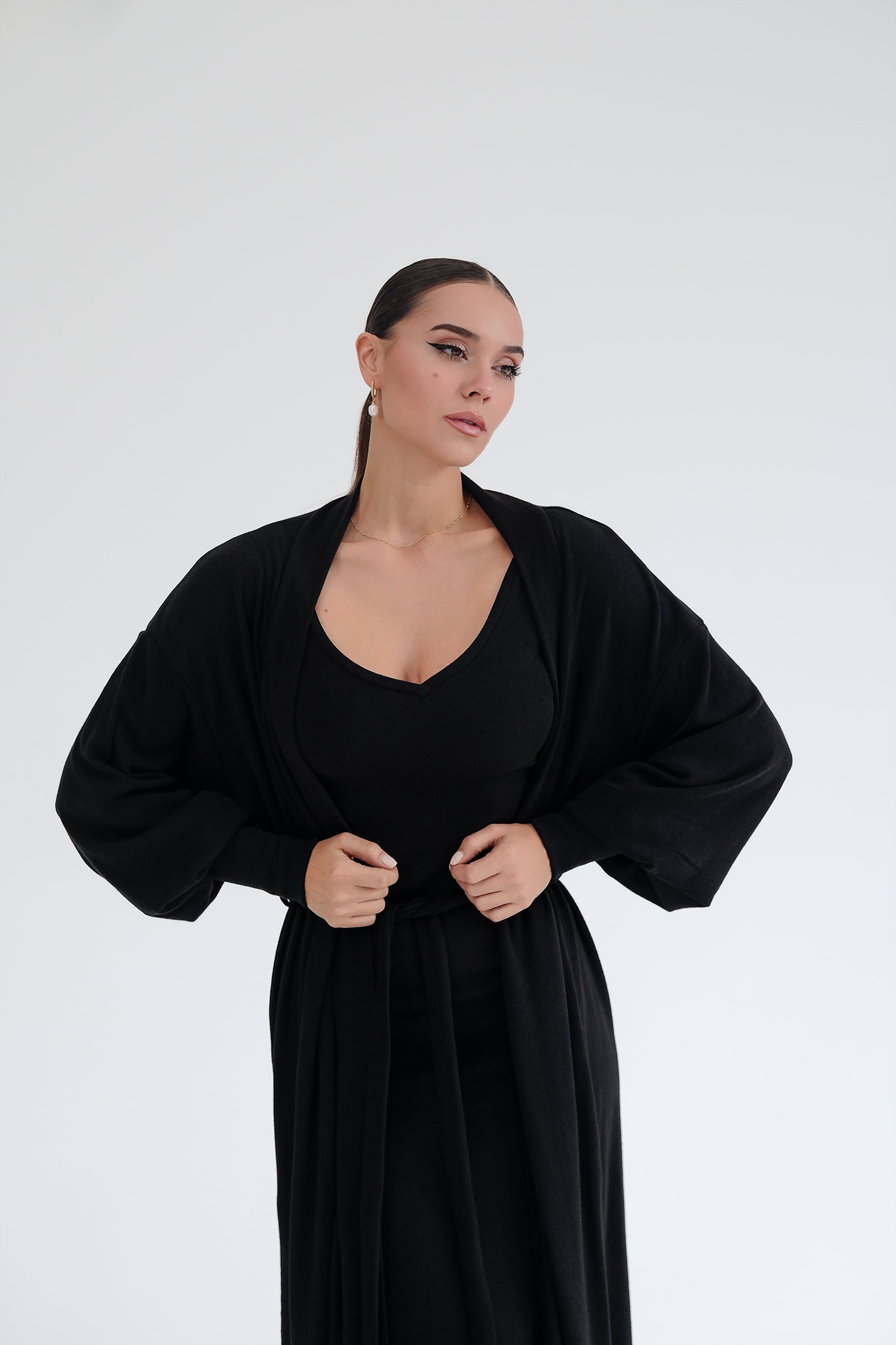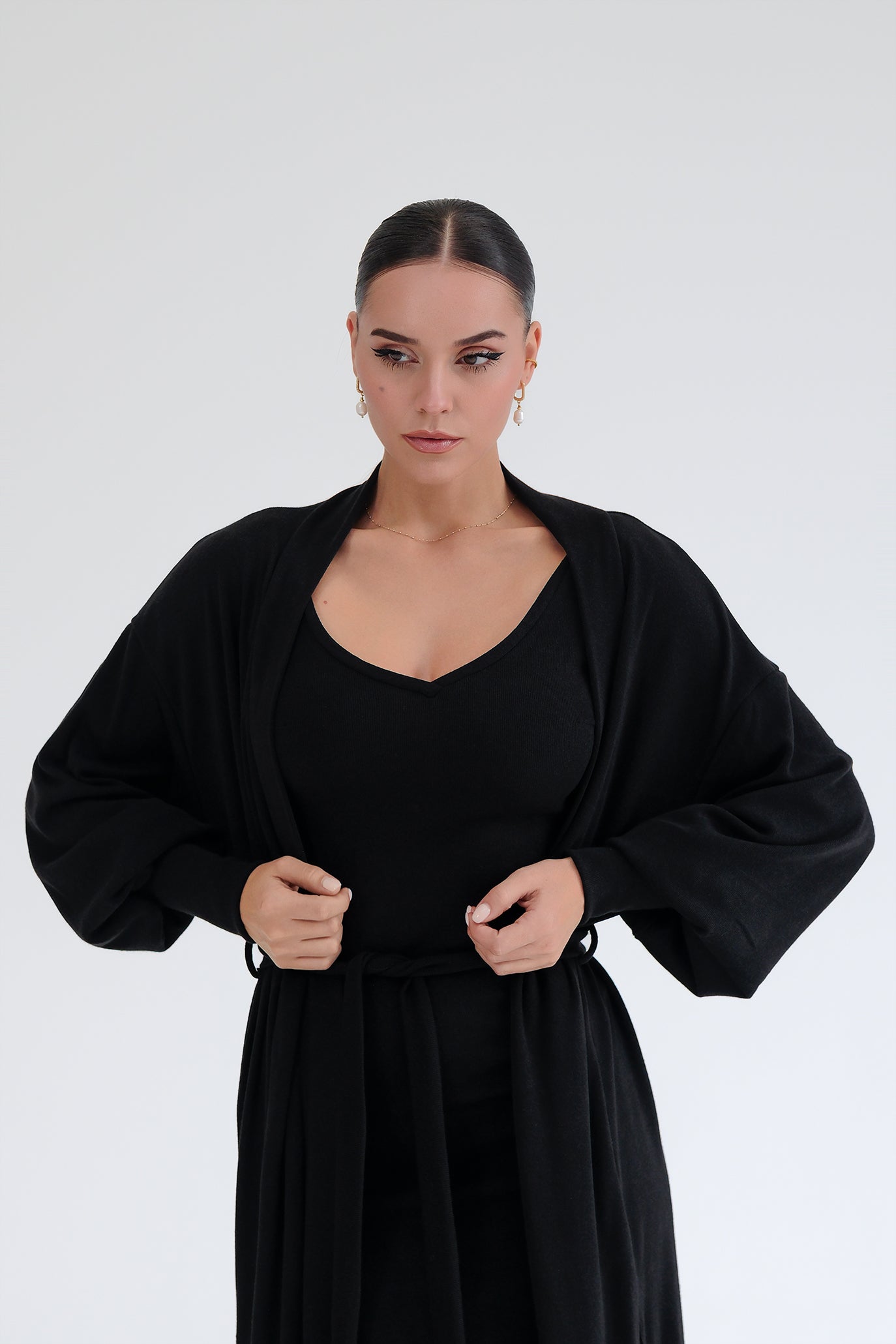 Елегантен сет от двe части – прилягаща миди рокля и дълга жилетка в същия цвят. Роклята е изработена от много мека, еластична трикотажна материя, която прегръща силуета и осигурява комфорт през целия ден. Чистата линия е подчертана от V-образно деколте и дължина под коляното – универсална основа както за ежедневието, така и за по-официални поводи. Жилетката е със свободна, падаща кройка, дълги обемни ръкави и колан от същата материя, който позволява да се носи както отворена, така и пристегната в талията. Универсален размер – стои красиво на различни височини и фигури и лесно се наслоява върху рокли, топове и панталони.