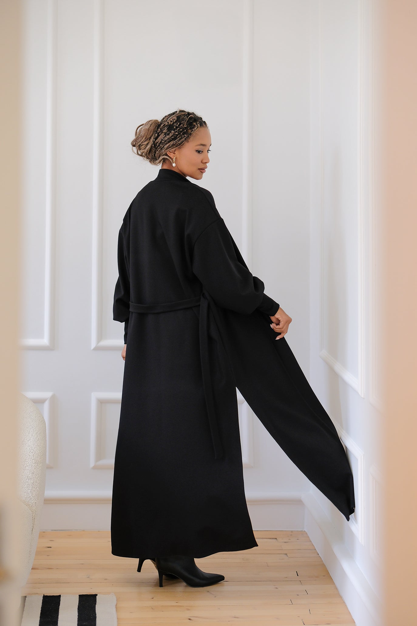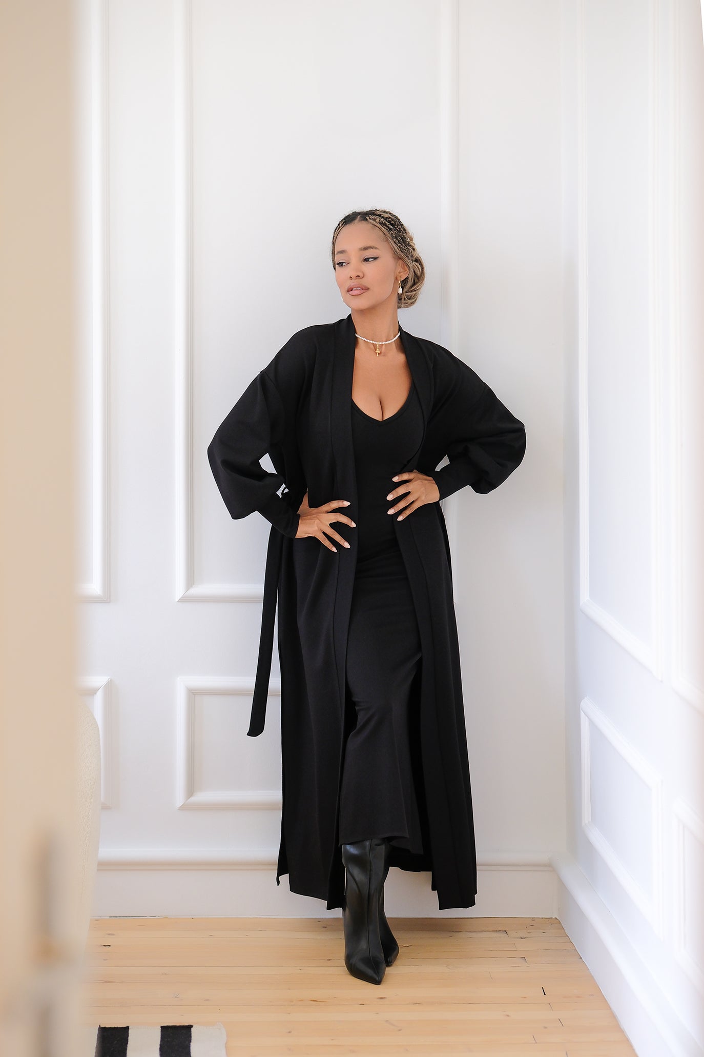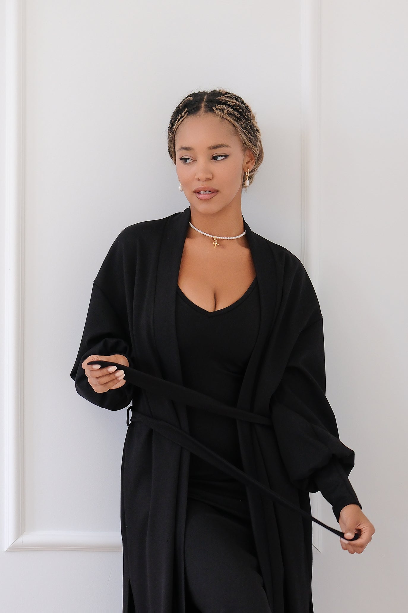Елегантен сет от двe части – прилягаща миди рокля и дълга жилетка в същия цвят. Роклята е изработена от мека, еластична трикотажна материя, която прегръща силуета и осигурява комфорт през целия ден. Чистата линия е подчертана от V-образно деколте и дължина под коляното – универсална основа както за ежедневието, така и за по-официални поводи. Жилетката е със свободна, падаща кройка, дълги обемни ръкави и колан от същата материя, който позволява да се носи както отворена, така и пристегната в талията. Универсален размер – стои красиво на различни височини и фигури и лесно се наслоява върху рокли, топове и панталони.
