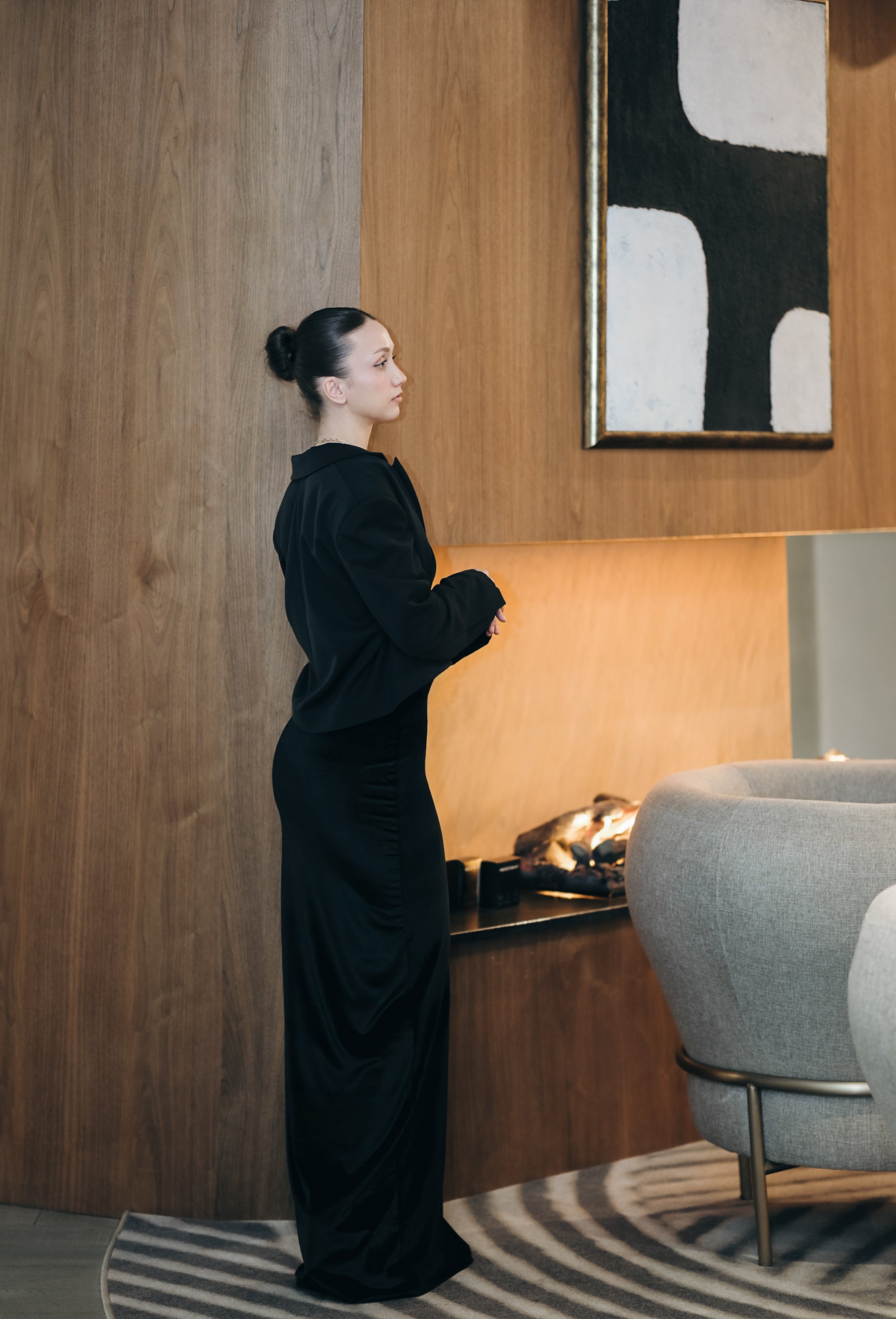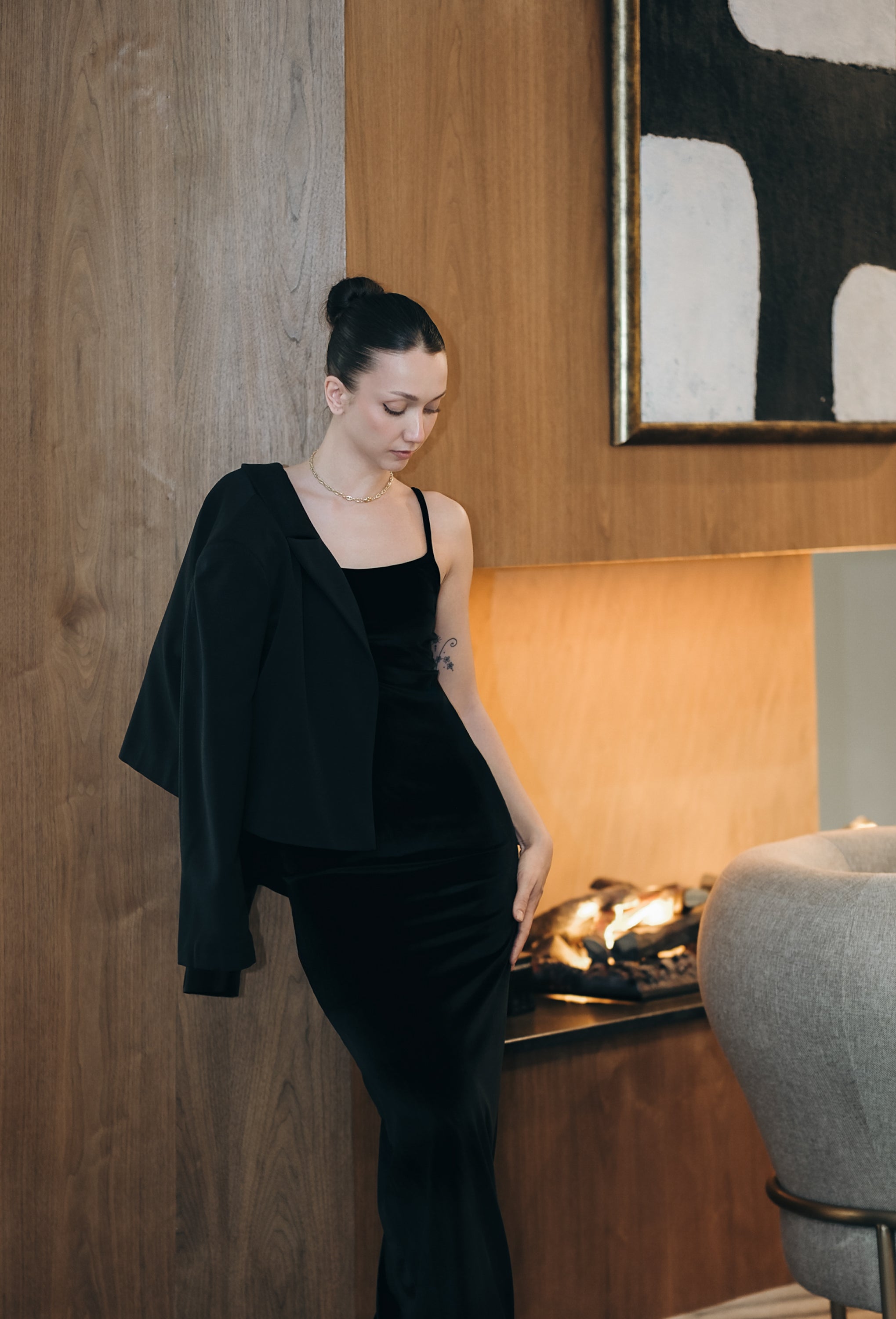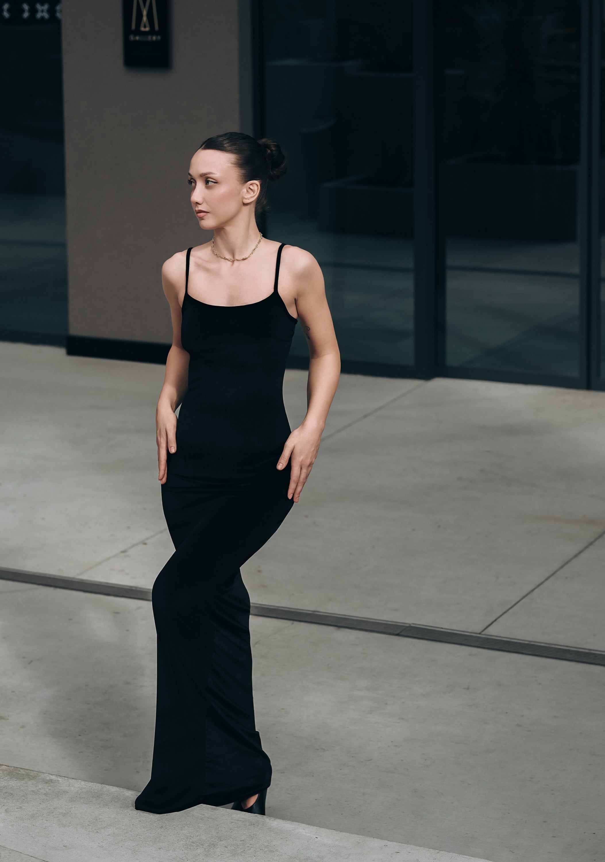 Дълга минималистична рокля. Основата е изработена от еластична, кадифена материя, която приляга като втора кожа и подчертава силуета. Кройката е изчистена, а цветът – универсален и елегантен. Презрамките се регулират, а в областта на бюста има допълнителен плътен плат като бюстие, което позволява роклята да се носи без сутиен. Не прозира.