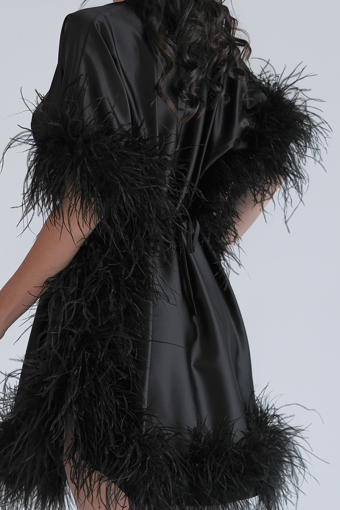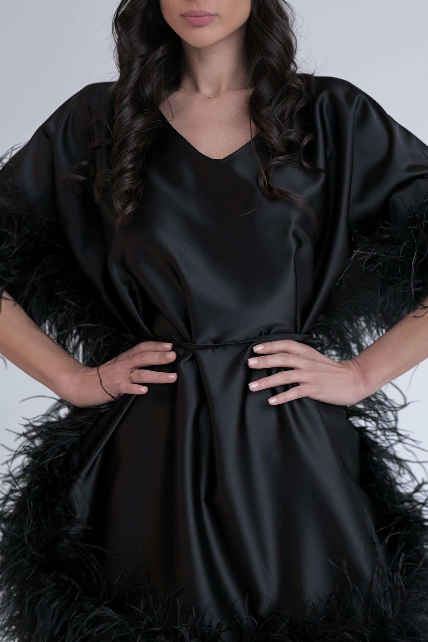 Елегантна къса рокля с подчертана талия, създадена за впечатляващо присъствие. Моделът е с фина сатенирана материя и акцентни пера от подгъва до и по ръкавите. Коланът оформя силуета.