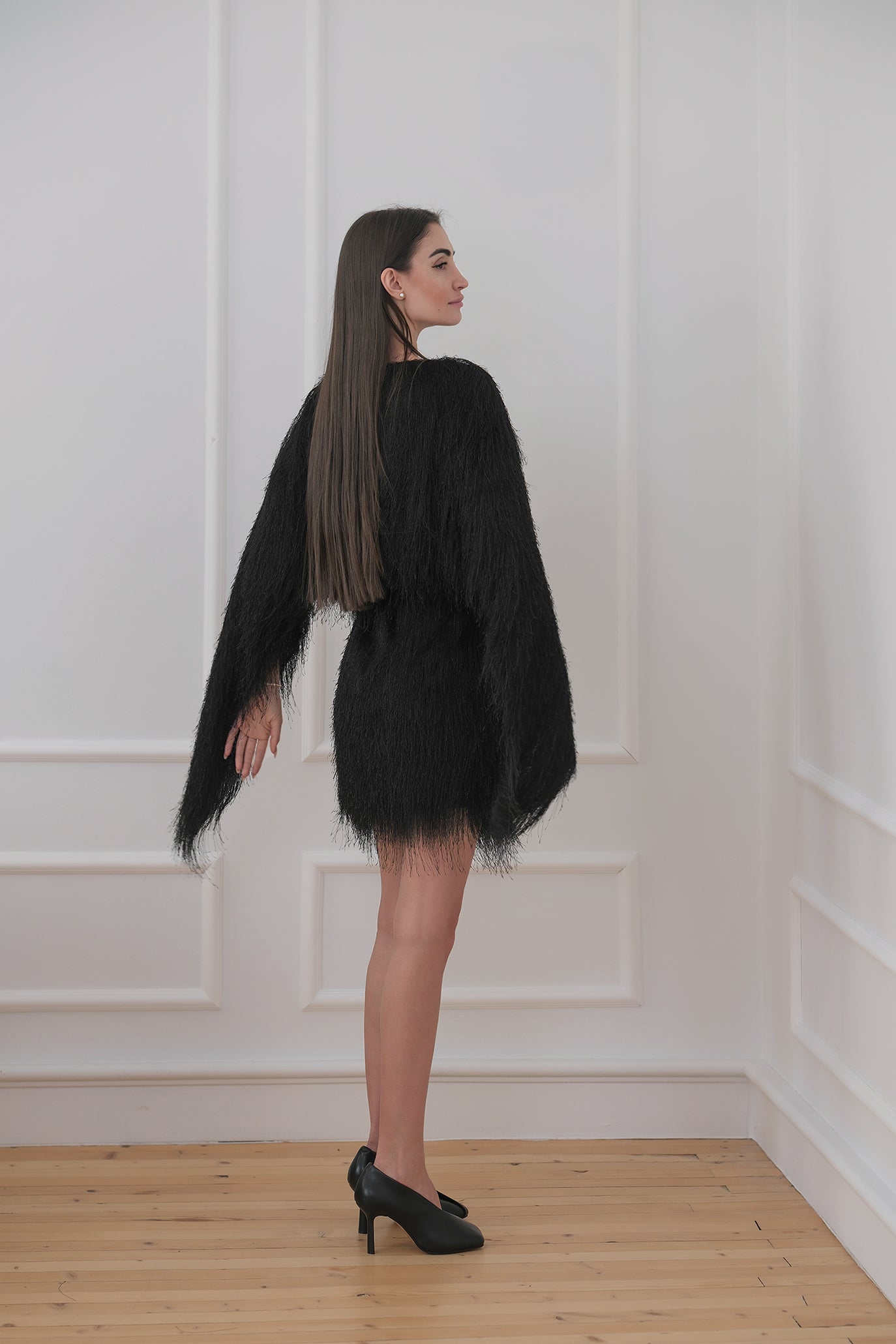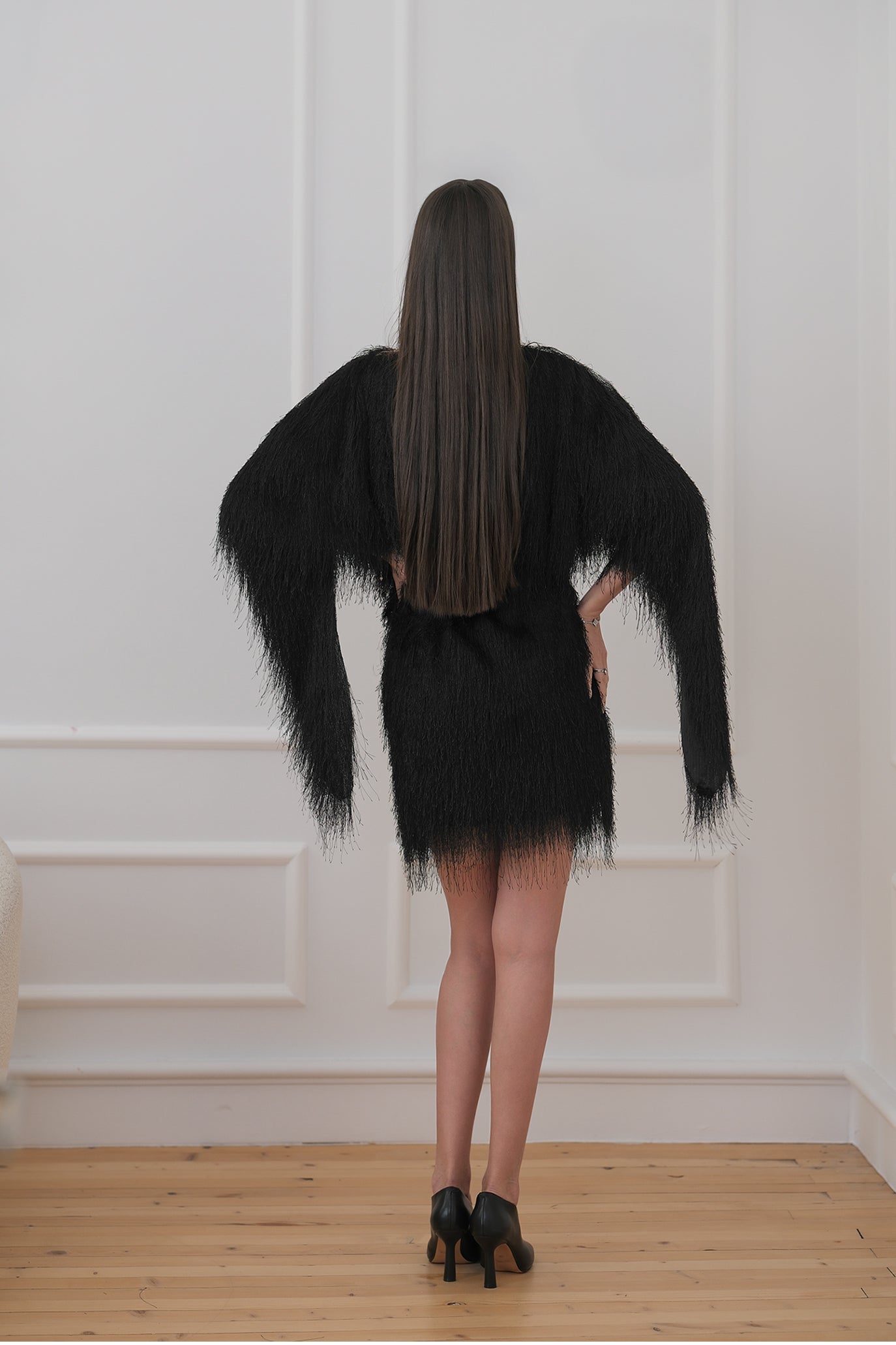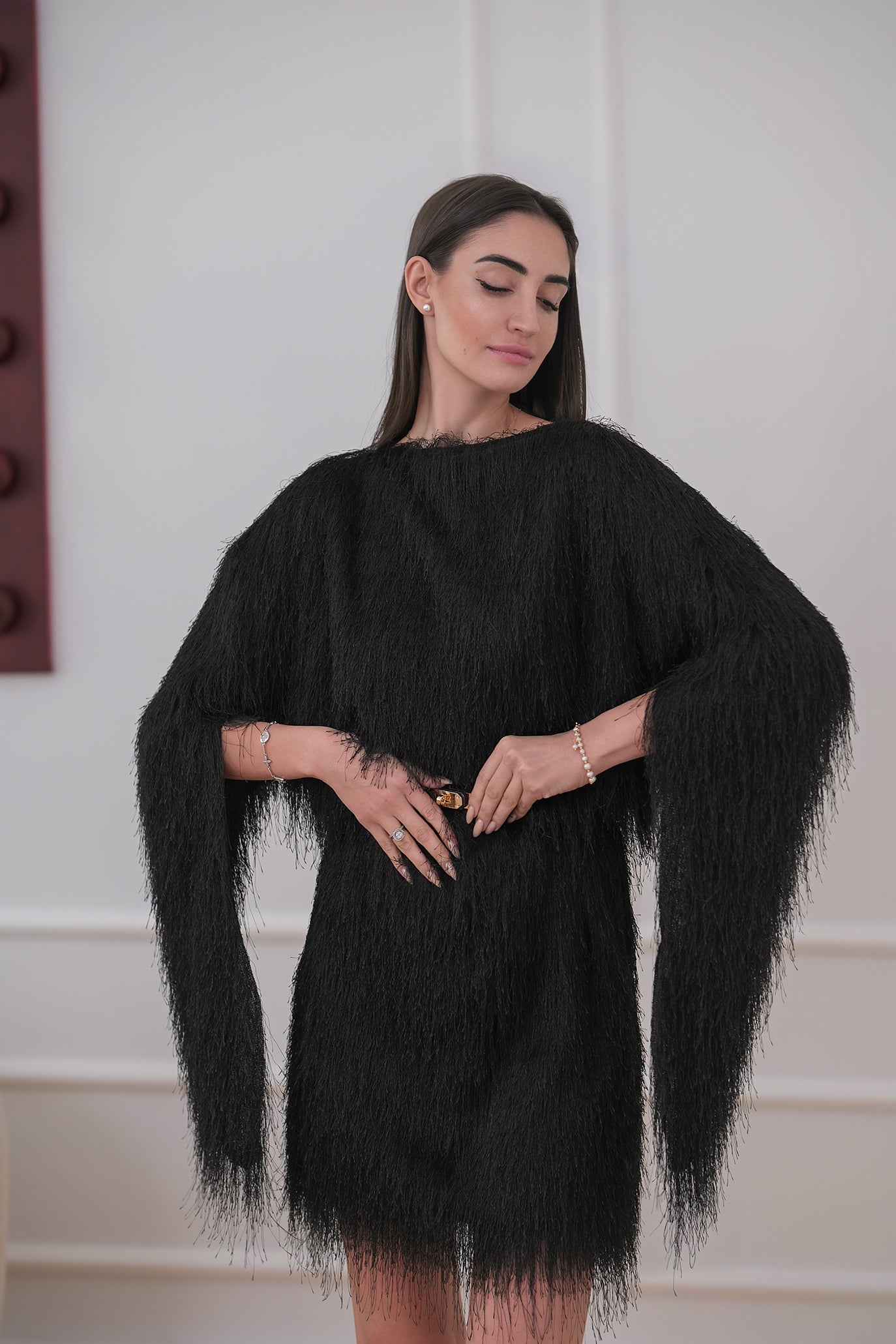Елегантна мини рокля с ефектна текстура от фини нишки, които създават богато движение и изразителен визуален ефект. Множество специални конци - ресни с ефект на пера или косъм. Моделът е със свободен силует и пада нежно по тялото, като придава усещане за лекота. Акцентът е в характерната повърхност на плата, която докосва кожата.