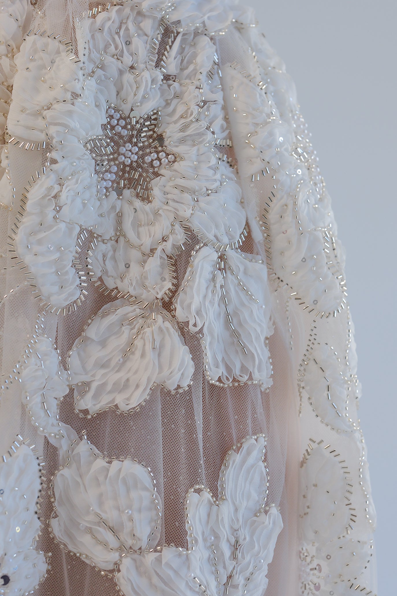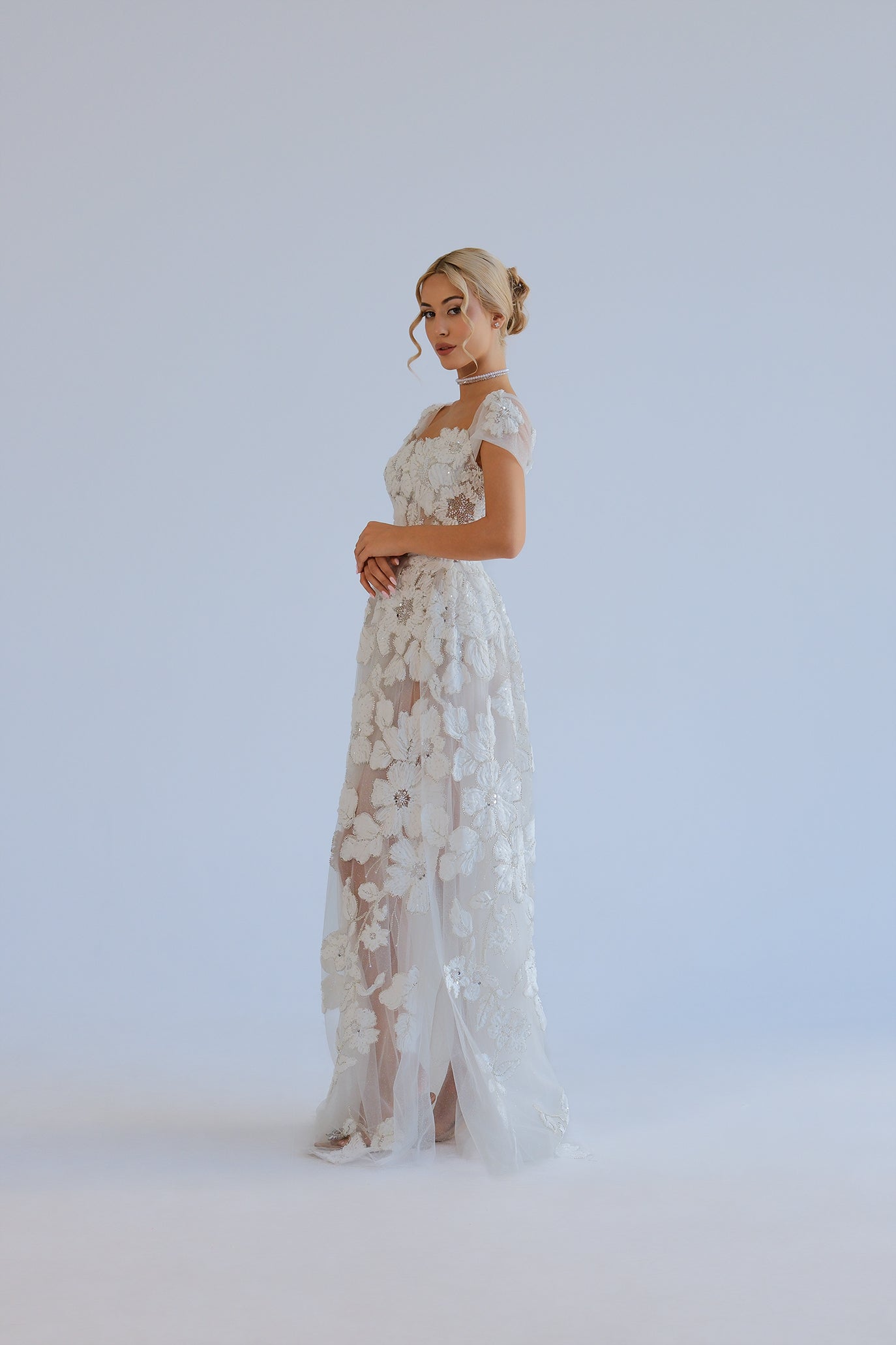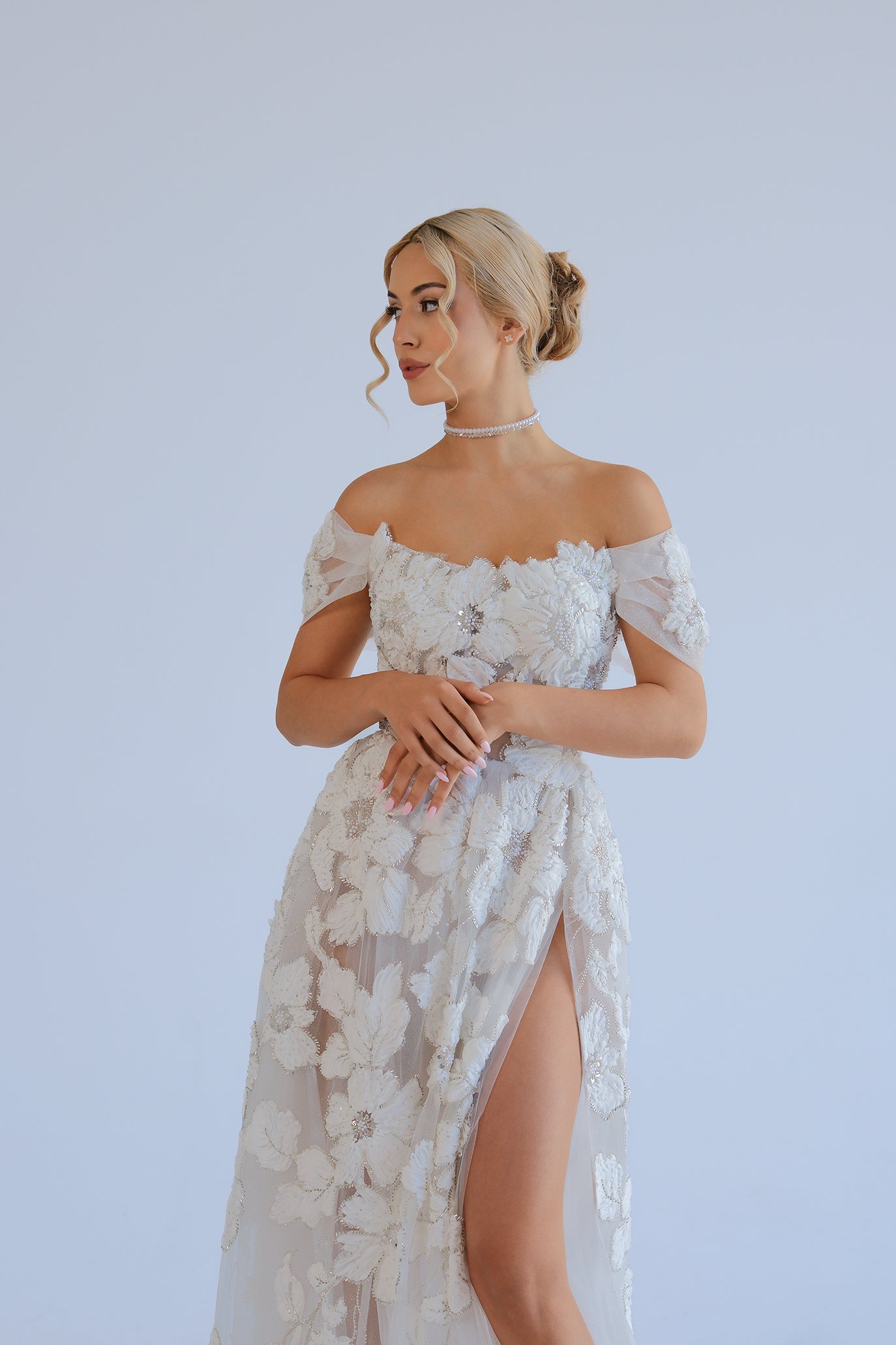 Ефирна рокля, изработена от многопластов тюл и покрита с богати 3D флорални апликации, декорирани с пайети и фини кристални акценти. Горната част е тип корсет със сърцевидно деколте и деликатни паднали презрамки, които подчертават линията на раменете и осигуряват сигурна поддръжка и перфектно прилягане благодарение на връзките на гърба. Полата е права до А-силует с леко падаща линия и дискретна цепка отпред за свобода на движение и елегантен ефект при ходене. Продуктът идва в персонализиран калъф.