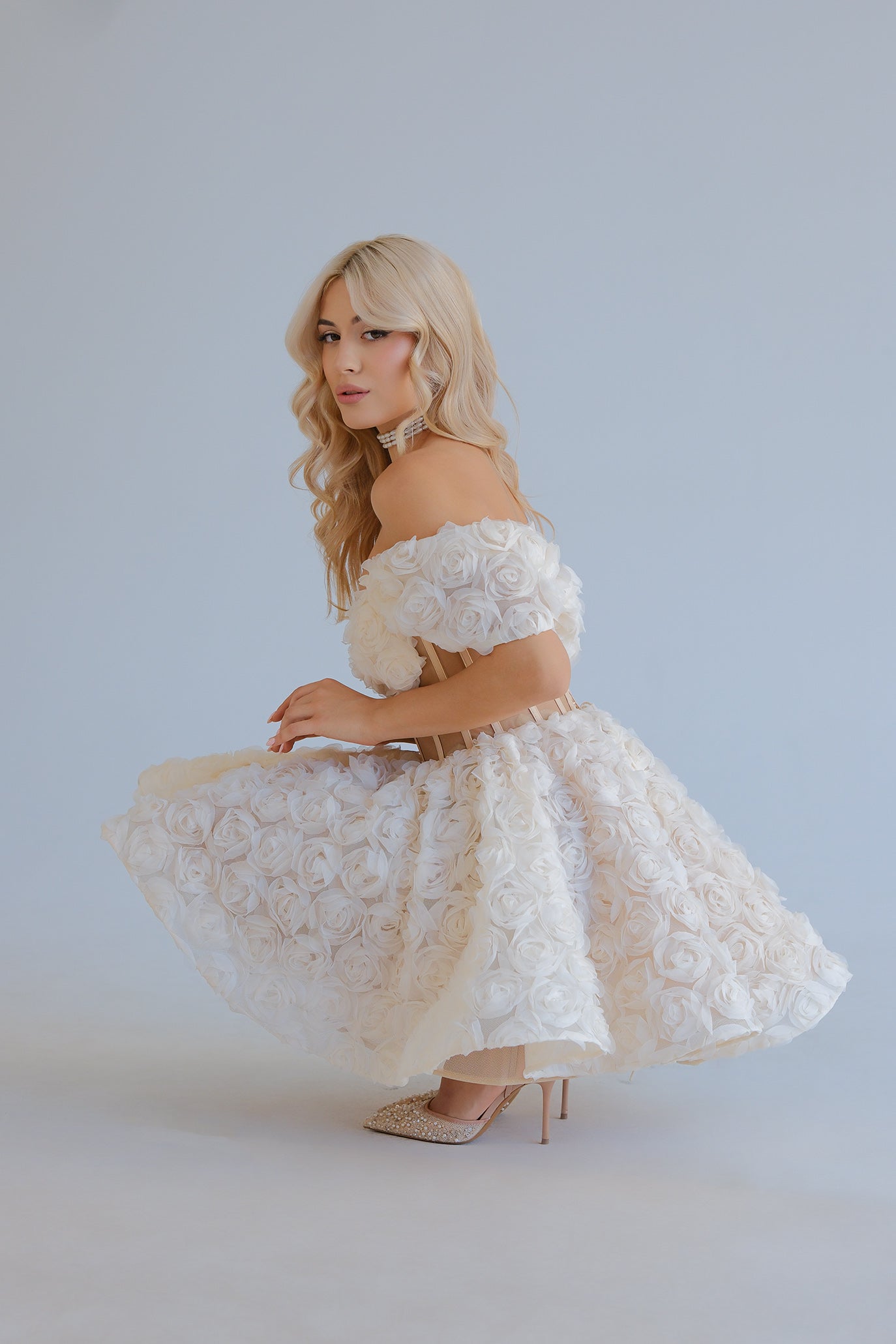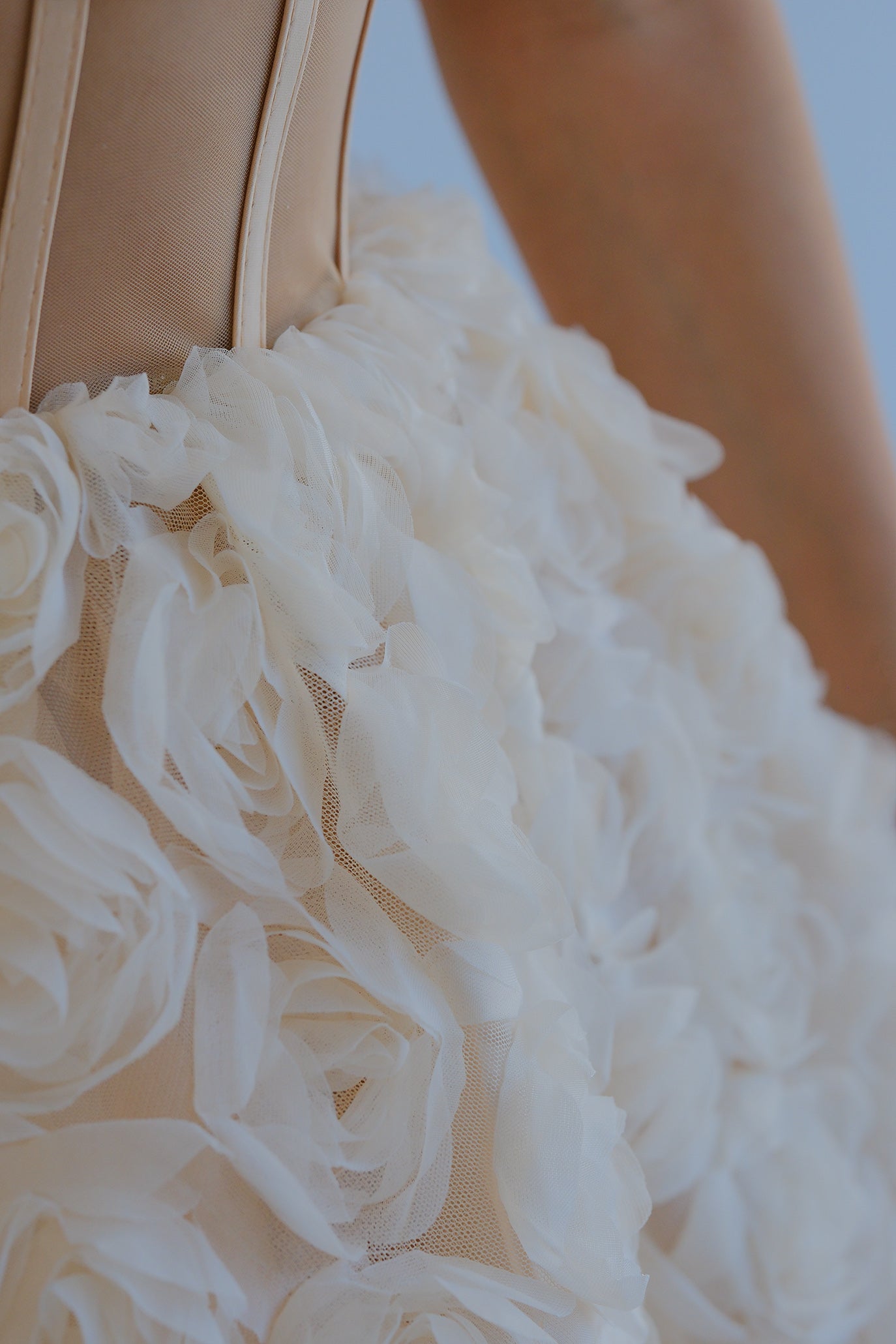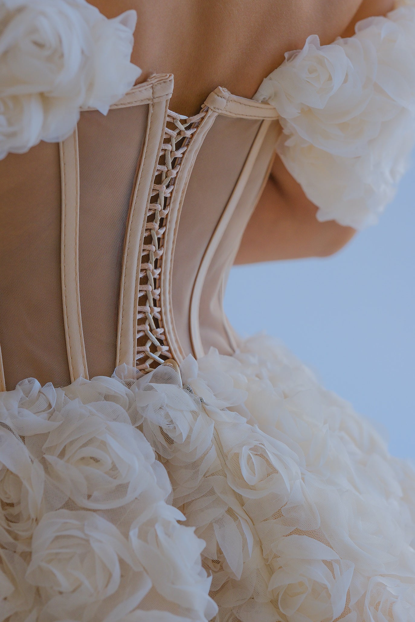 Романтична мини рокля, нежна като целувка. Горната част е корсет с прозрачен торс от фин тюл и вертикални банели за перфектна стойка и подчертаване на талията. Раменете са с паднали ръкави с богат обем. Полата е изградена от 3D текстурирани рози, които придават обем и движение, като запазват формата си. Завръзването на гърба е регулируемо за прецизно прилягане.