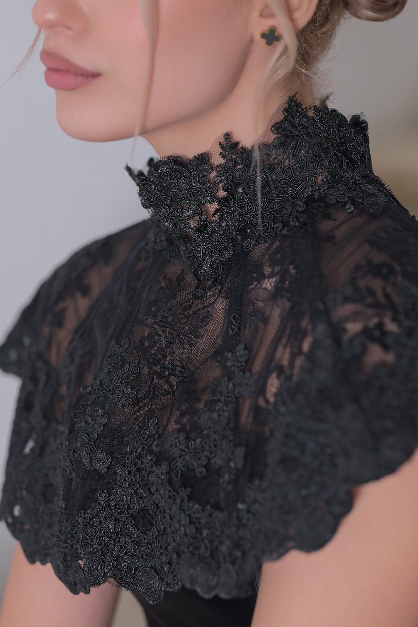 Нежна дантелена яка с флорални елементи, която придава неповторима елегантност и присъстие. Перфектно допълнение към всяка рокля или корсет, тя оформя изискана линия на деколтето, акцентирайки на врата с елегантен, винтидж ефект. Формата се поддържа чрез банели. Яката е с ефирен и женствен вид, придаващ класическо очарование и е идеален избор за специални поводи и официални събития.
