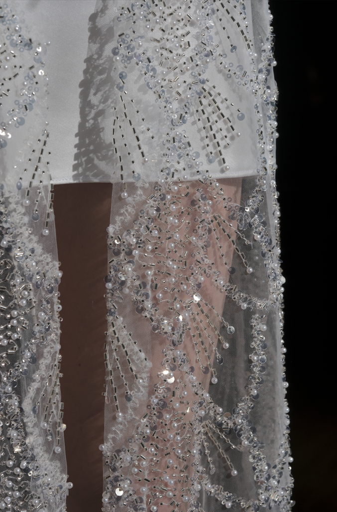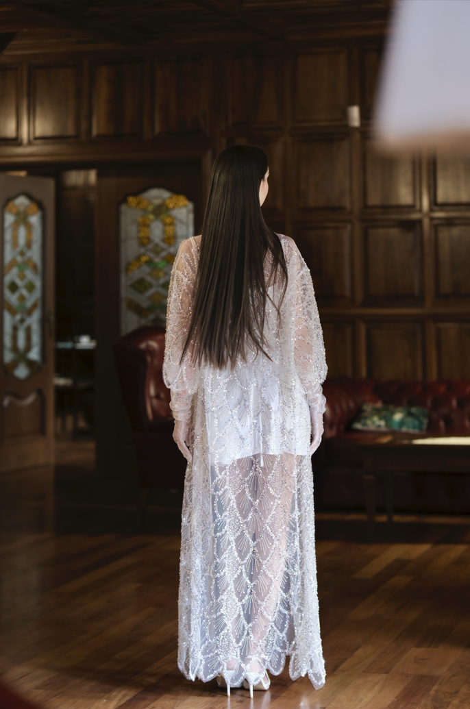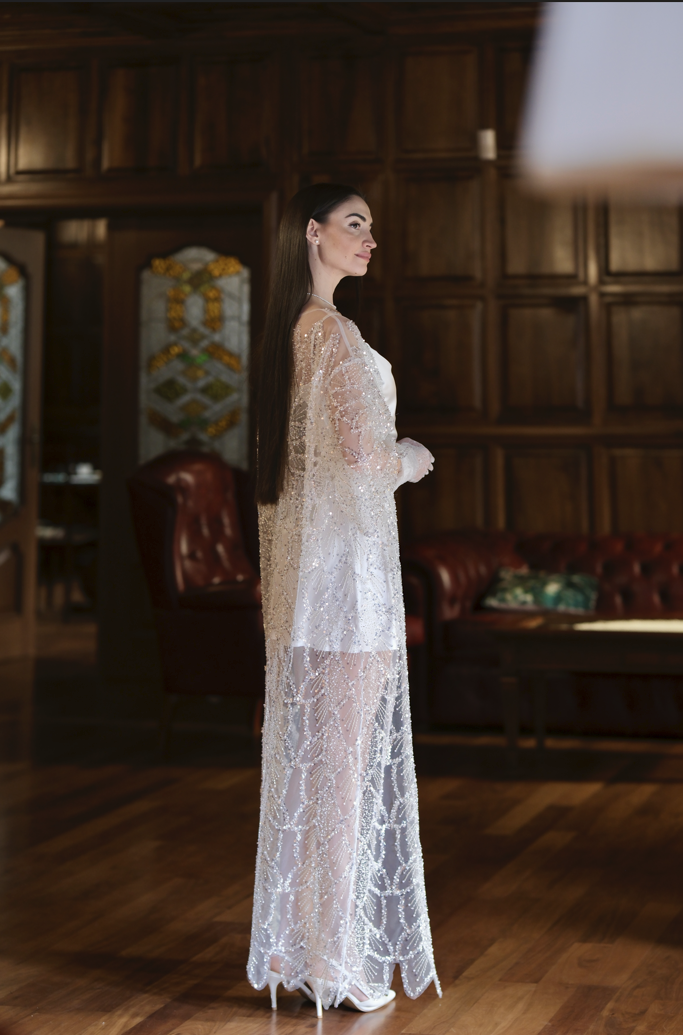 Изискана жилетка, особено подходяща за луксозни вечерни събития. Изцяло ръчна изработка. Жилетката е със свободна кройка, от мрежеста полупрозрачна материя, изцяло обсипана с блестящи кристали.