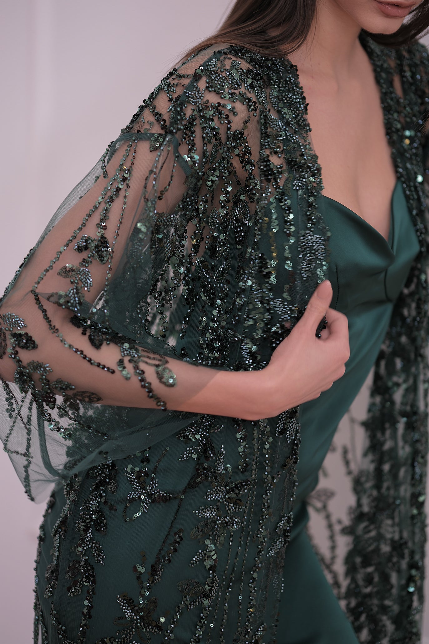 Изискана жилетка, особено подходяща за луксозни вечерни събития. Изцяло ръчна изработка. Жилетката е със свободна кройка, от мрежеста полупрозрачна материя, изцяло обсипана с блестящи кристали.