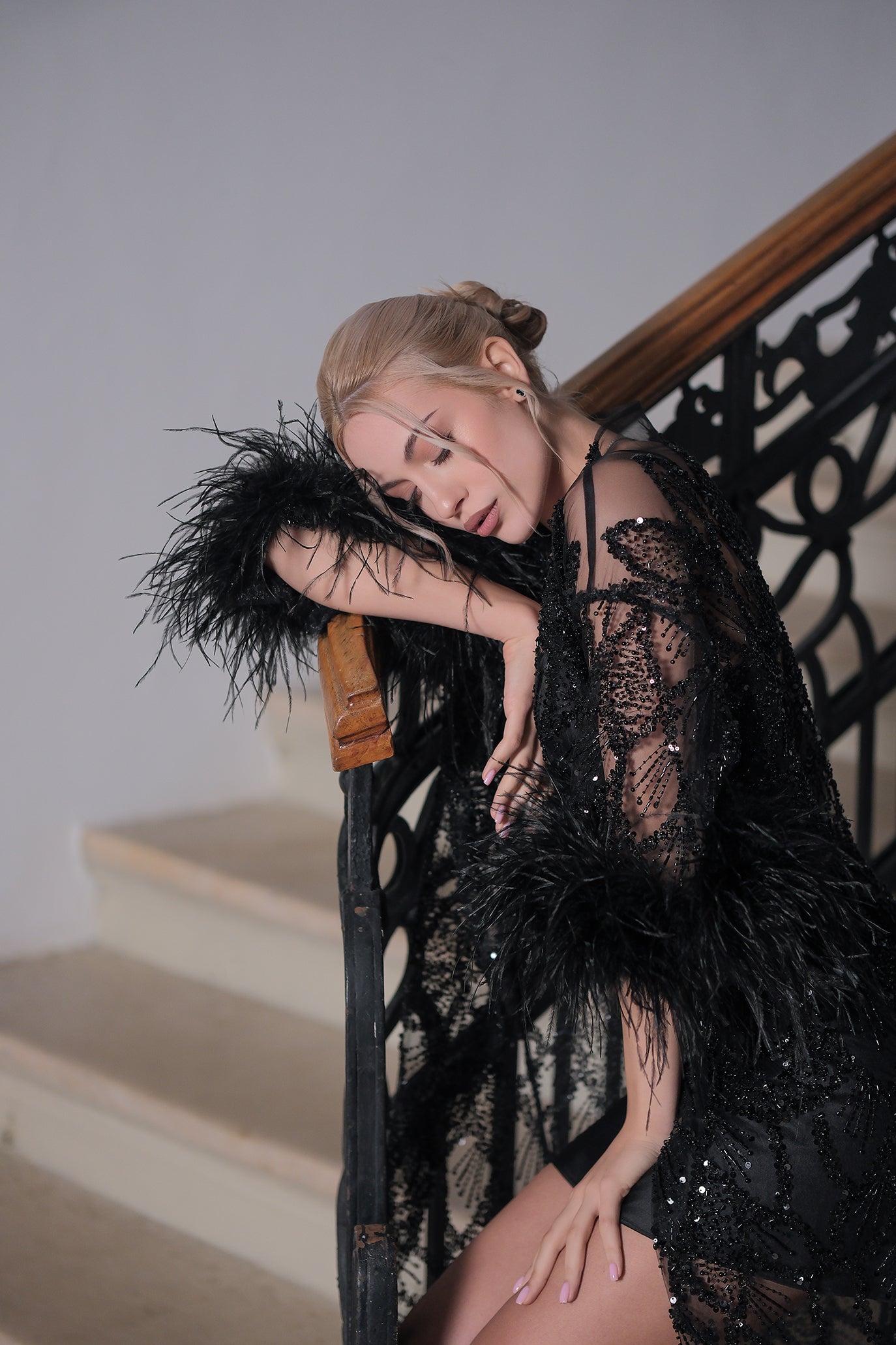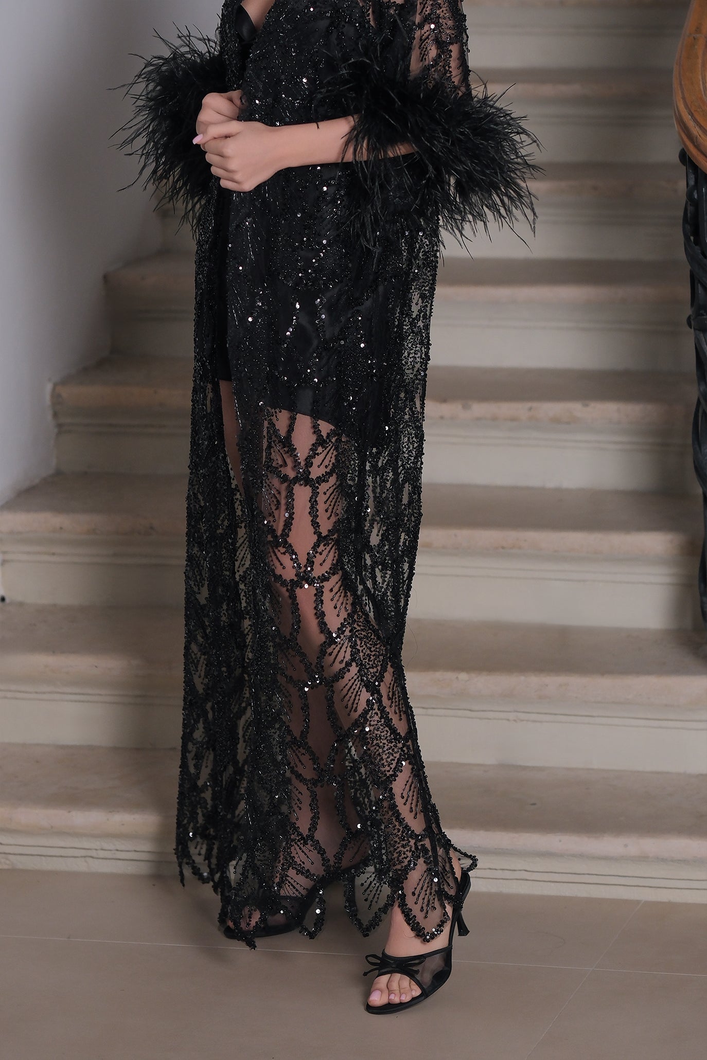 Изискана жилетка, особено подходяща за луксозни вечерни събития. Изцяло ръчна изработка. Жилетката е със свободна кройка, от мрежеста полупрозрачна материя, изцяло обсипана с блестящи кристали и нежни пера по ръбовете на ръкавите.