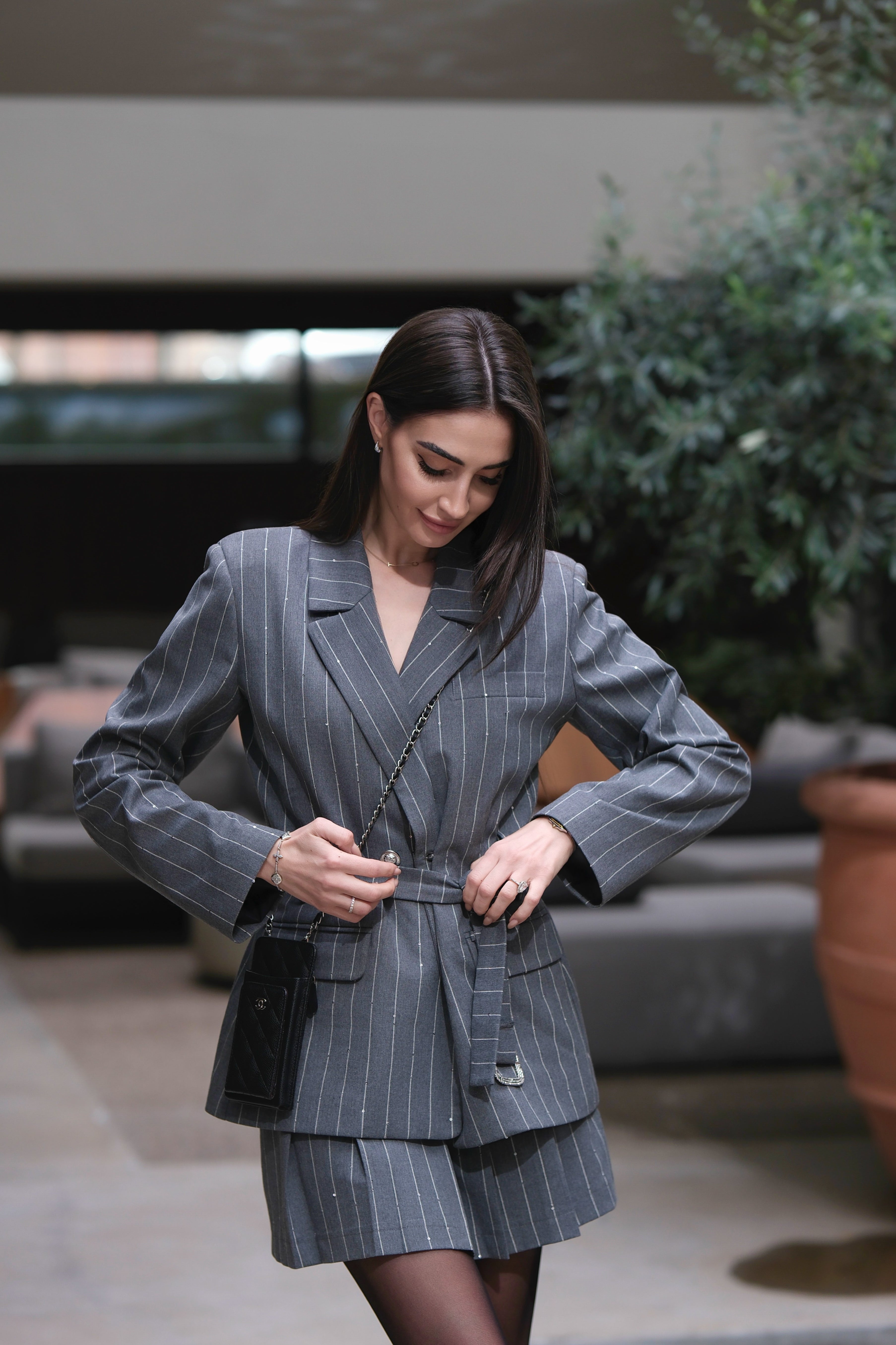 Стилно сако в сиво райе. Има елегантен колан, който подчертава талията. има мека трикотажна подплата.