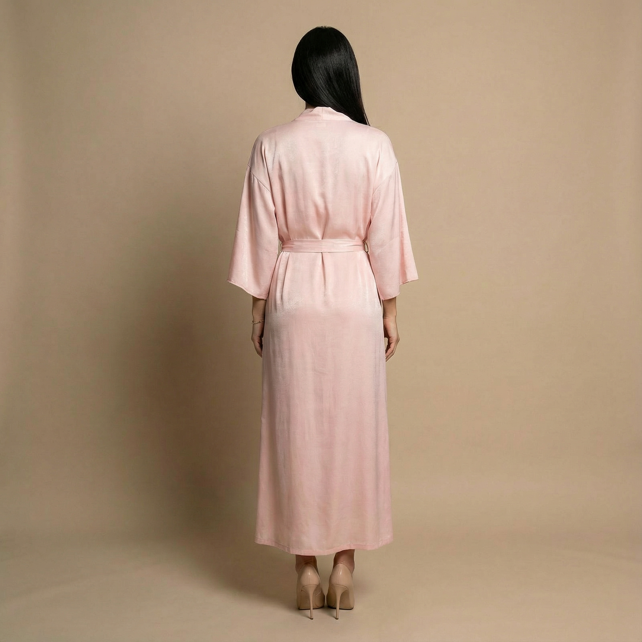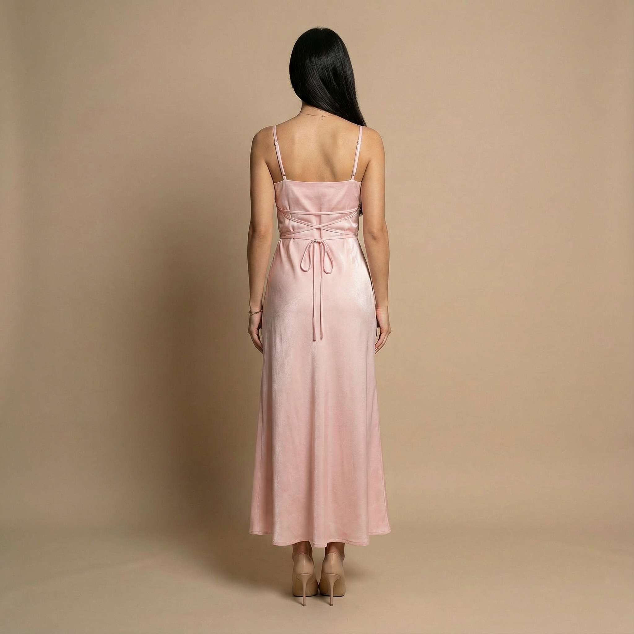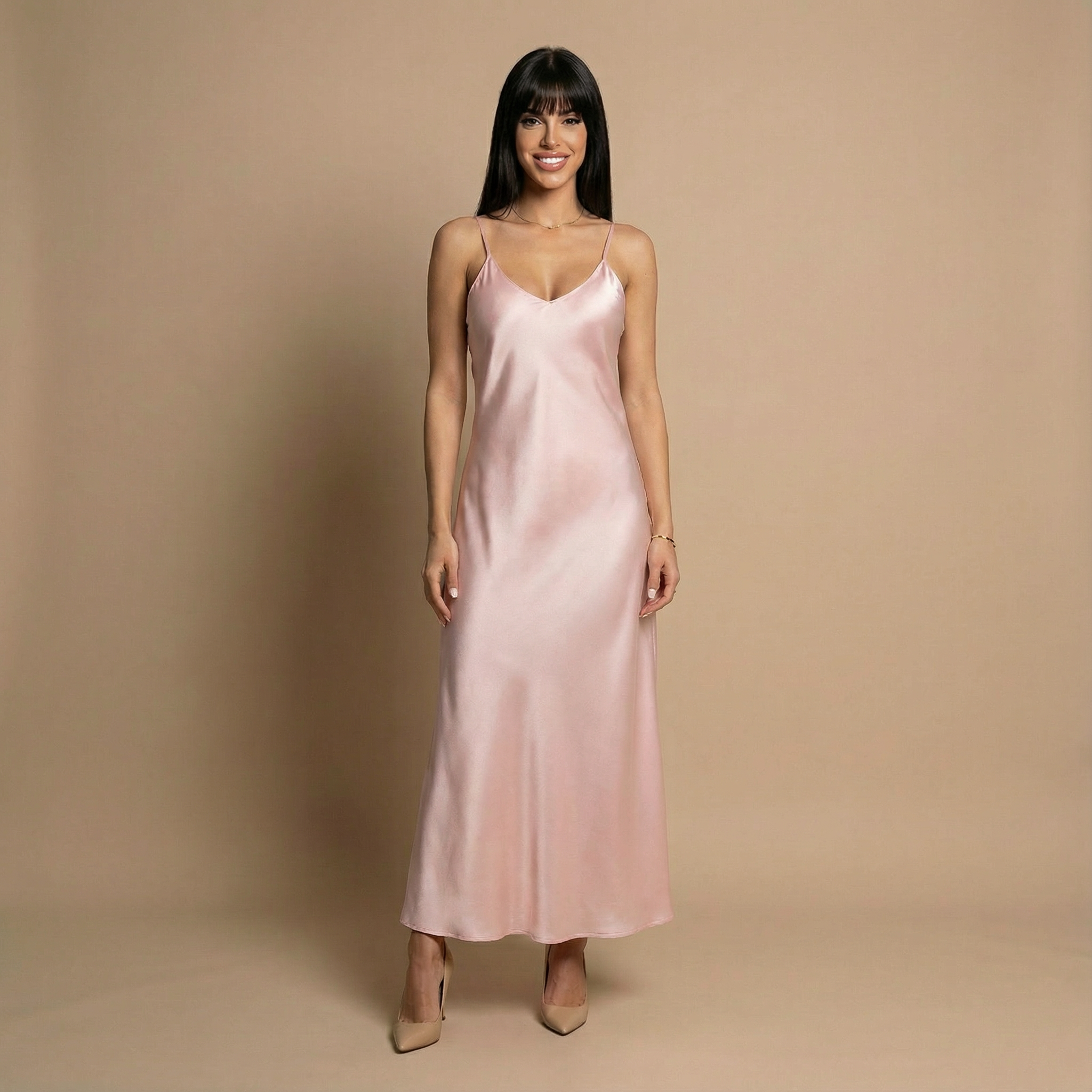 Дълга рокля от луксозен сатен с деликатен блясък, която съчетава женственост и елегантност. Моделът е със свободна, ефирна кройка, тънки презрамки и деколте тип „водопад“. Може да бъде съчетана с жилетката от снимките.