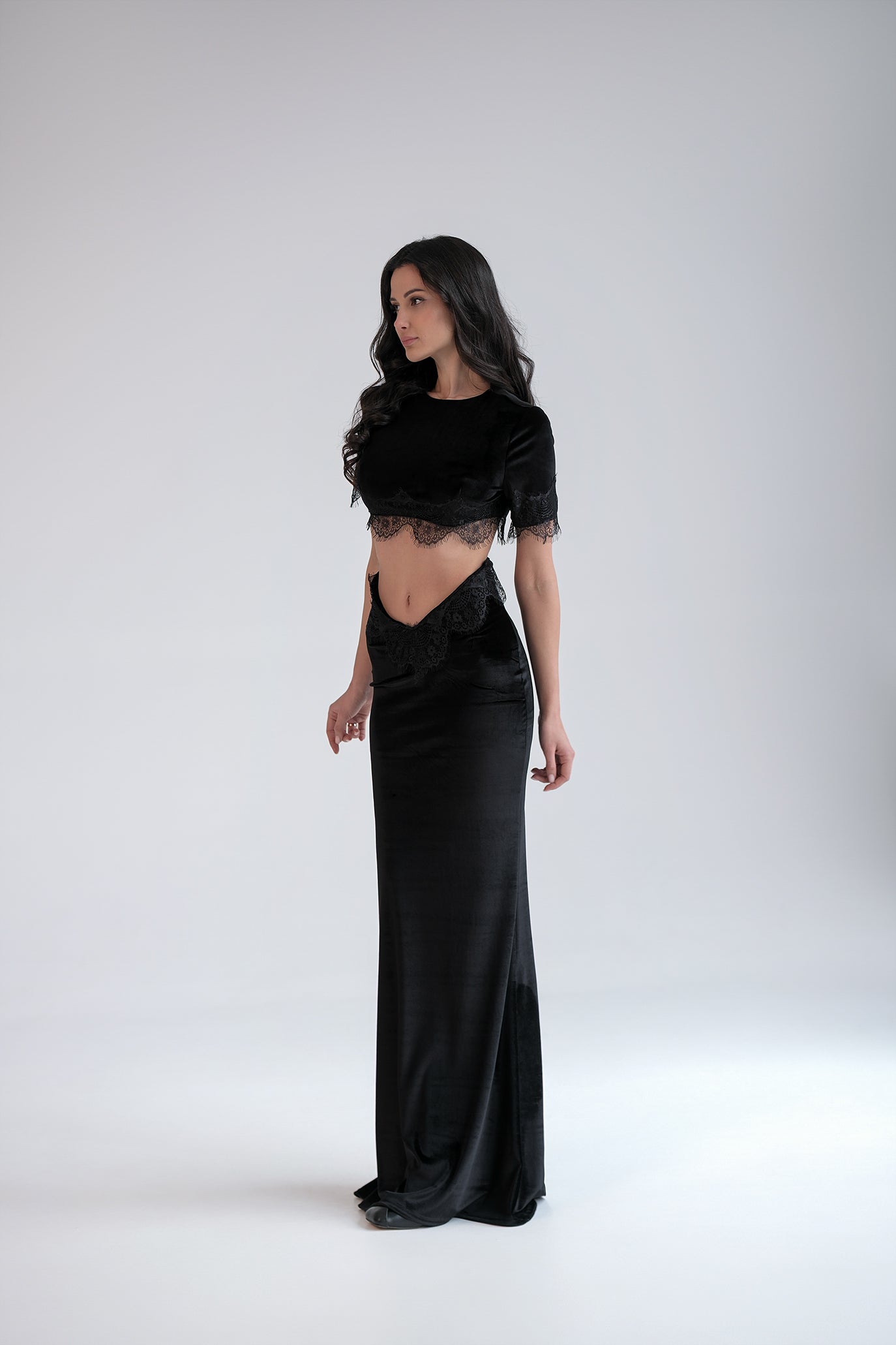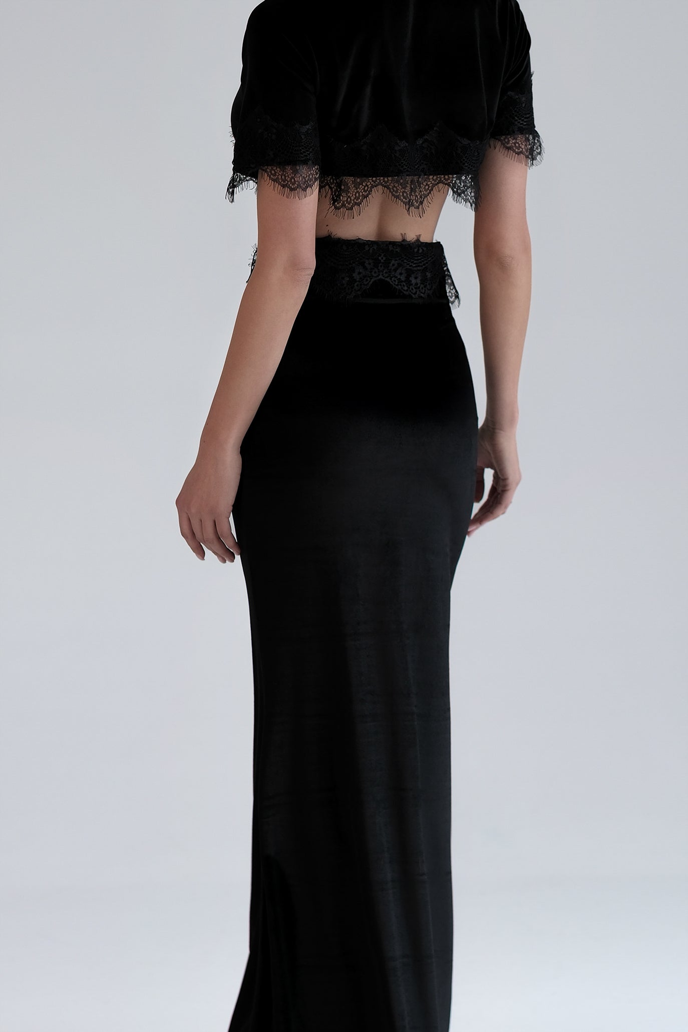 Сет с акценти от деликатна дантела. Горната част е с къс топ, докато долната част е с дълга пола. Моделът подчертава талията, а дантелата в долната част на топа и по ръбовете на полата добавя нежност. Закопчаването е с цип отзад.