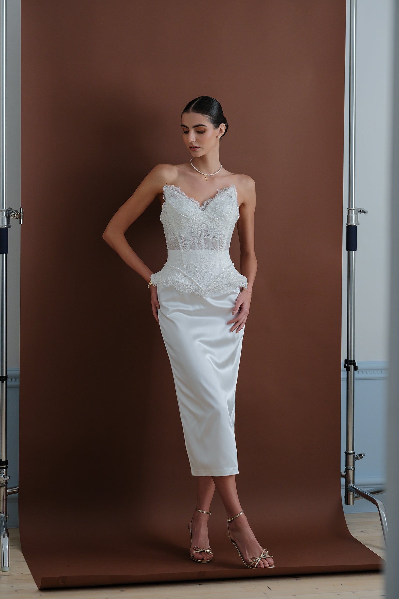 Комплект, състоящ се от корсет и пола в перлено бяло. Горната част е фино изработена от прозрачна дантела с вградени банели, които оформят силуета и подчертават талията. Елегантно острите V-деколте и завършек на кореста придават неповторимост на визията. Те са завършени с деликатна перлена кантовка. Полата е от мек сатен с лека еластичност, който пада по тялото и създава гладка, женствена линия с миди дължина.