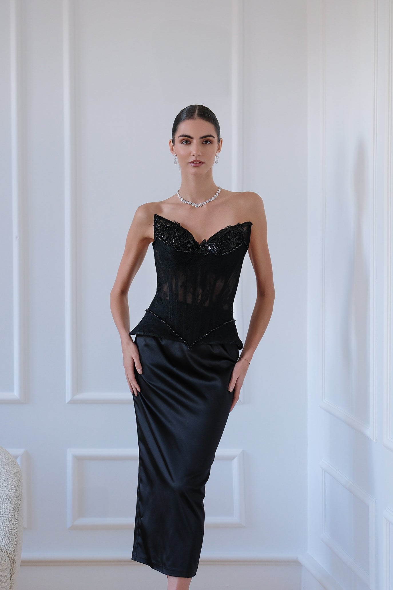 Комплект, състоящ се от корсет и пола в черно. Горната част е фино изработена от прозрачна дантела с вградени банели, които оформят силуета и подчертават талията. Елегантно острите V-деколте и завършек на кореста придават неповторимост на визията. Те са завършени с деликатна перлена кантовка. Полата е от мек сатен с лека еластичност, който пада по тялото и създава гладка, женствена линия с миди дължина.