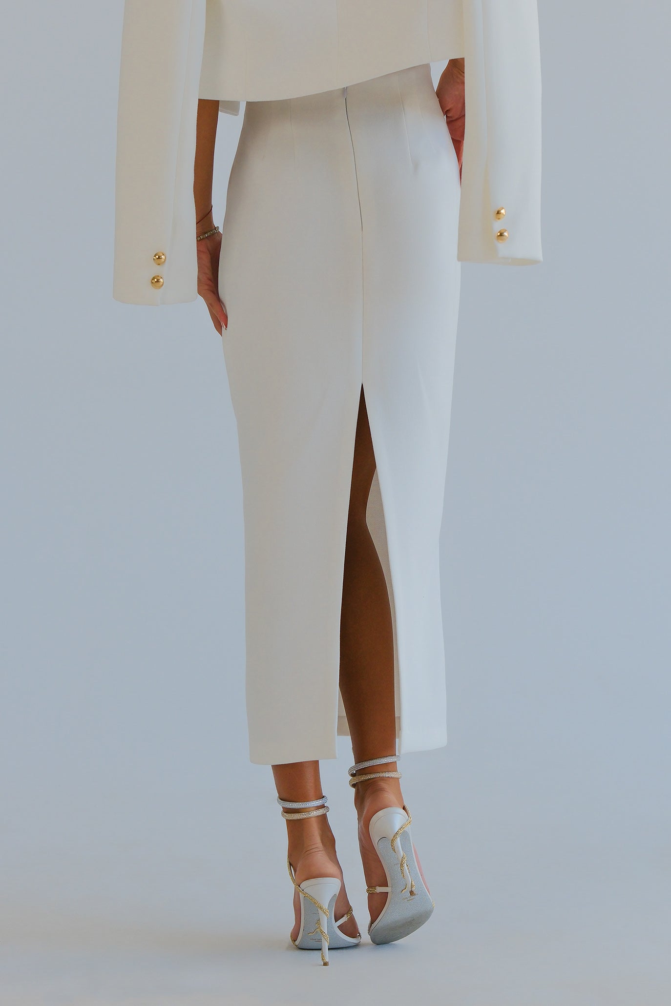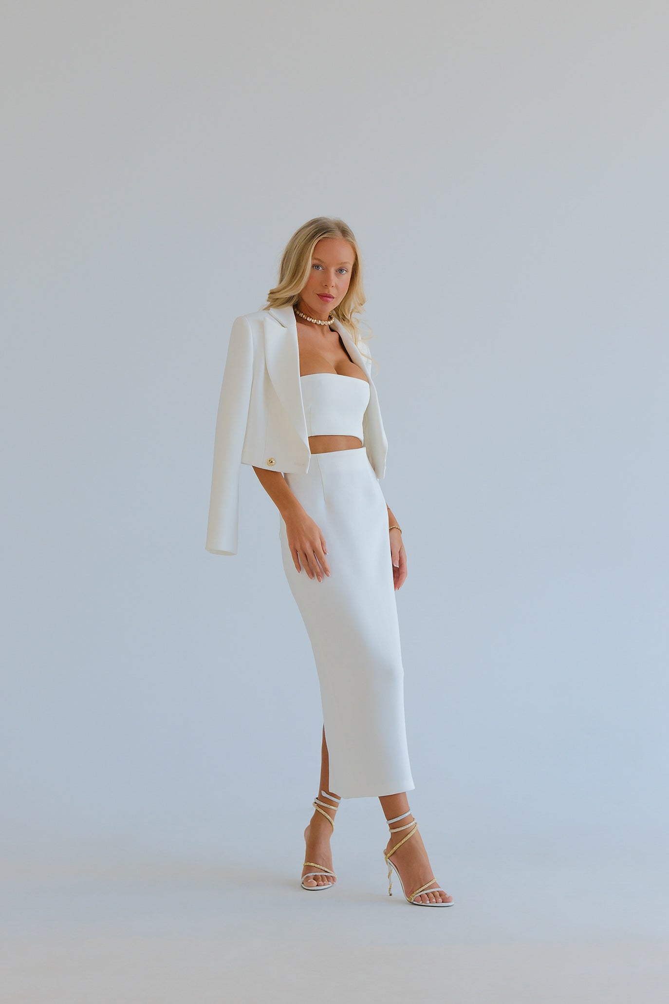 Сет за модерна, женствена версия. Късото сако със скулптурирани реверни и метални копчета оформя раменете и подчертава талията. Топът стои минималистично под сакото, а полата тип „молив“ издължава силуета. Материята е с плътност и еластичност за гладко прилягане без ограничение в движенията. Подходящ за коктейл, бизнес събитие, кръщене/граждански брак или всеки повод, изискващ безупречен минимализъм.