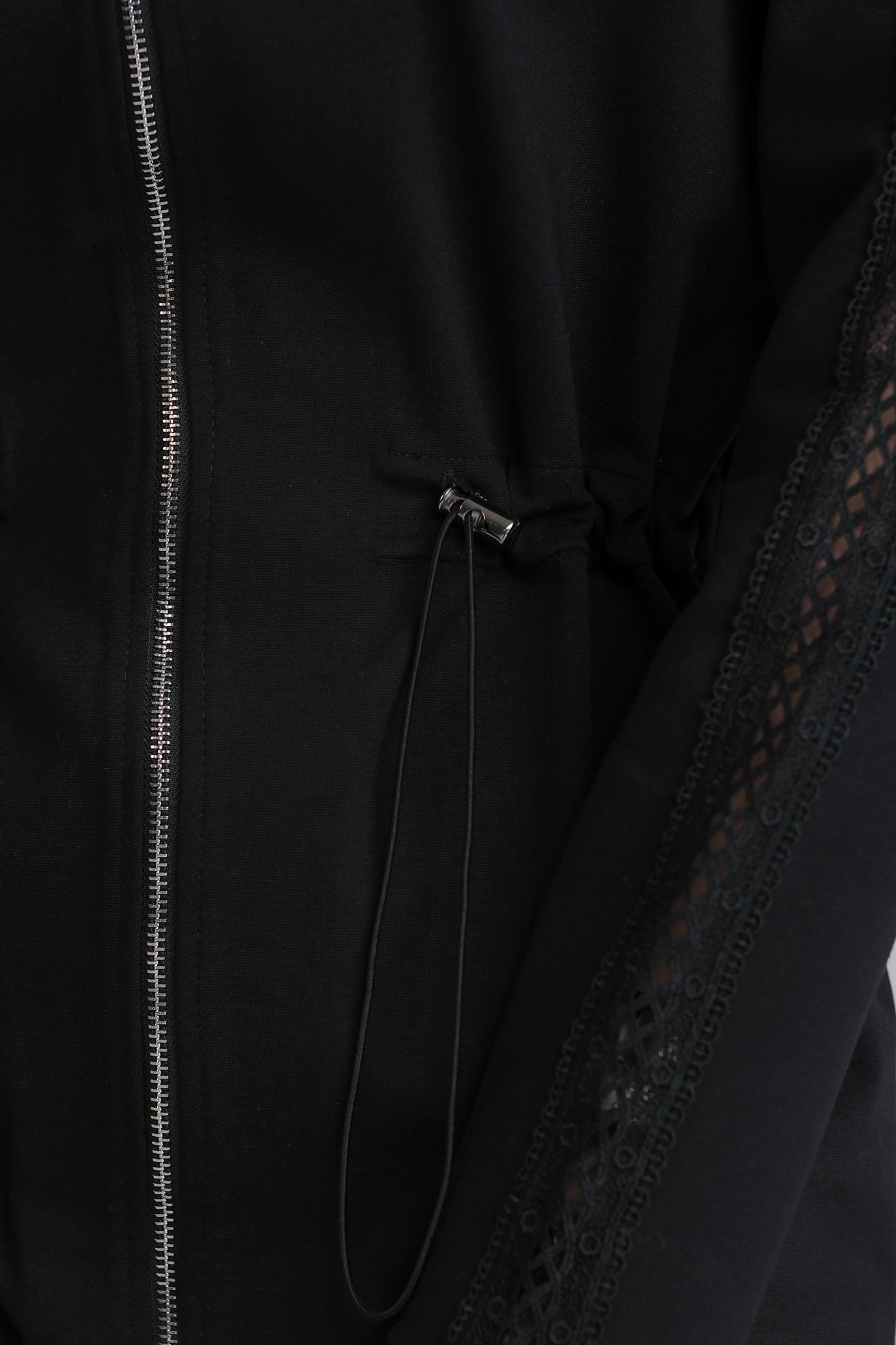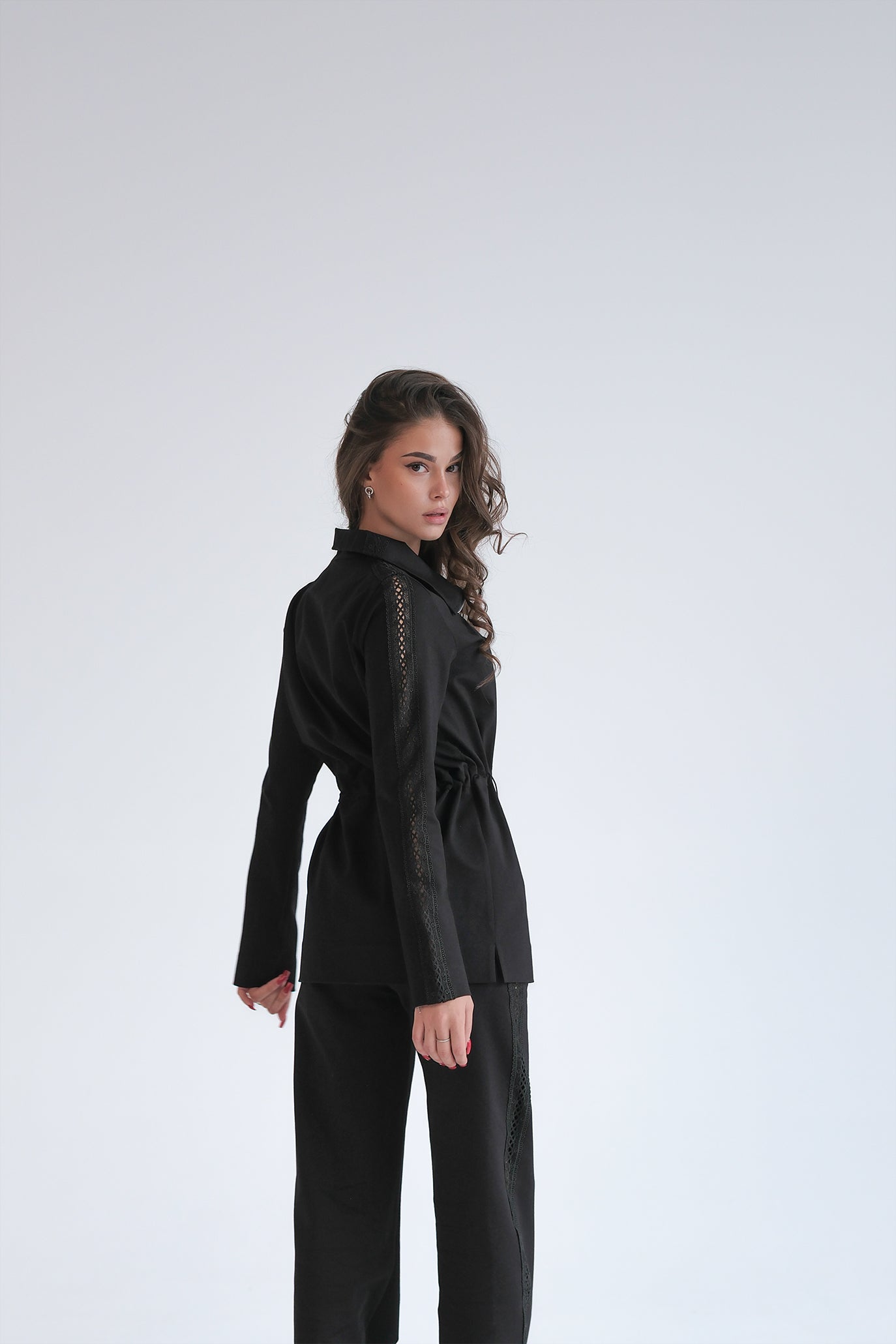 Спортно-елегантен сет от две части, изработен от висококачествена материя с меко и гладко усещане. Горната част е с изчистен силует и регулируема талия чрез фини връзки, които позволяват прецизно оформяне на фигурата. Декоративната дантела по ръкавите придава женствен акцент. Панталонът е с комфортна ластична талия и прав крачол, а деликатната дантелена лента по дължината му визуално издължава силуета. Може да изберете панталон с разкроен крачол тип Чарлстон или по-втален прав крачол.
