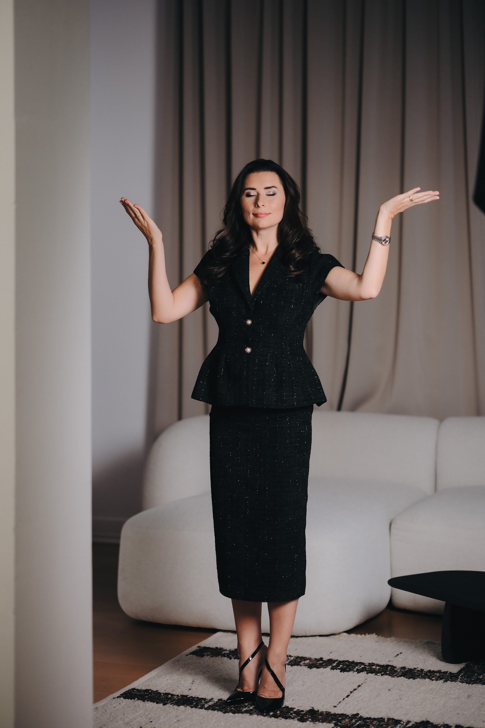 Елегантно сако / елек без ръкави, изработено от висококачествен текстил. Сакото е с класическа яка и силует, който подчертава талията и създава женствена линия. Закопчаването отпред с копчета допълва изискания вид, като същевременно предлага удобство и комфорт. Може да се носи както като самостоятелна дреха, така и върху друга такава.