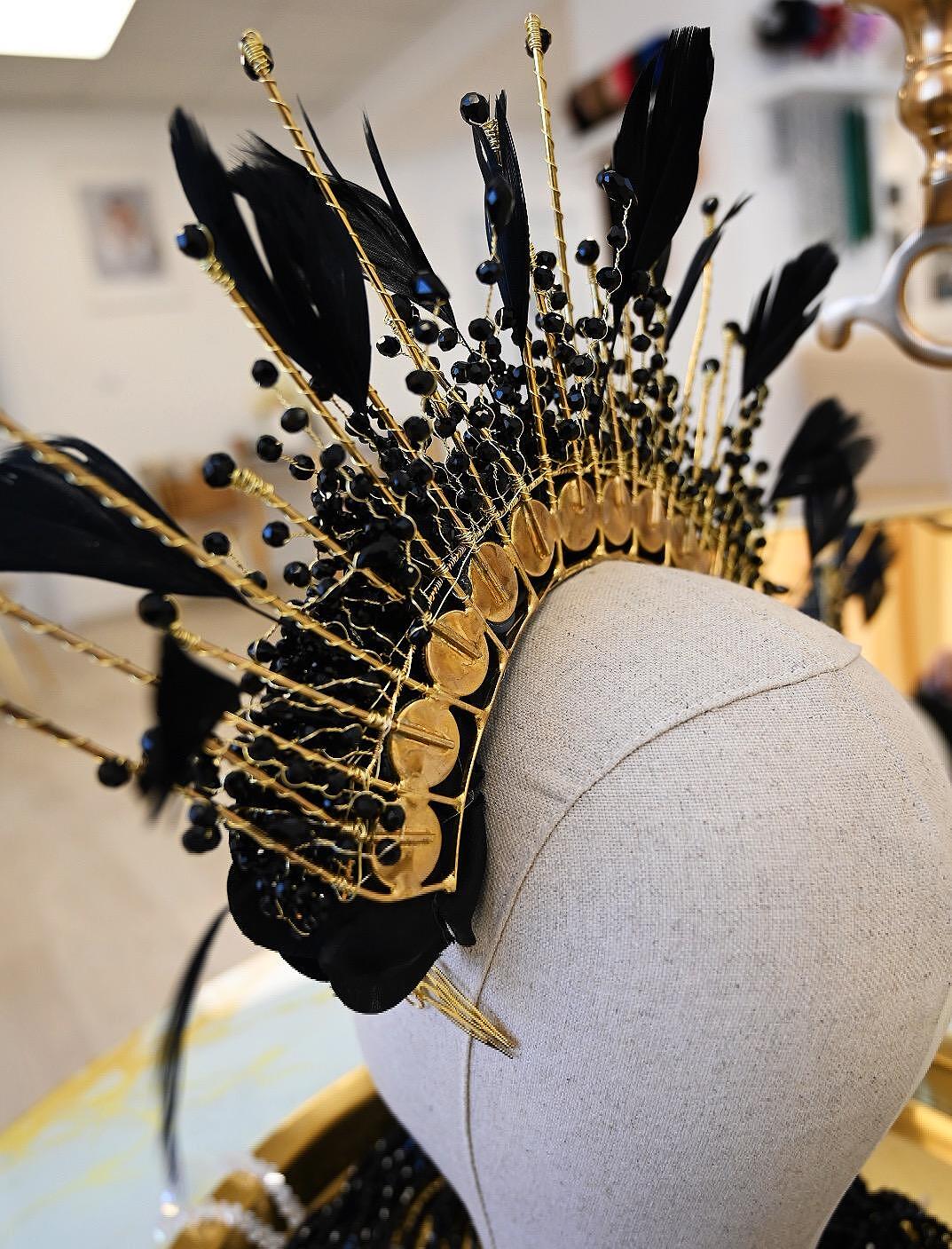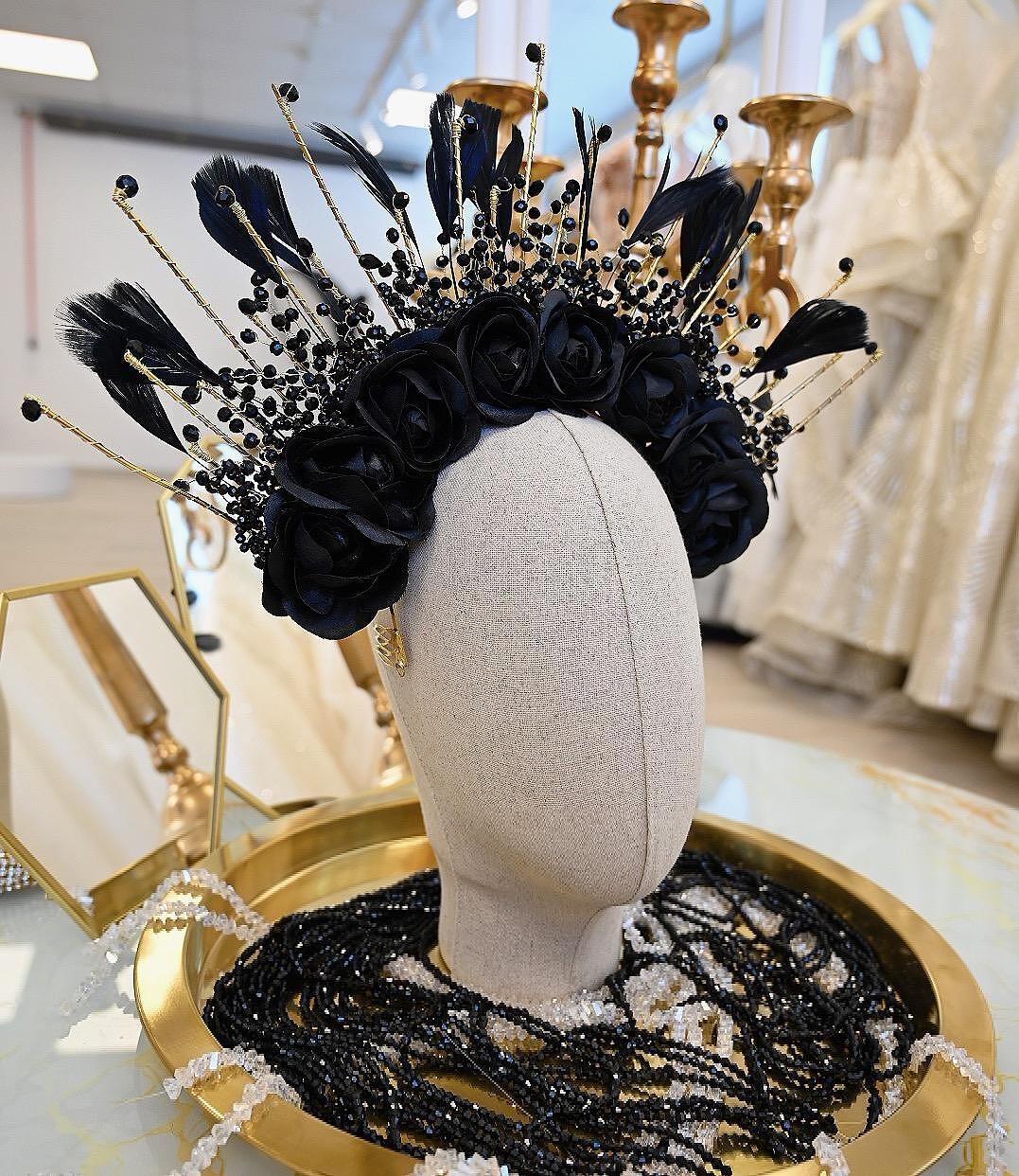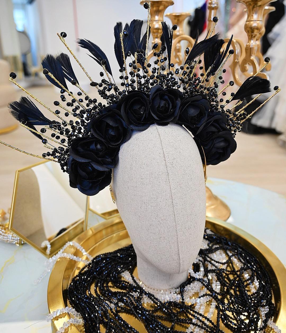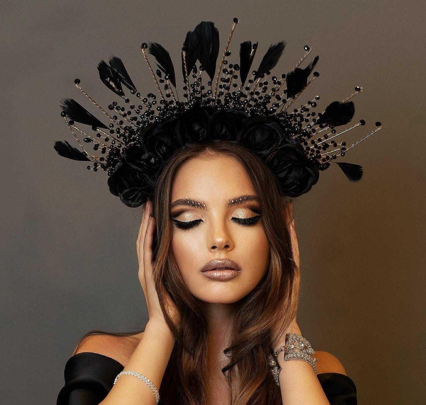 Crown with decorative roses, feathers and beads, suitable stage accessory. Handmade from high quality materials. The size can be adjusted to your head to be comfortable for everyone.
