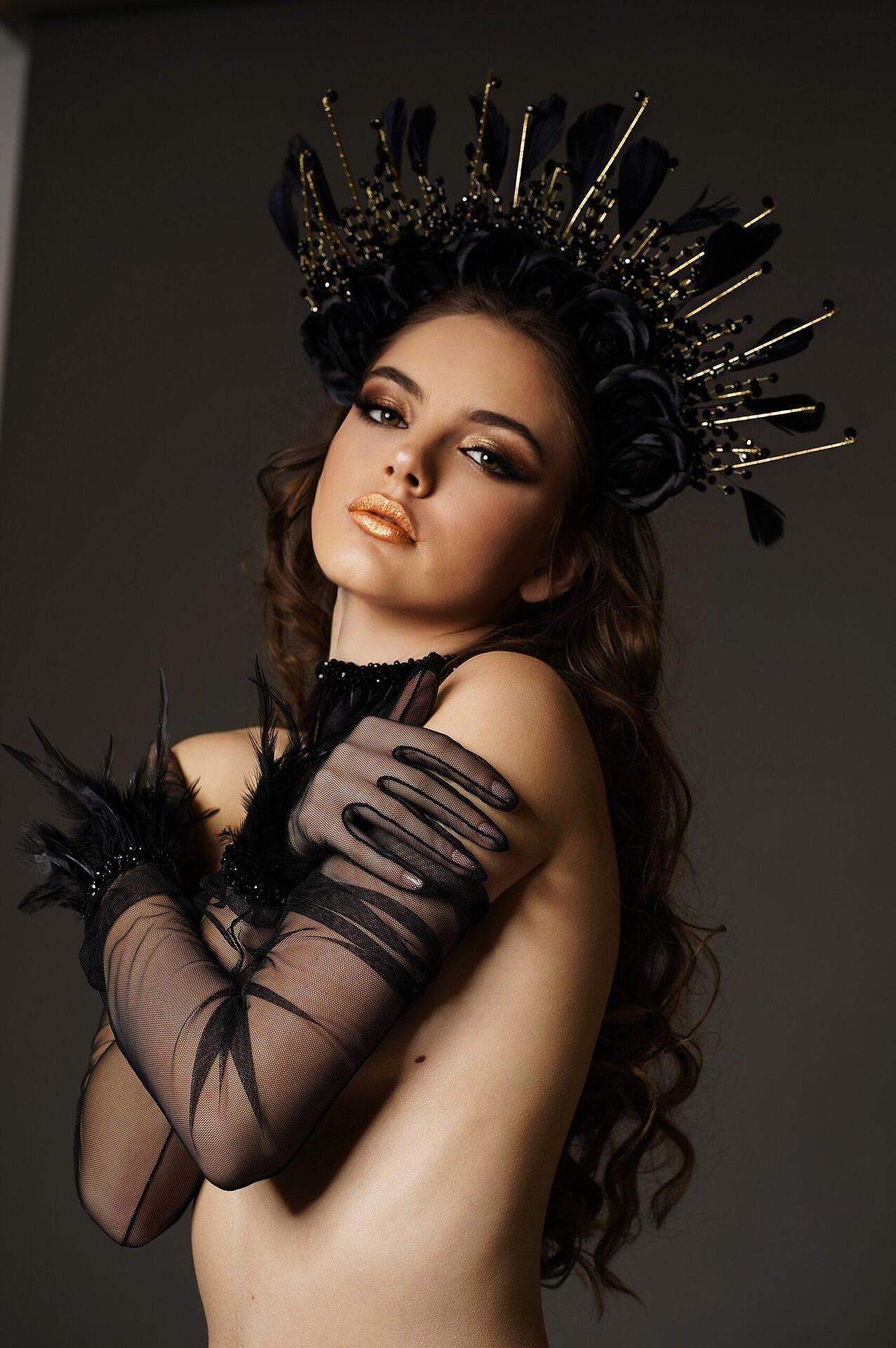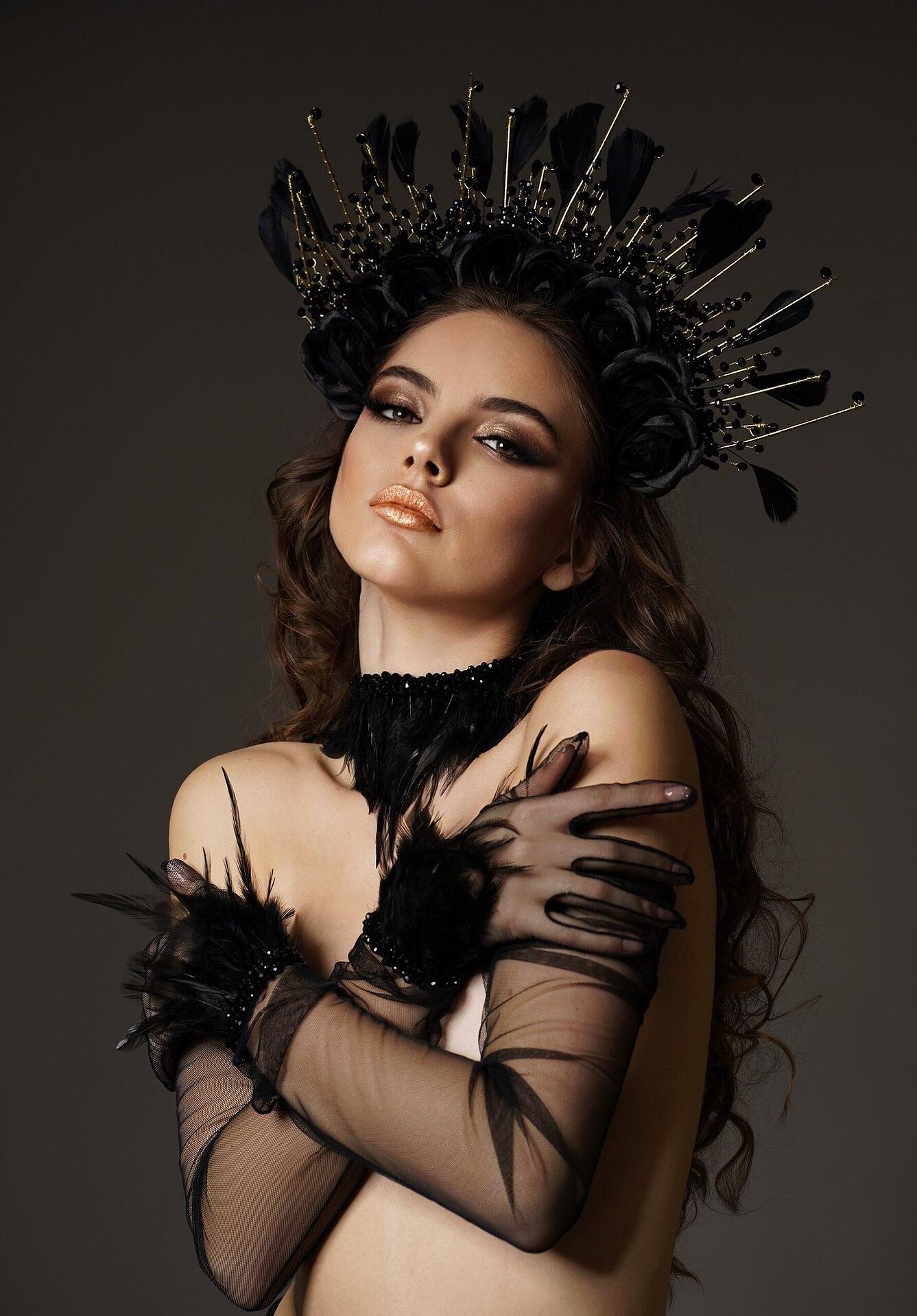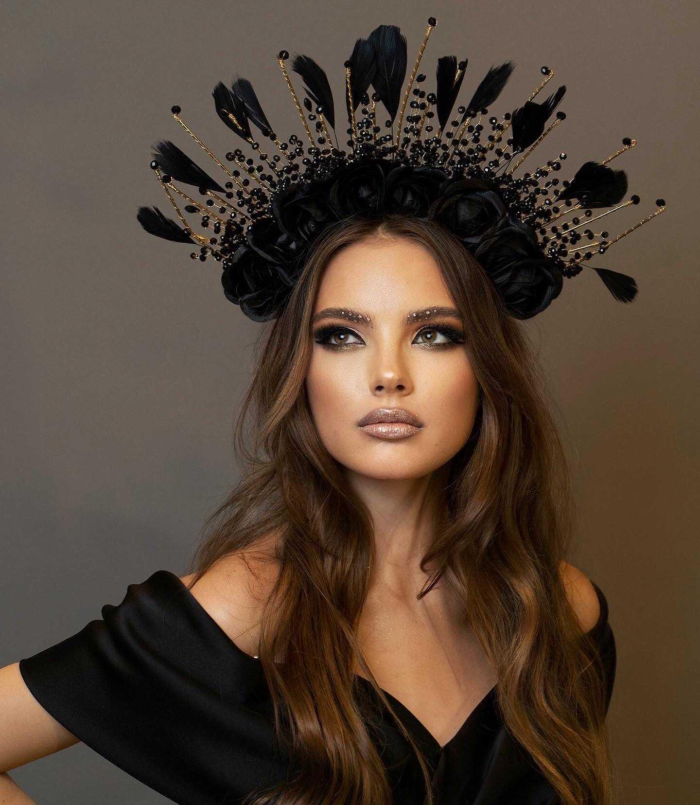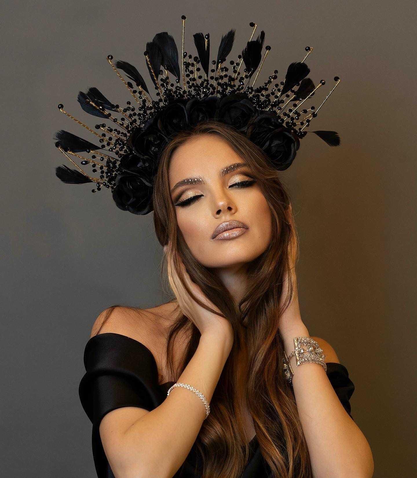 Crown with decorative roses, feathers and beads, suitable stage accessory. Handmade from high quality materials. The size can be adjusted to your head to be comfortable for everyone.
