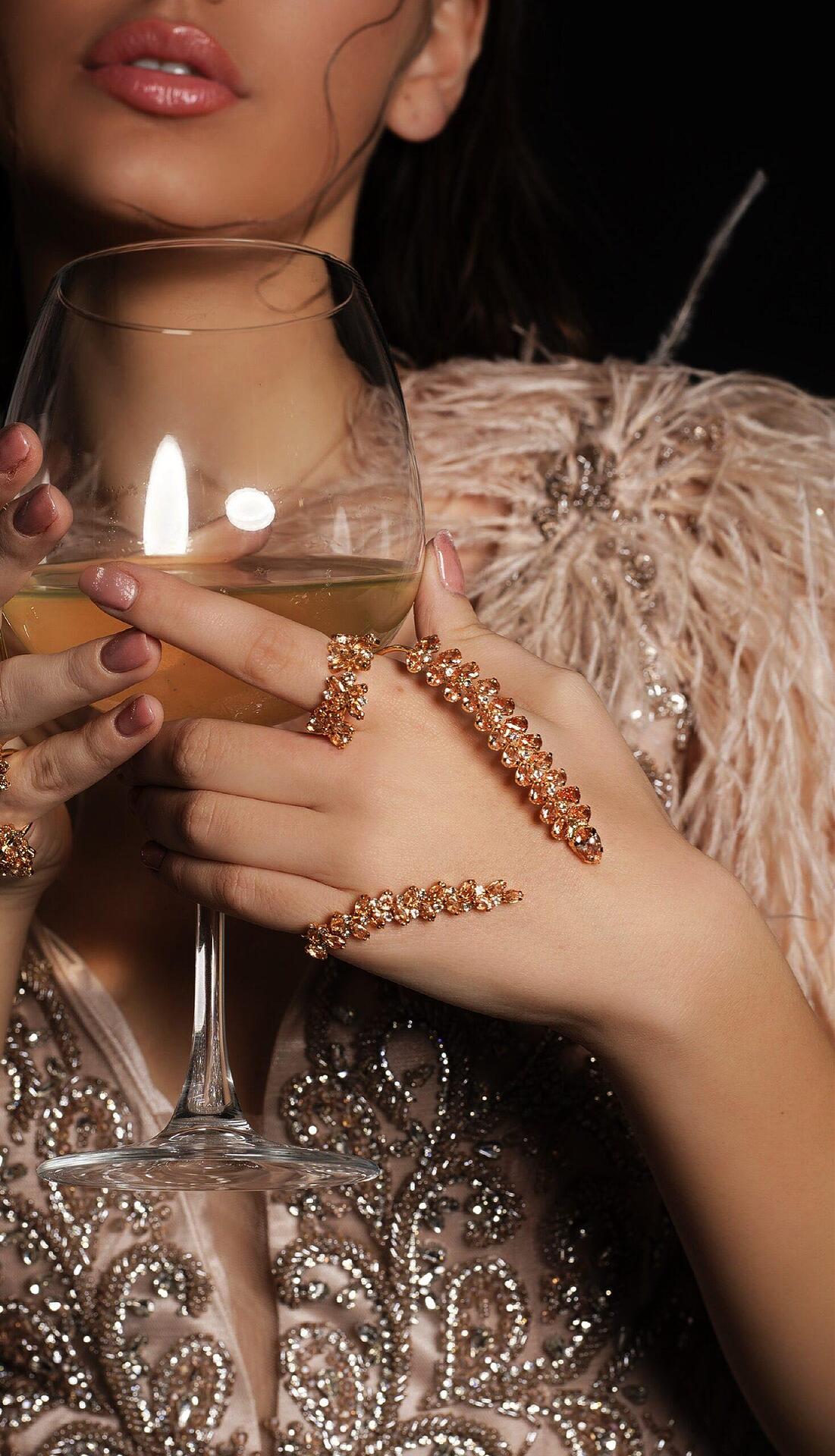 Exquisite gold hand accessory made of zirconium crystals. A suitable finish to your elegant look. The accessory is also suitable for stage performances. It will arrive to you in a luxuriously wrapped gift box.