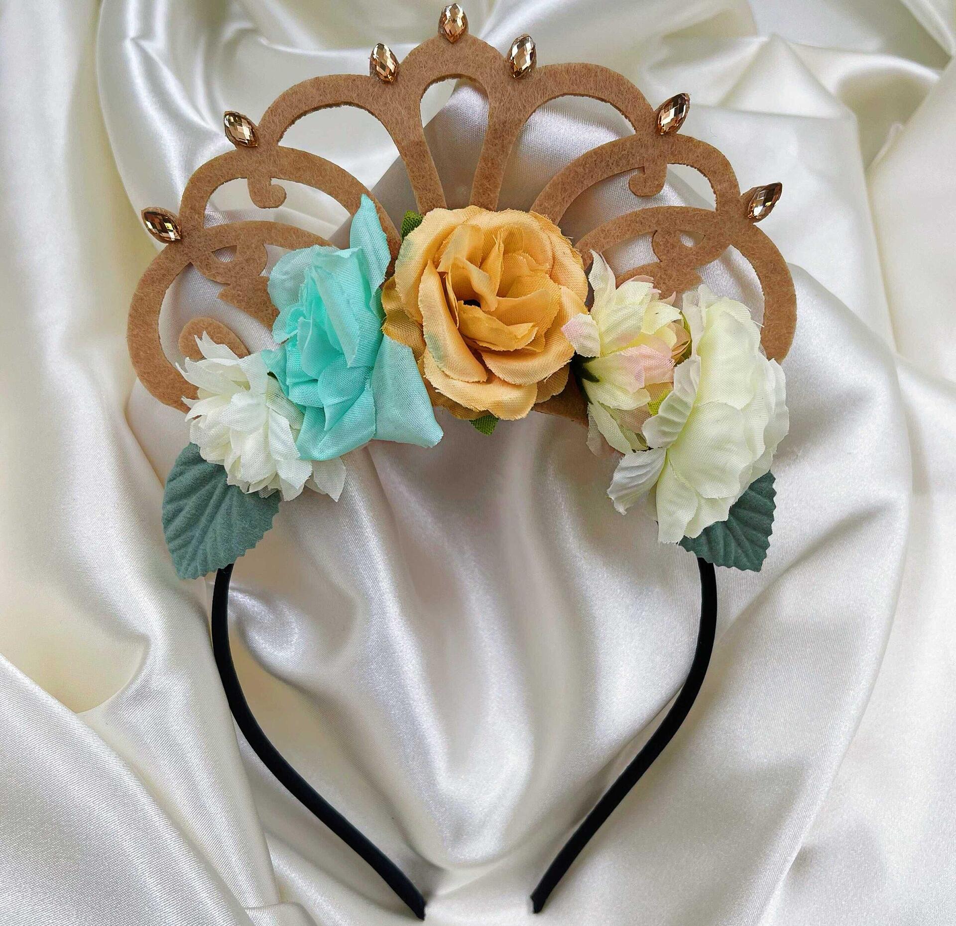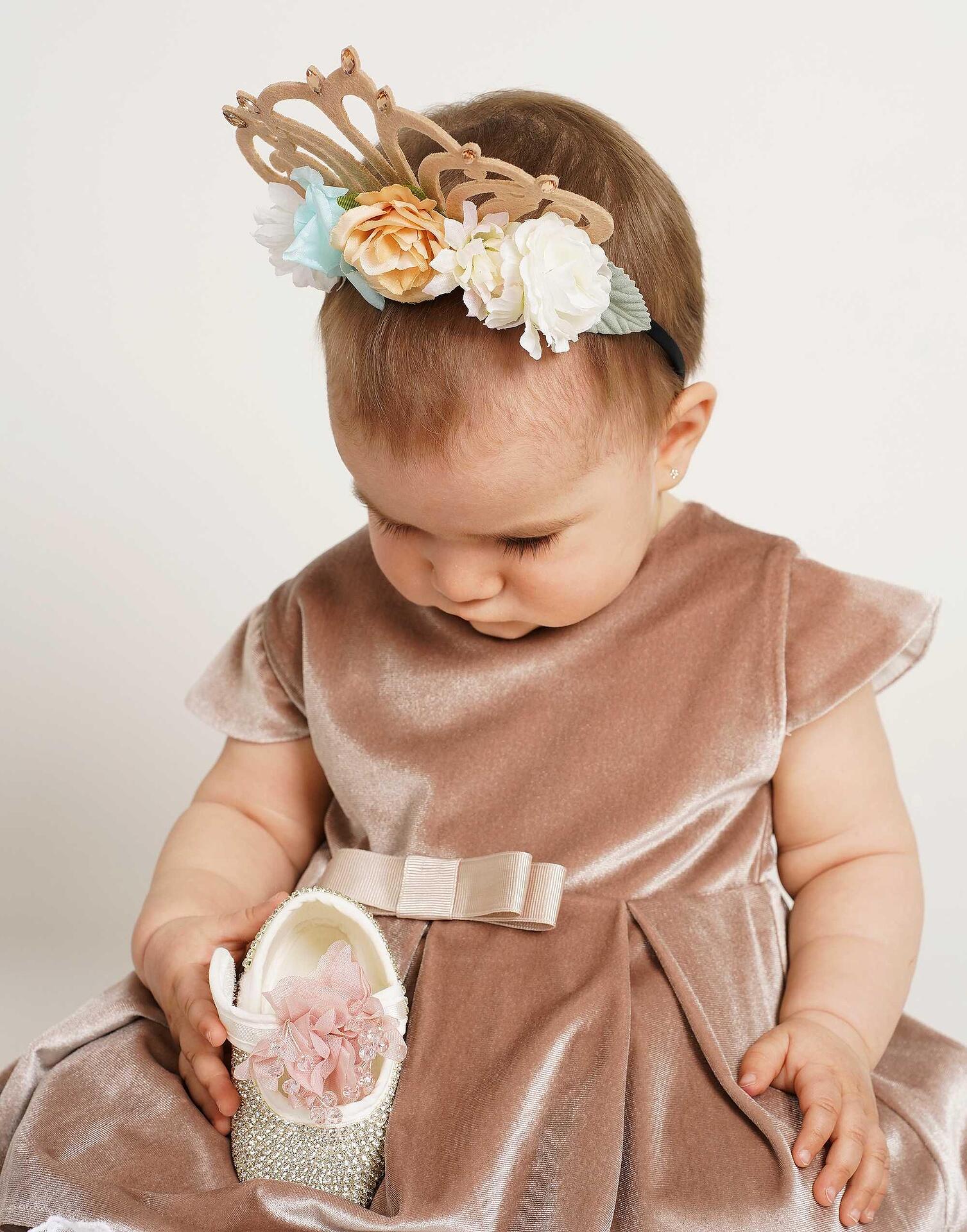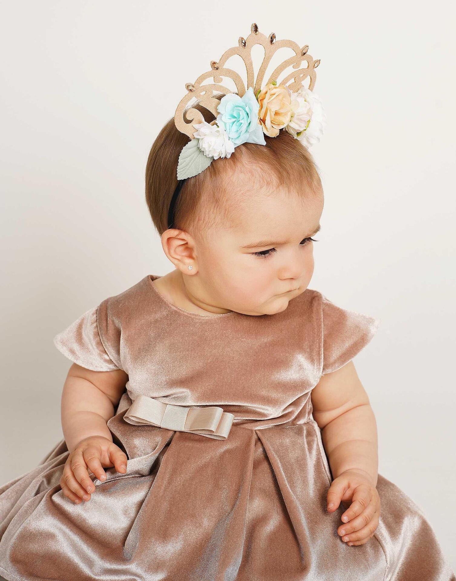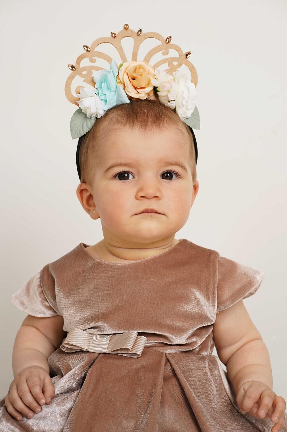 Baby crown with textile flowers and sparkling crystals. Suitable for a baby from 3 - 18 months. A great choice for a gift.