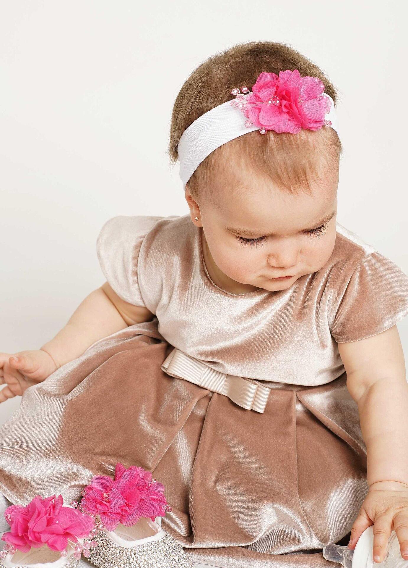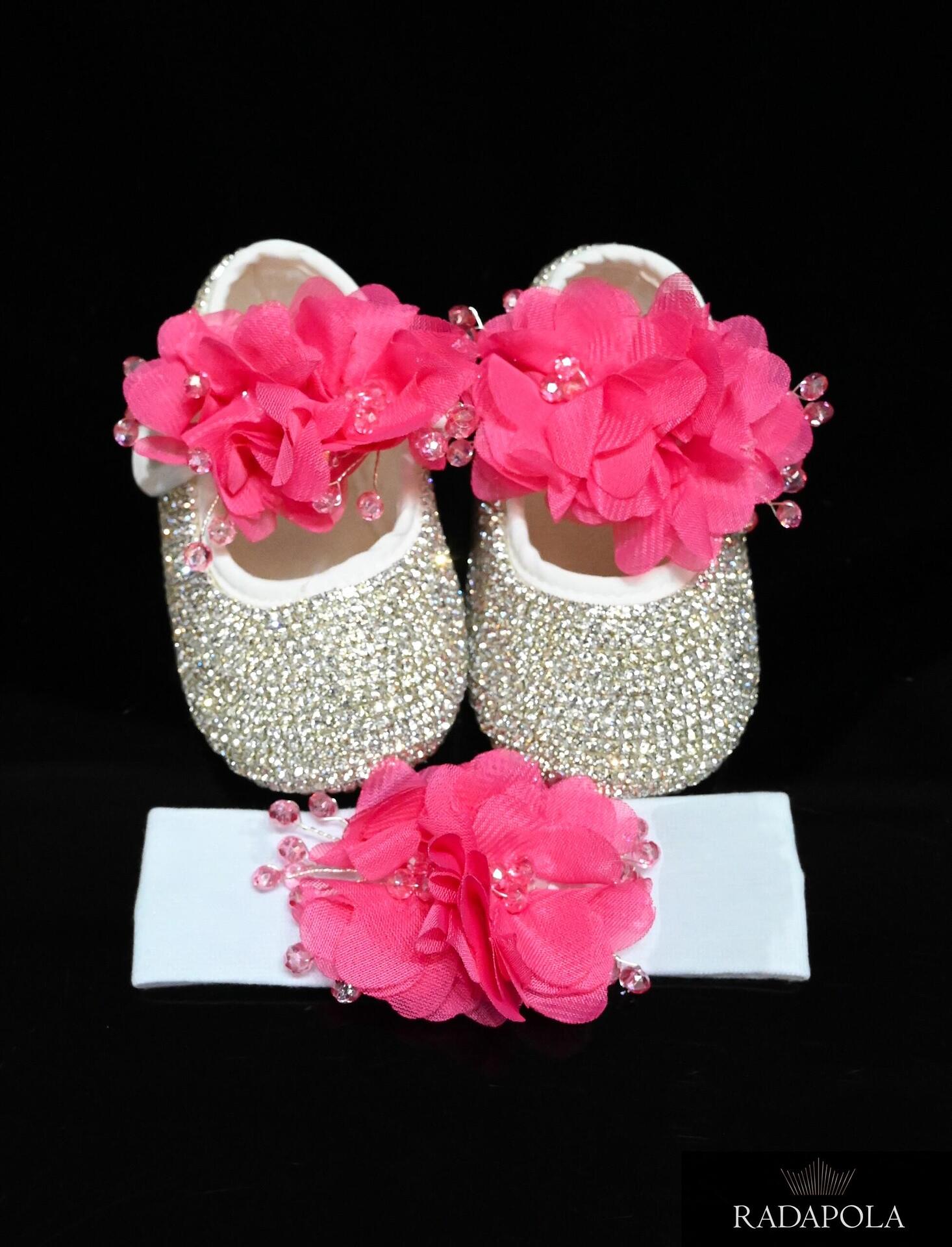 Sparkling children's shoes with crystals, complete with a headband with a ribbon. We have two sizes - 4 and 8, 8 and 12 months. The base of the shoe is soft and extremely comfortable for the child's foot, because it does not tighten anywhere.