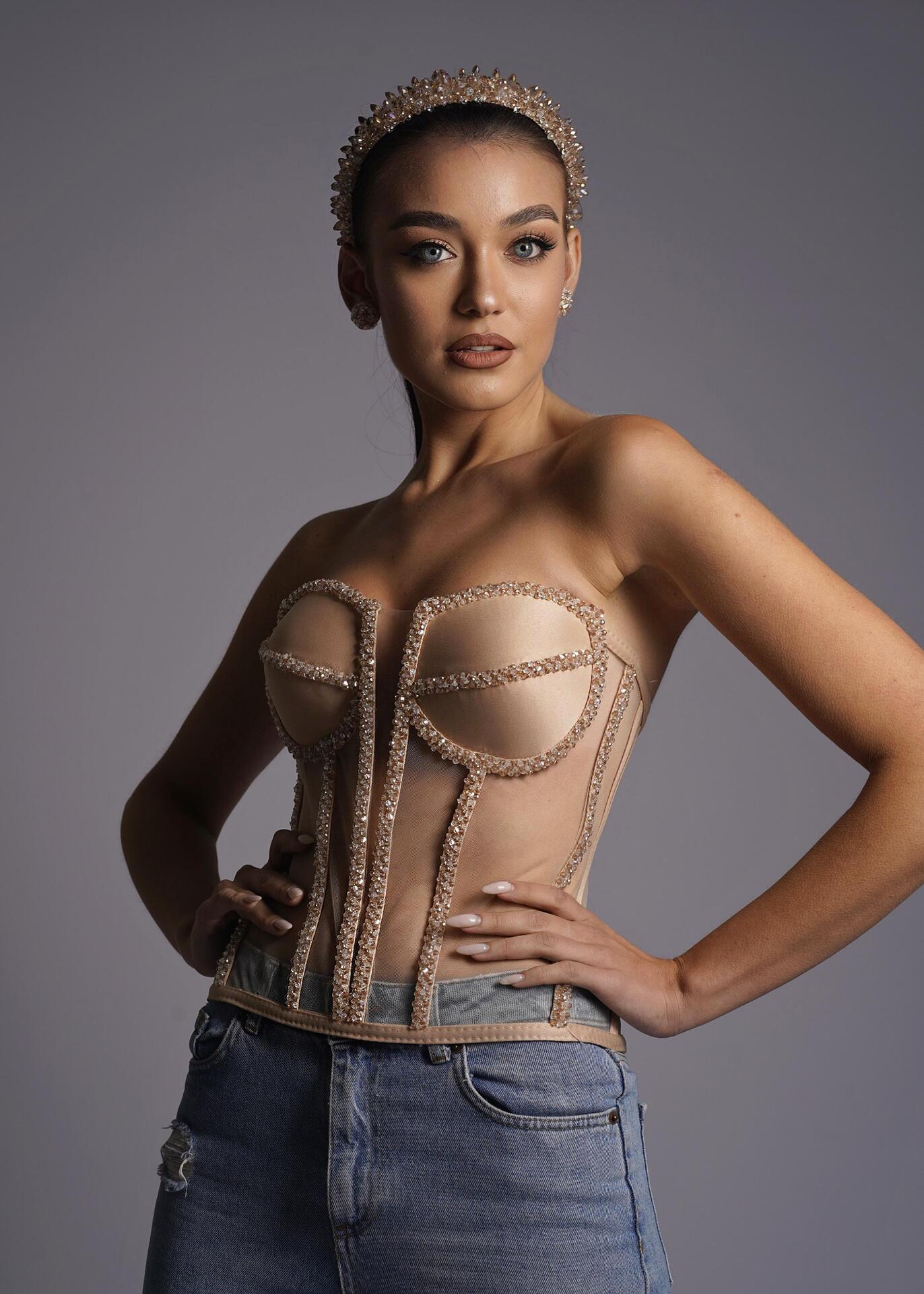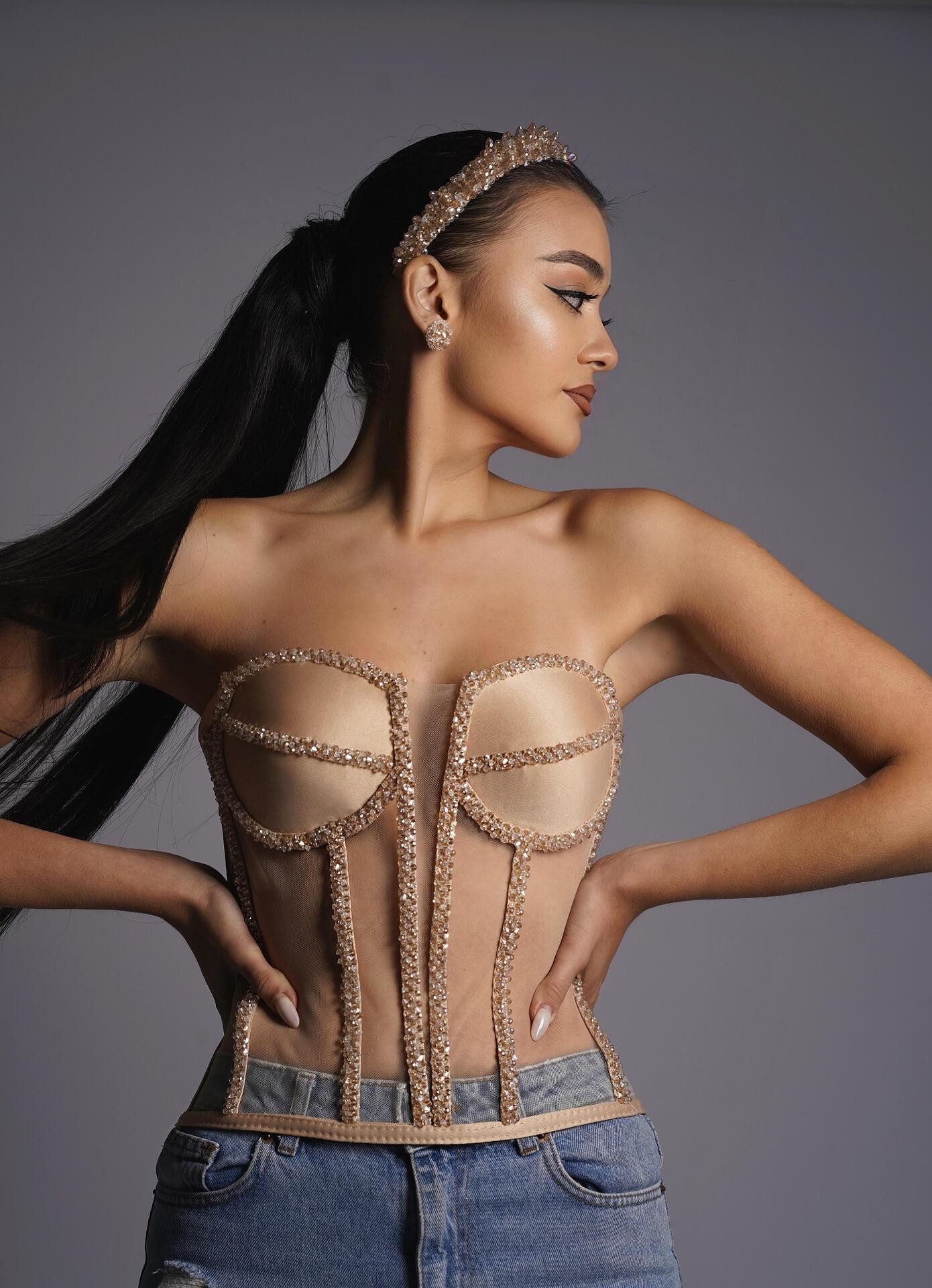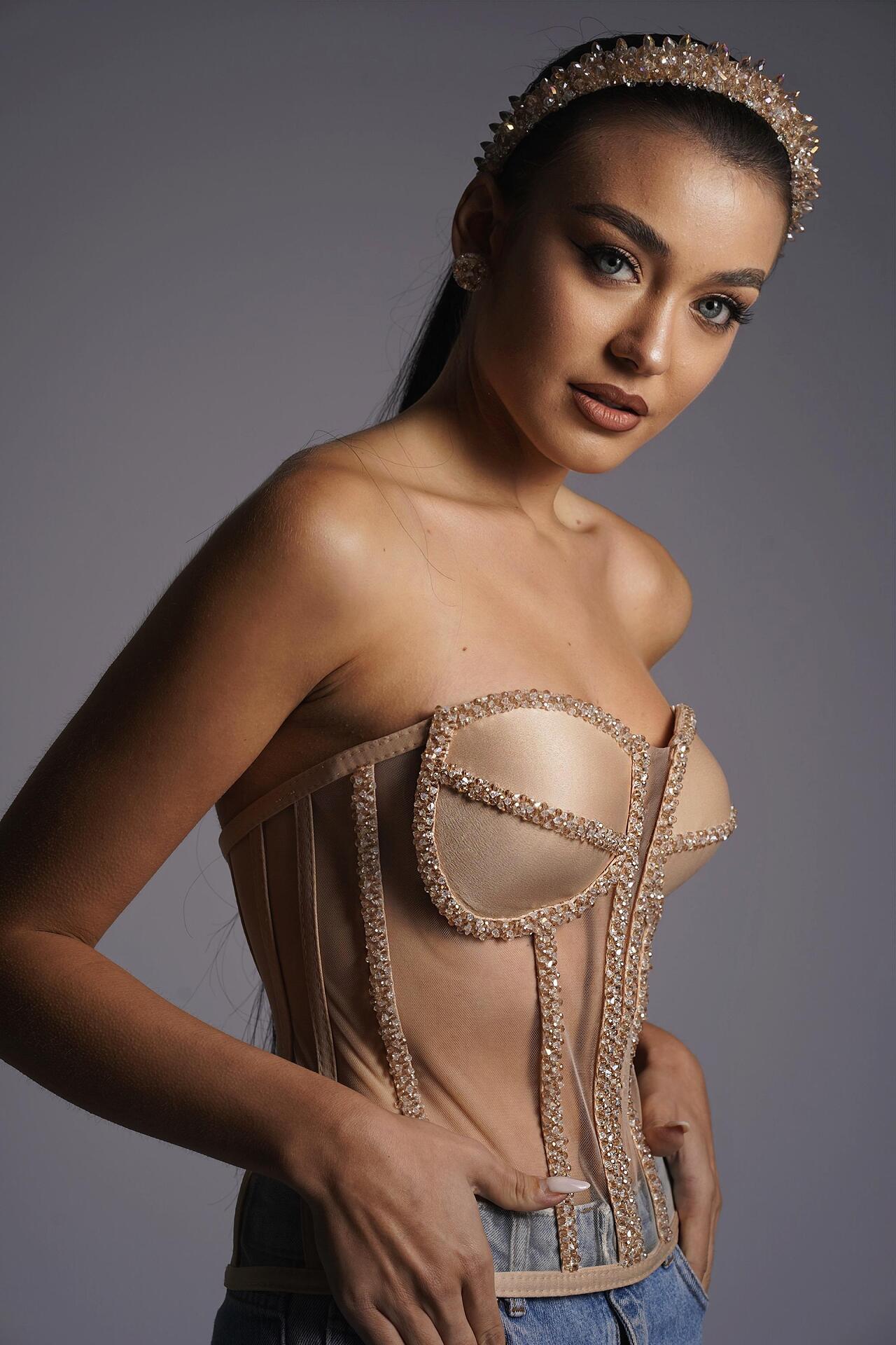Luxurious beige corset, trimmed with black crystals and faceted beads.