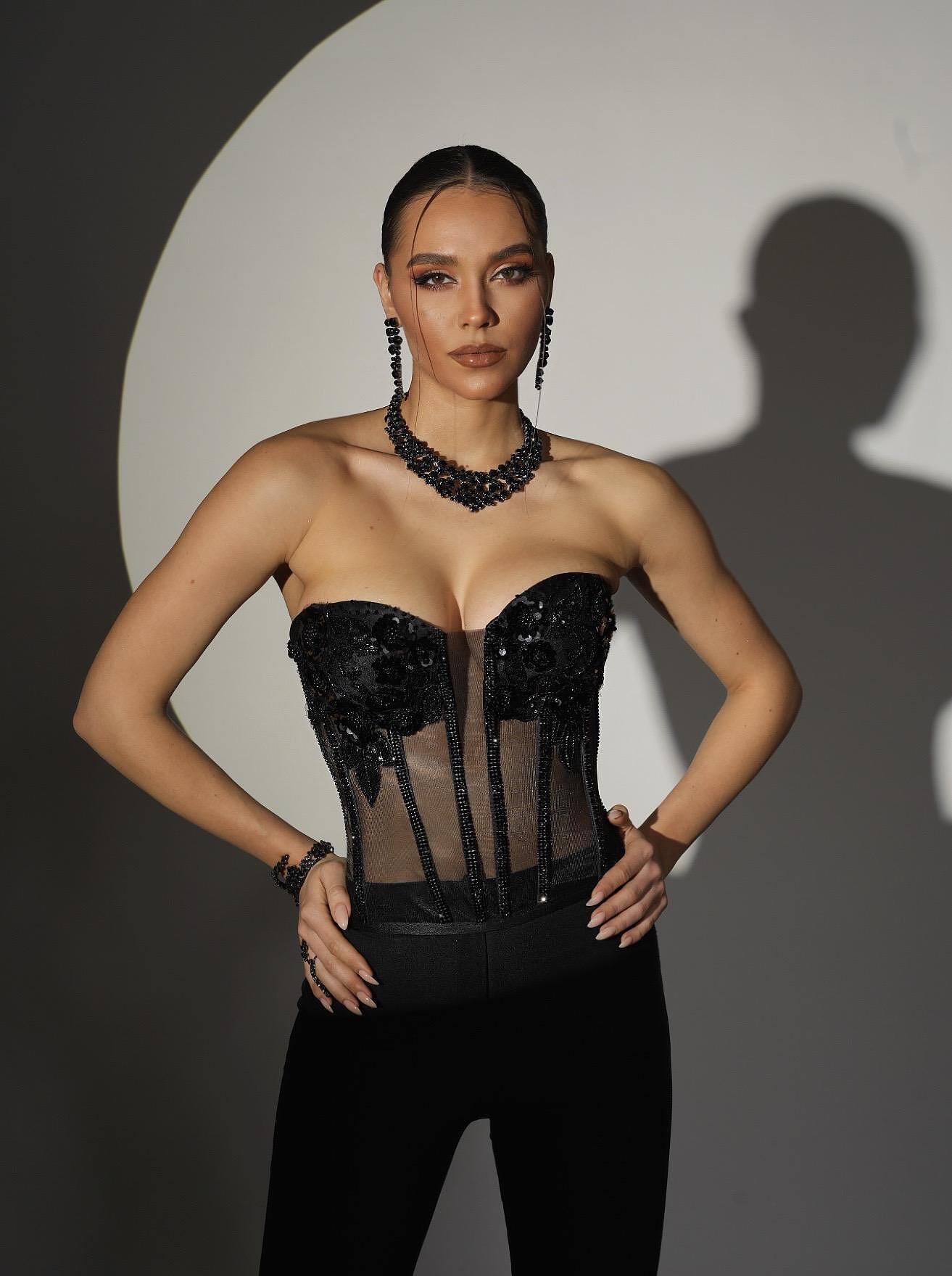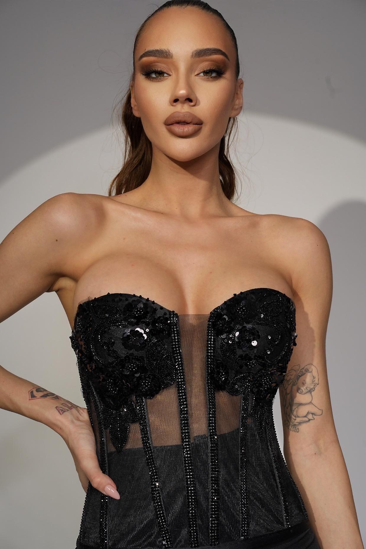 Luxurious black corset, sewn with black crystals, sequins and faceted beads. It has a fine mesh detail. Limited edition. It is made of high quality materials. The neckline is heart-shaped.