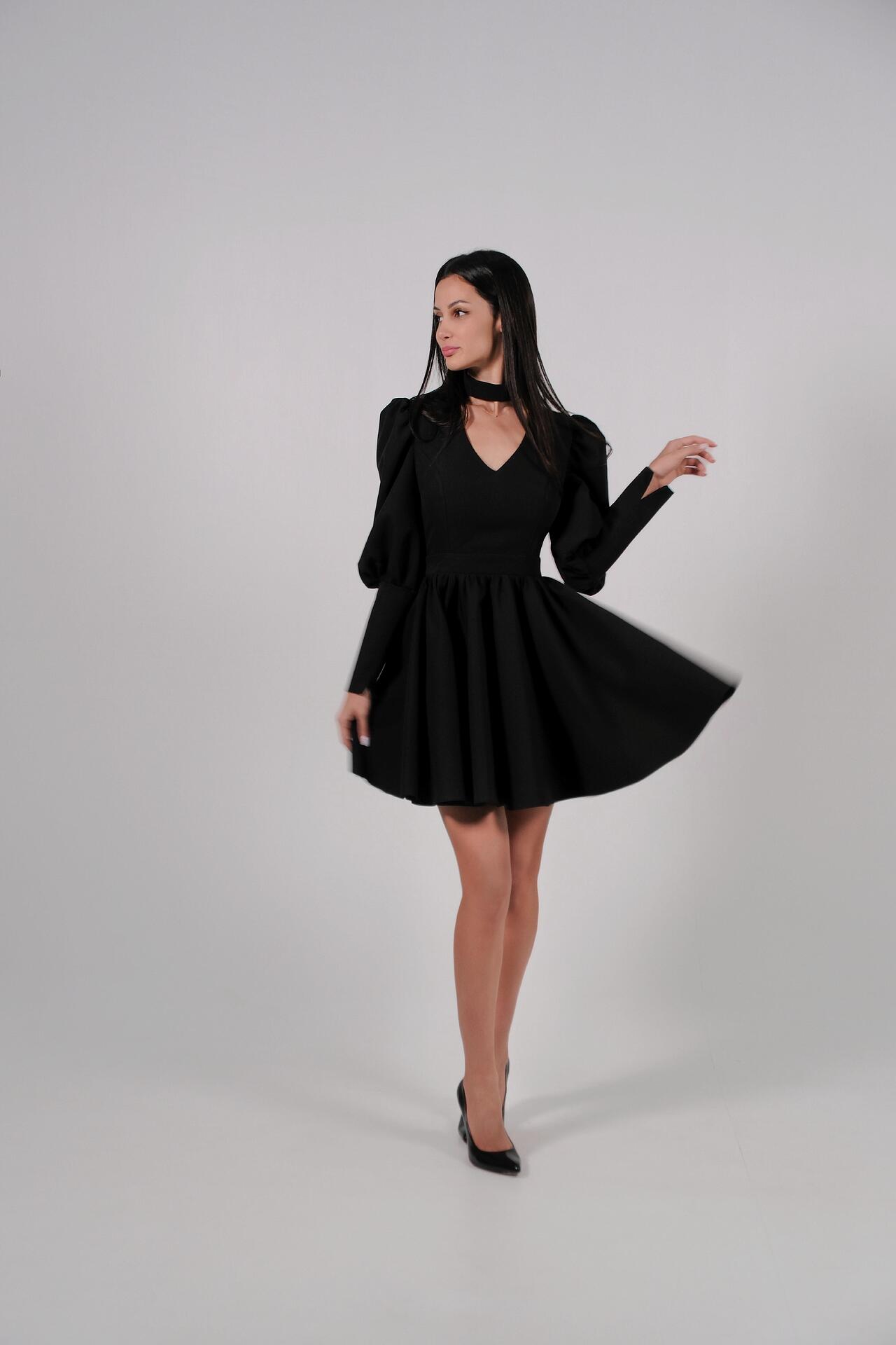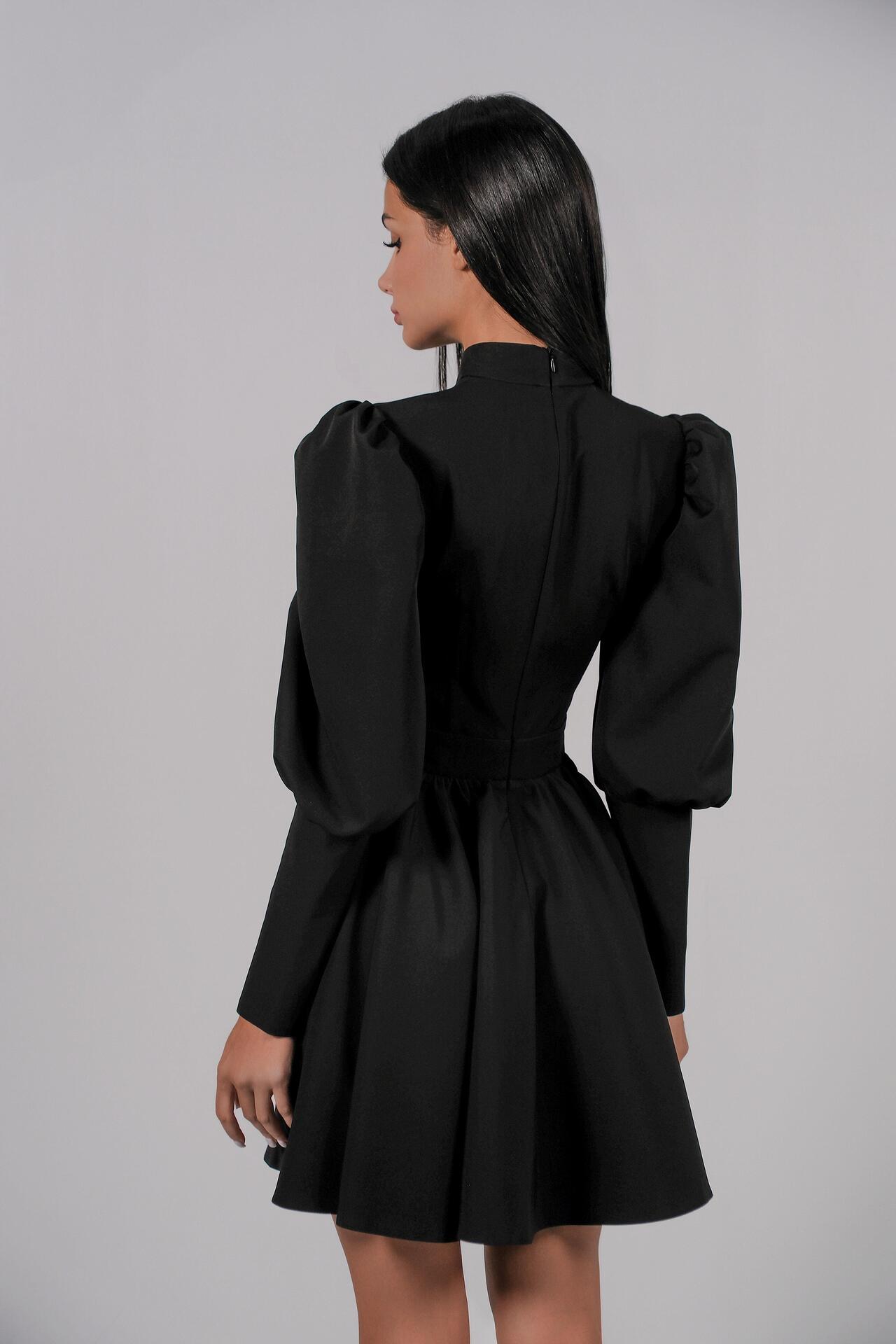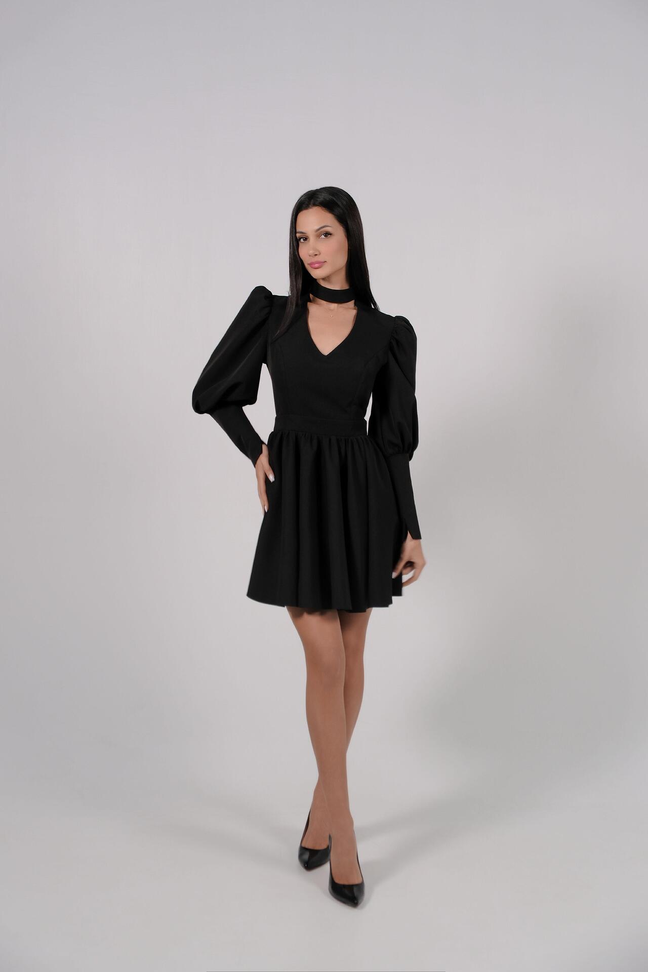 An elegant short dress with a classic A-line silhouette that combines style and comfort. The fluffy puff sleeves add volume, the neckline emphasizes and completes the look. The light and comfortable fabric gives the skirt a graceful movement, making it ideal for both special occasions and sophisticated evenings.