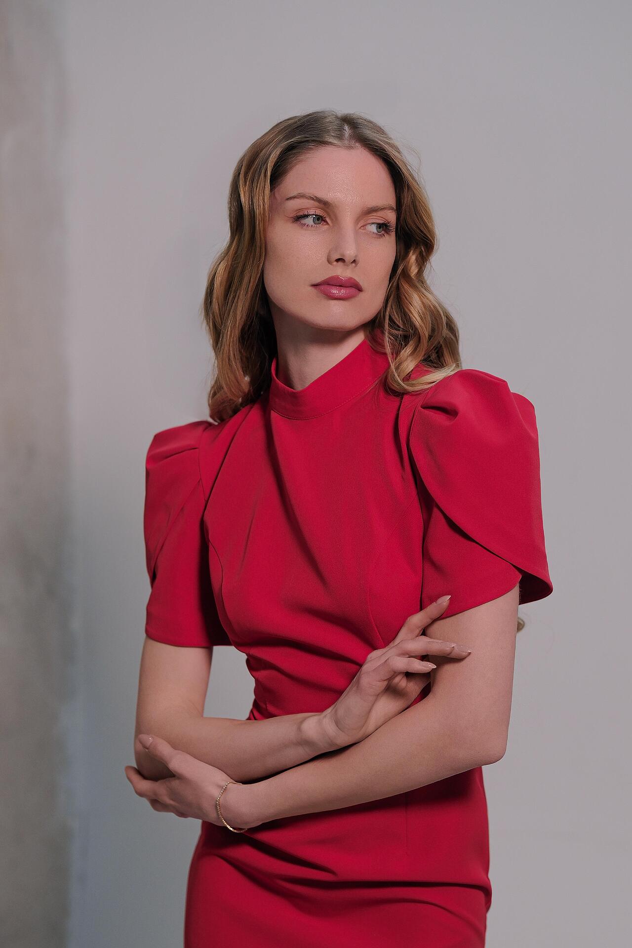 Elegant dress in deep red. The top has a high collar and structured voluminous sleeves. The back has impressive decorative buttons and a delicate opening that adds elegance and femininity. The skirt has a straight silhouette and a slight narrowing at the bottom, providing an elongated and stylish look.