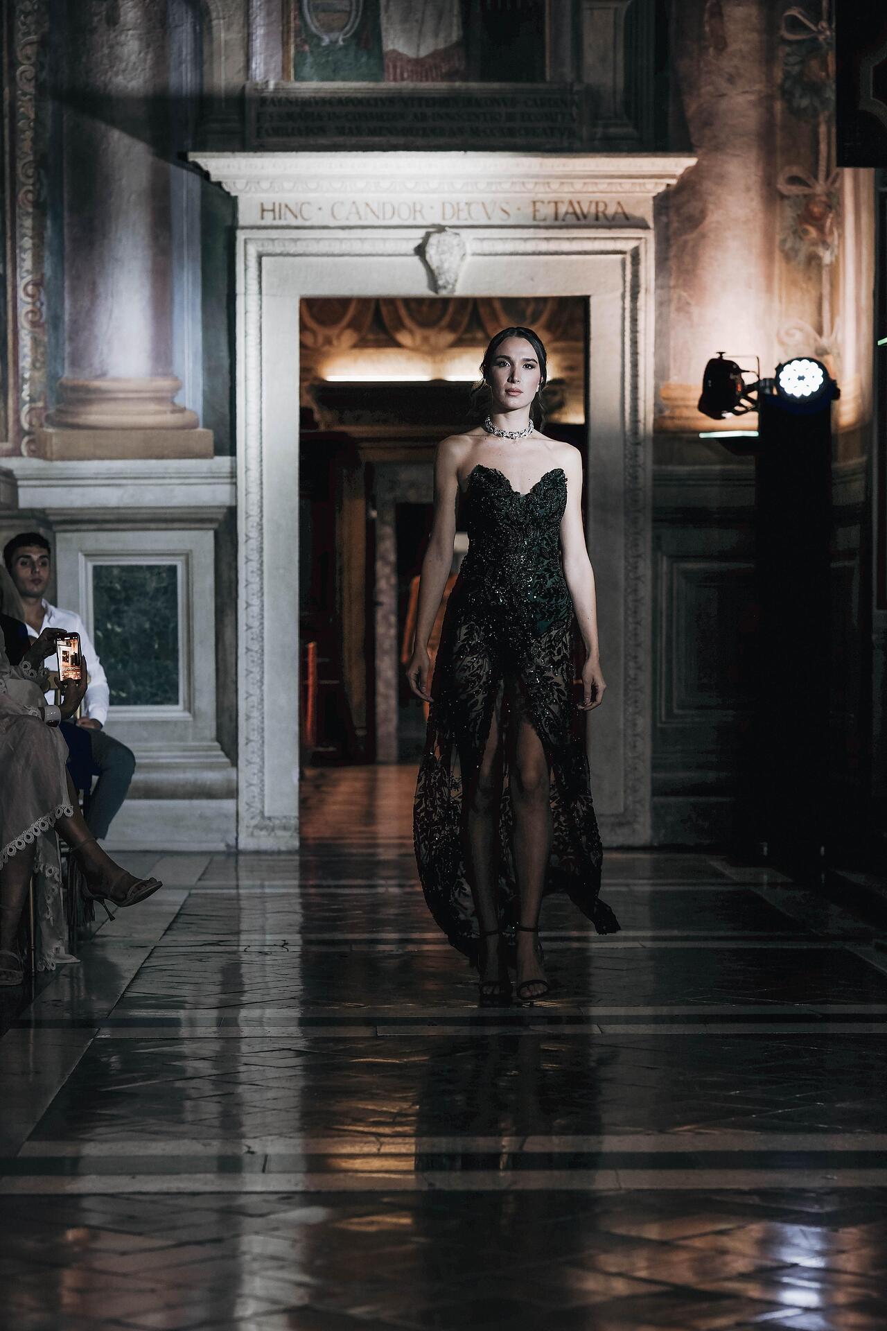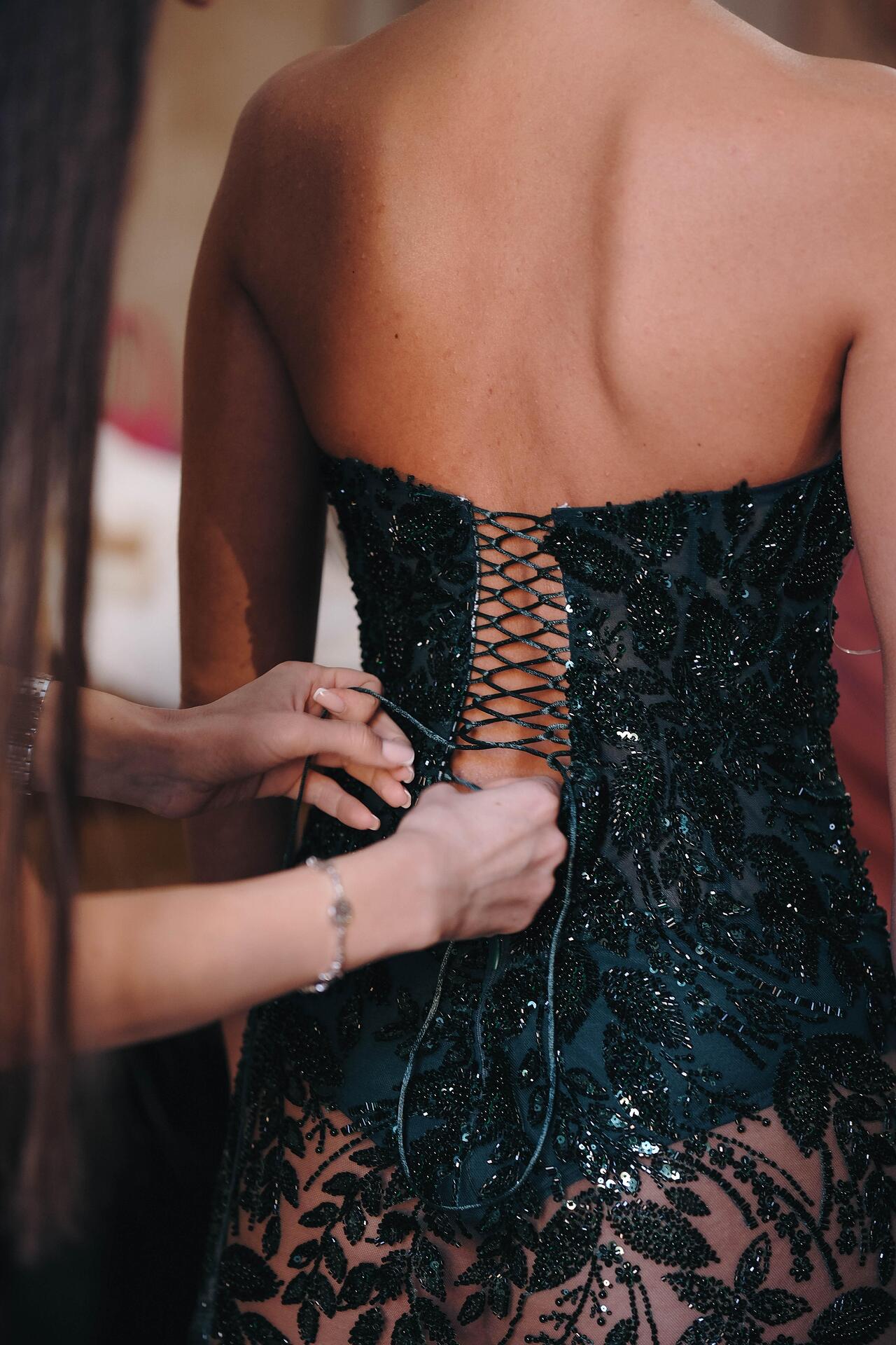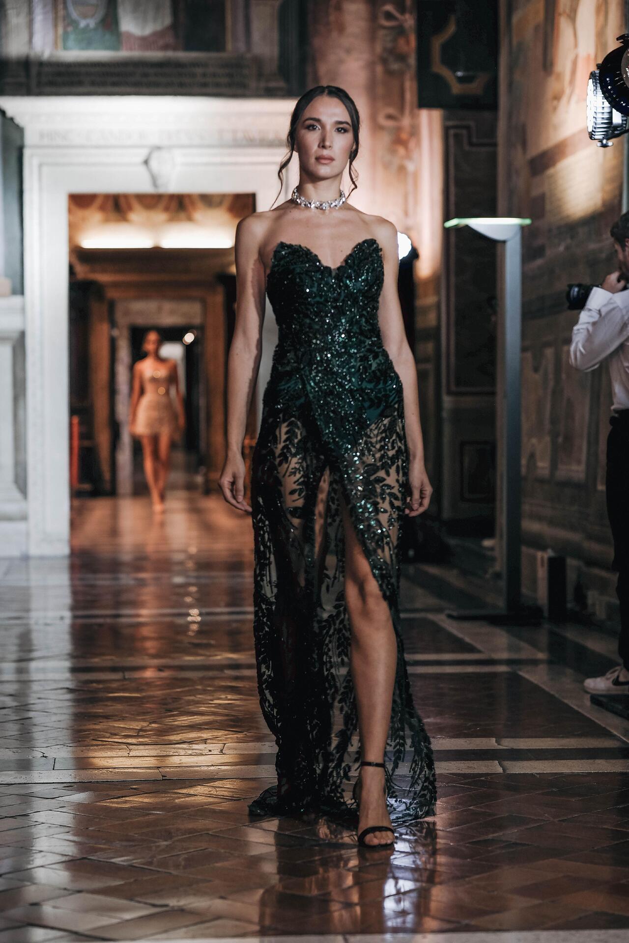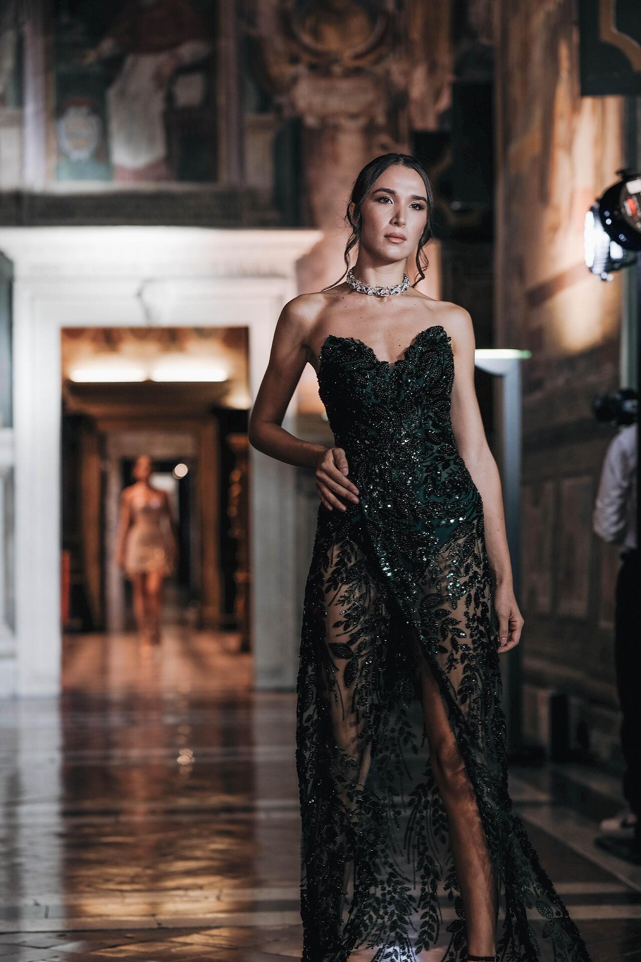Spectacular translucent corset dress. The top has a built-in corset that smoothly transitions into sewn-in underwear. This allows the top layer of the dress to be translucent. It has a high slit and an incredible shimmering effect. Strapless.