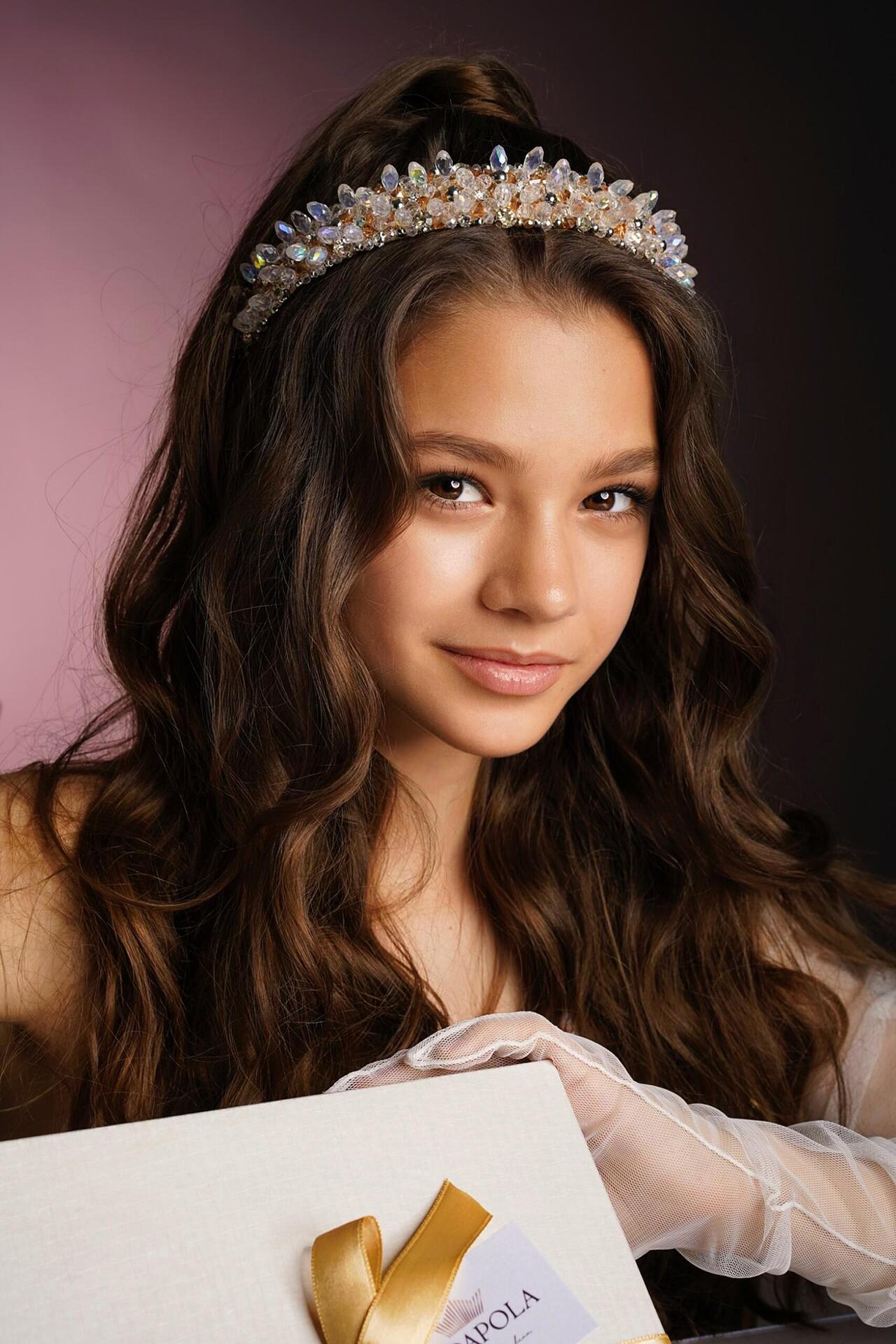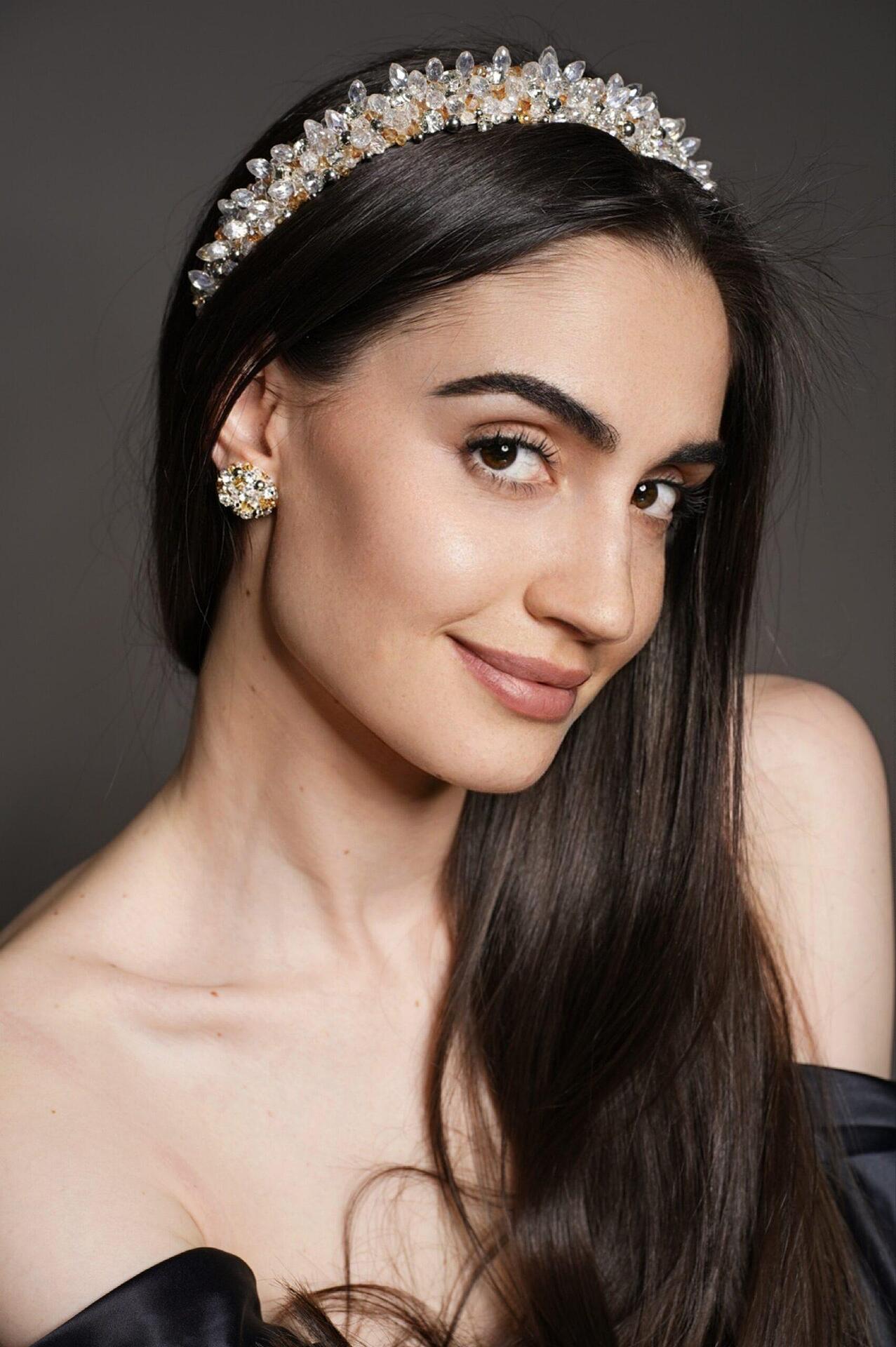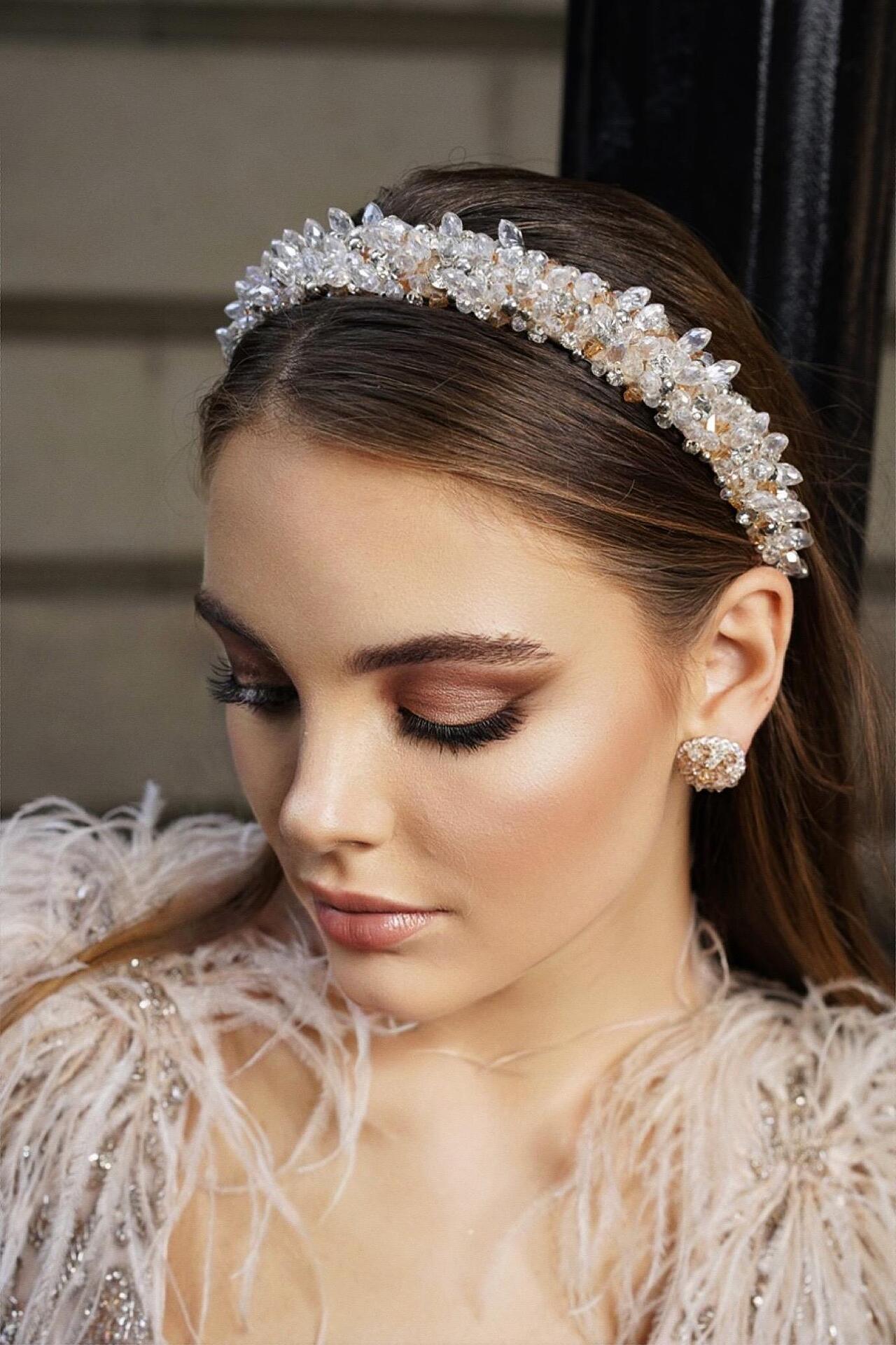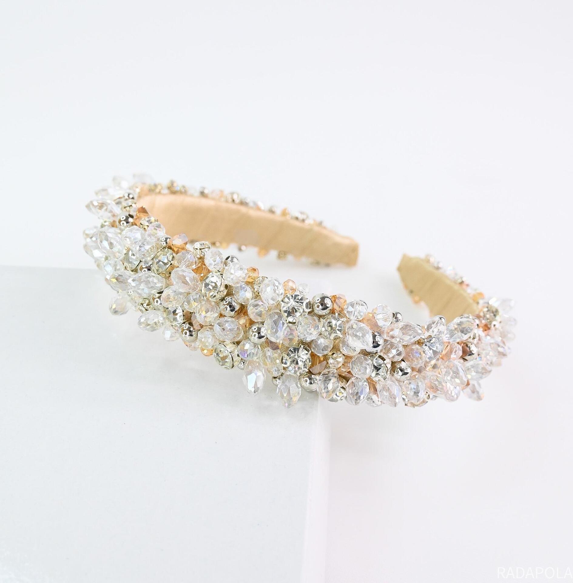 The base of the tiara is wrapped with a delicate satin ribbon. High-quality crystals and beads are sewn to it. High-quality hard cord was used during sewing, which is extremely strong and holds the crystals tightly on the accessory. The tiara is 3 cm wide. Completely handmade. The size can be adjusted to your head to be comfortable for everyone.