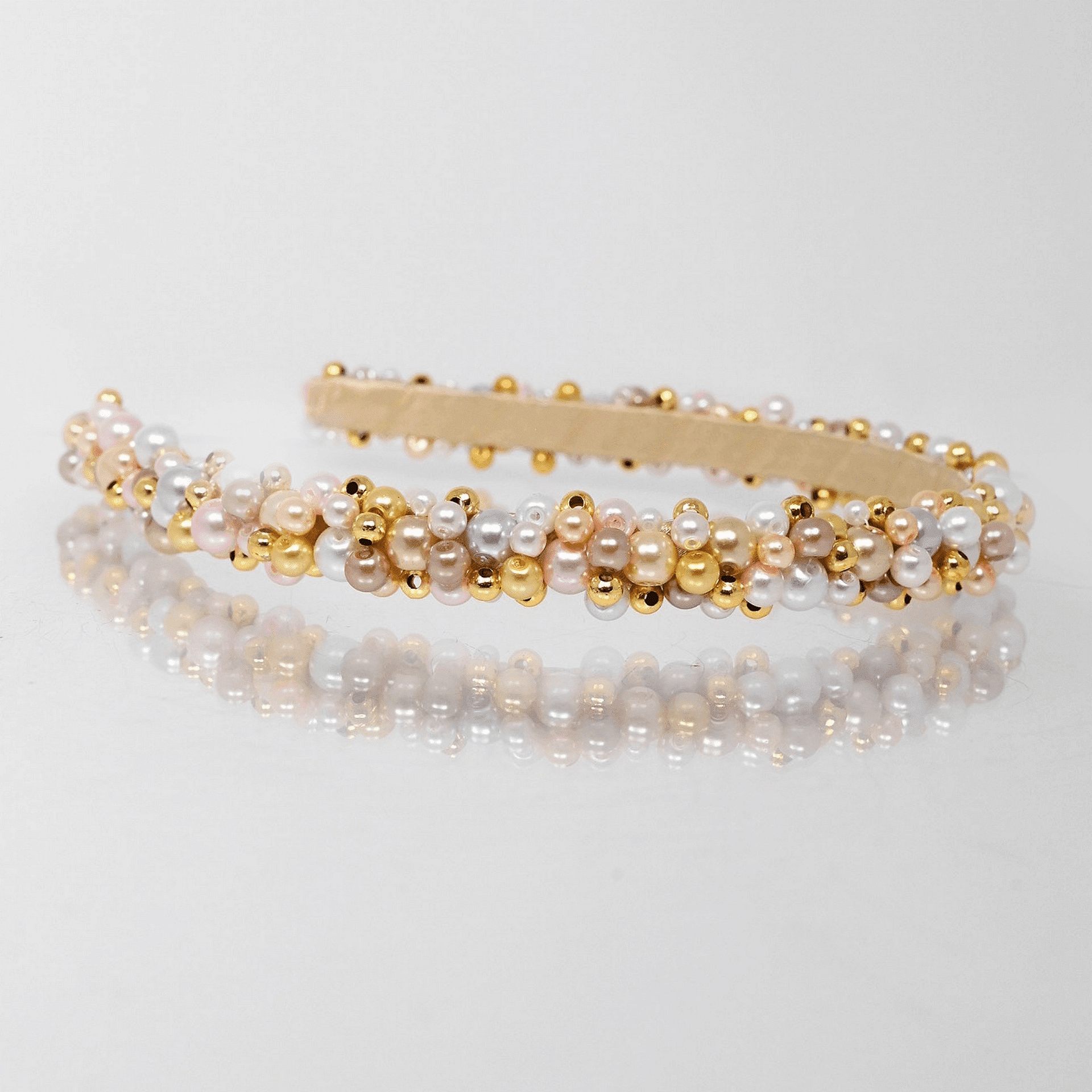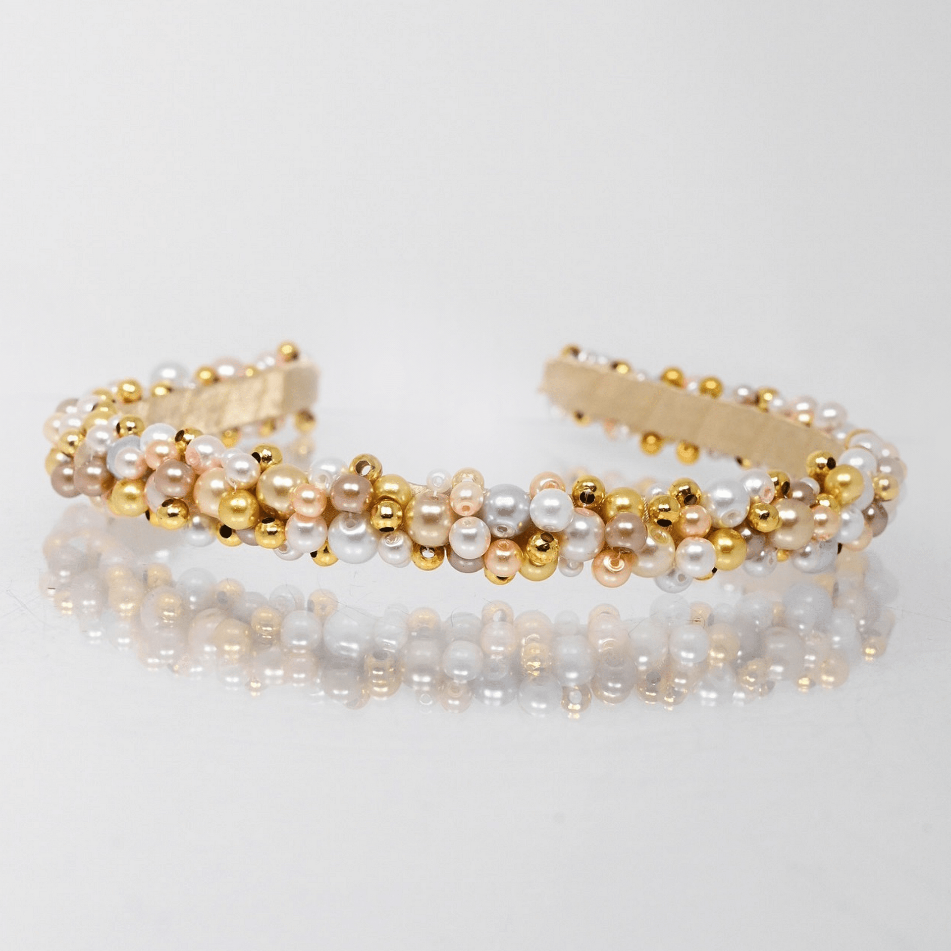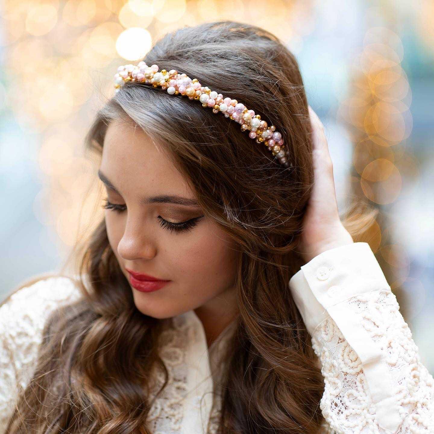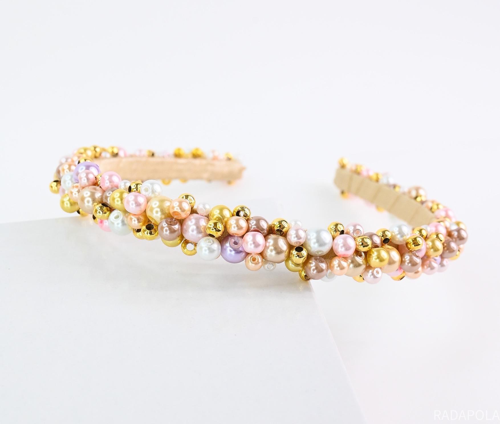 Tiara sewn entirely with pearls and beads. Delicate and light. A hard cord was used that holds the crystals firmly and tightly at the base of the tiara. Handmade from high quality materials. The size can be adjusted to be comfortable for everyone. About 1.2 cm wide.