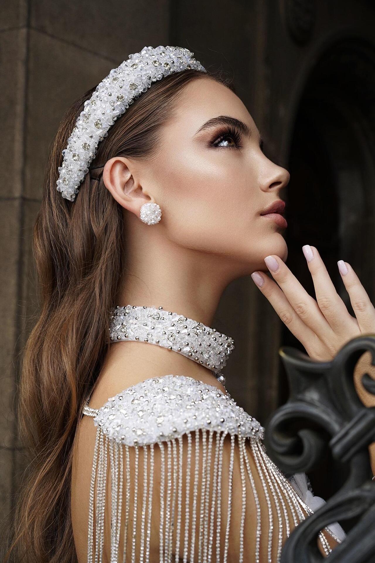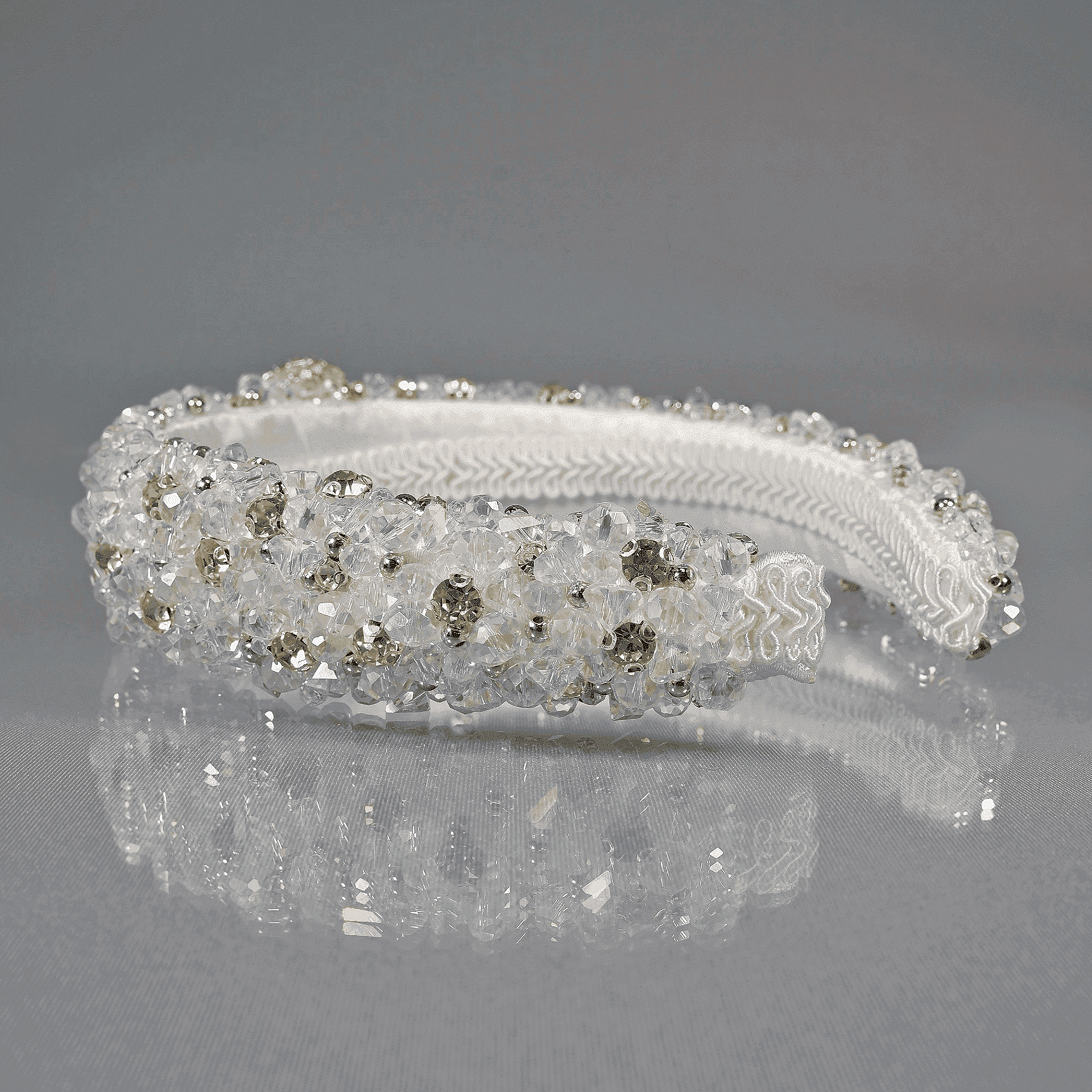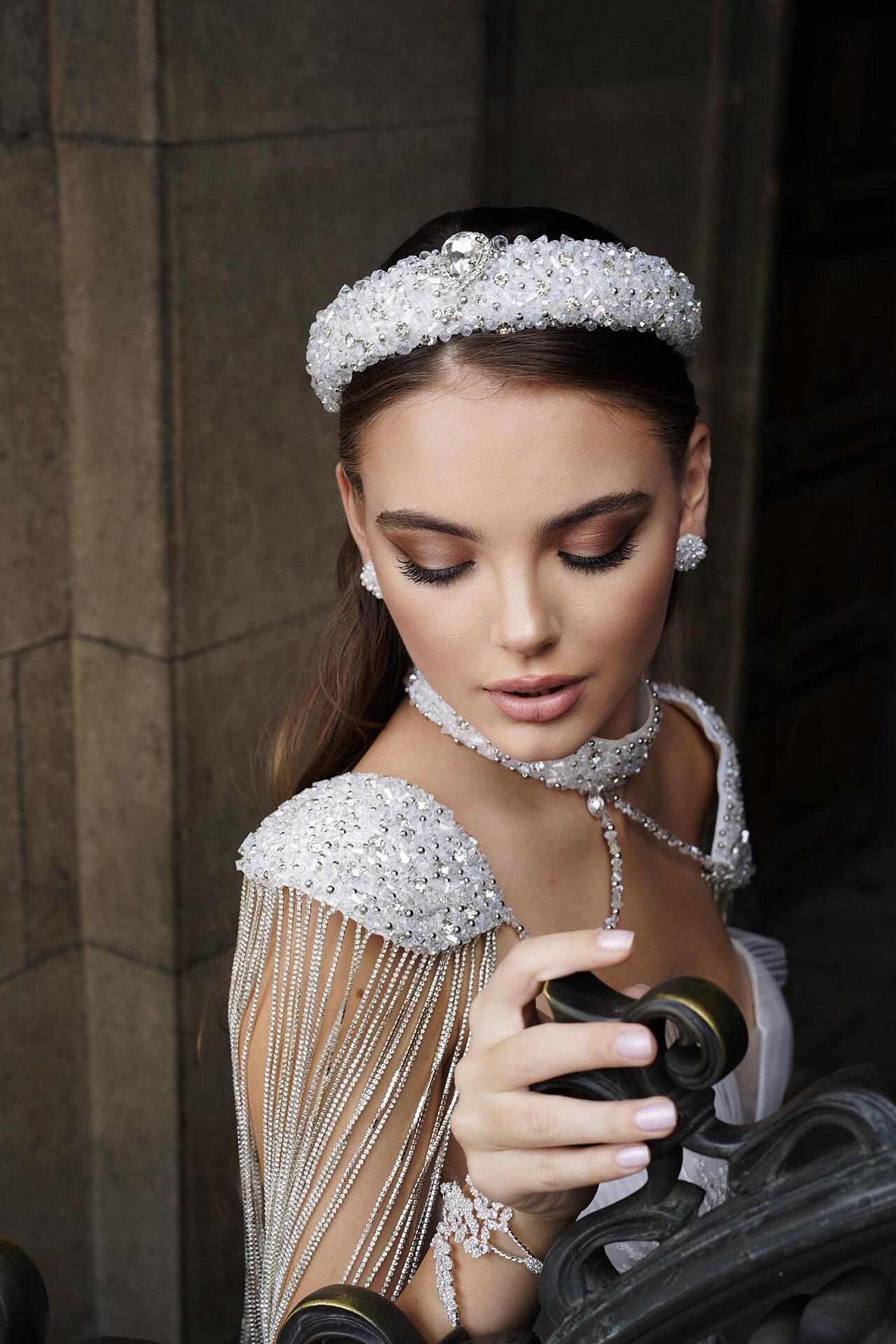 Tiara sewn entirely with crystals and beads. Delicate and light. A hard cord is used that holds the crystals firmly and tightly at the base of the tiara. Handmade from high-quality materials. The size is universal and cannot be adjusted.
