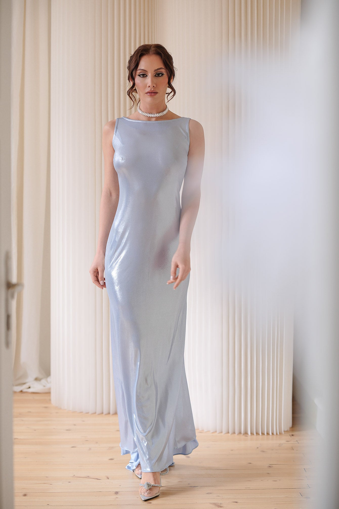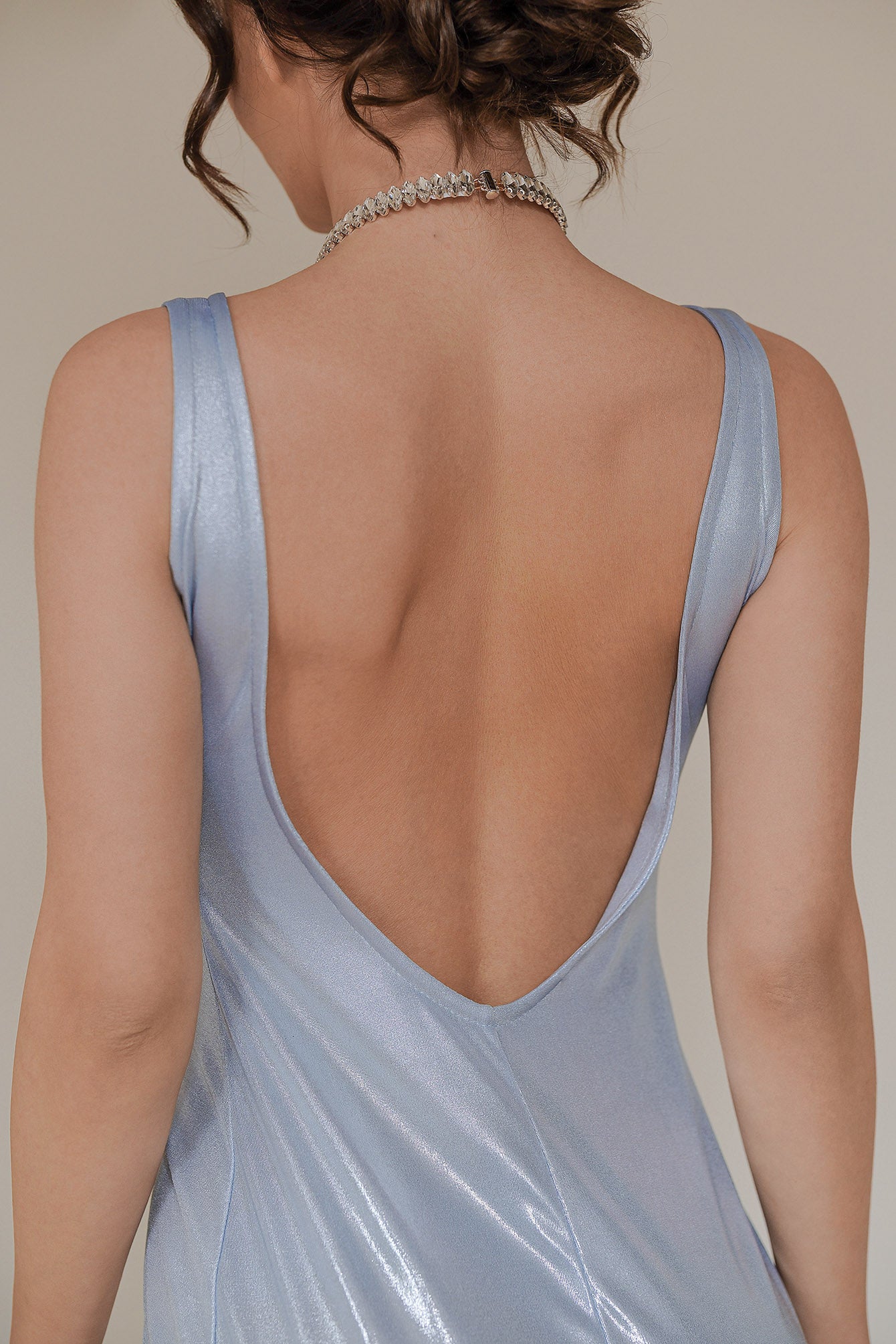 Elegant, long dress with a deep neckline and an exclusive design. Made of shiny elastic fabric that shimmers with light, it emphasizes the silhouette and brings a sense of luxury. The dress is sleeveless with a deep back that reveals the grace of the figure. It is suitable for both formal events and evening outings.