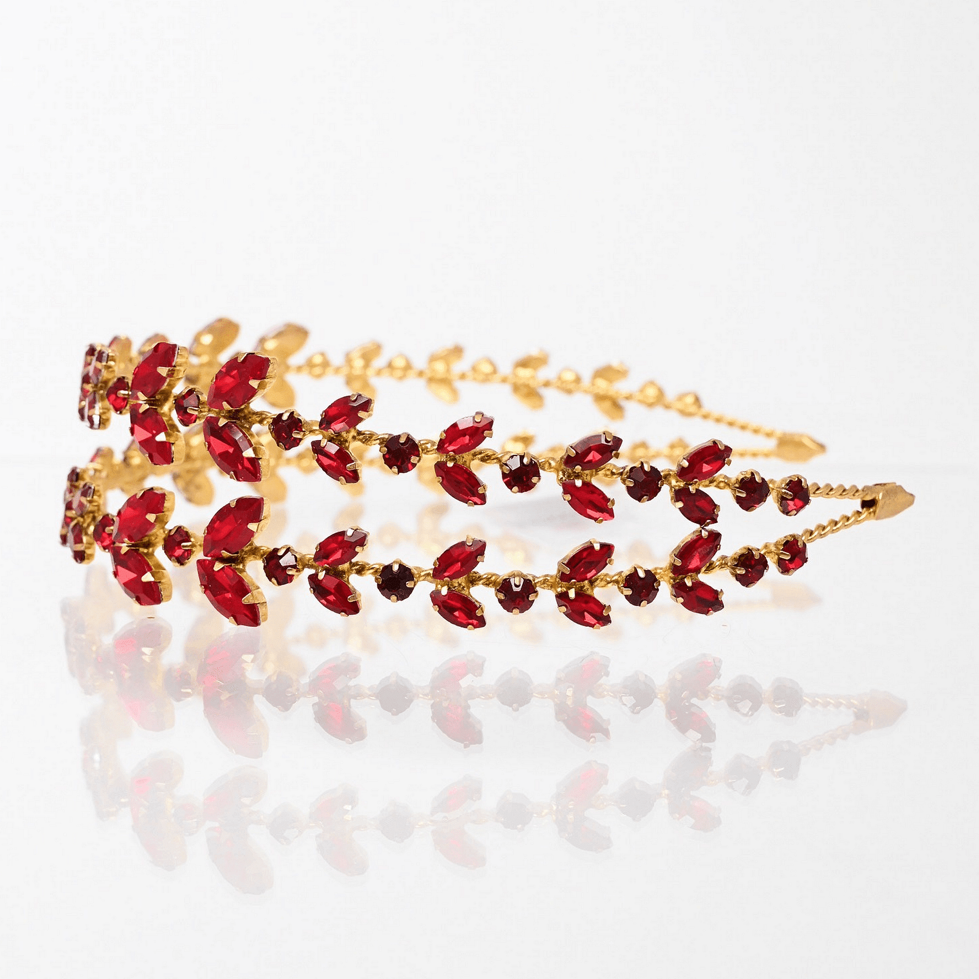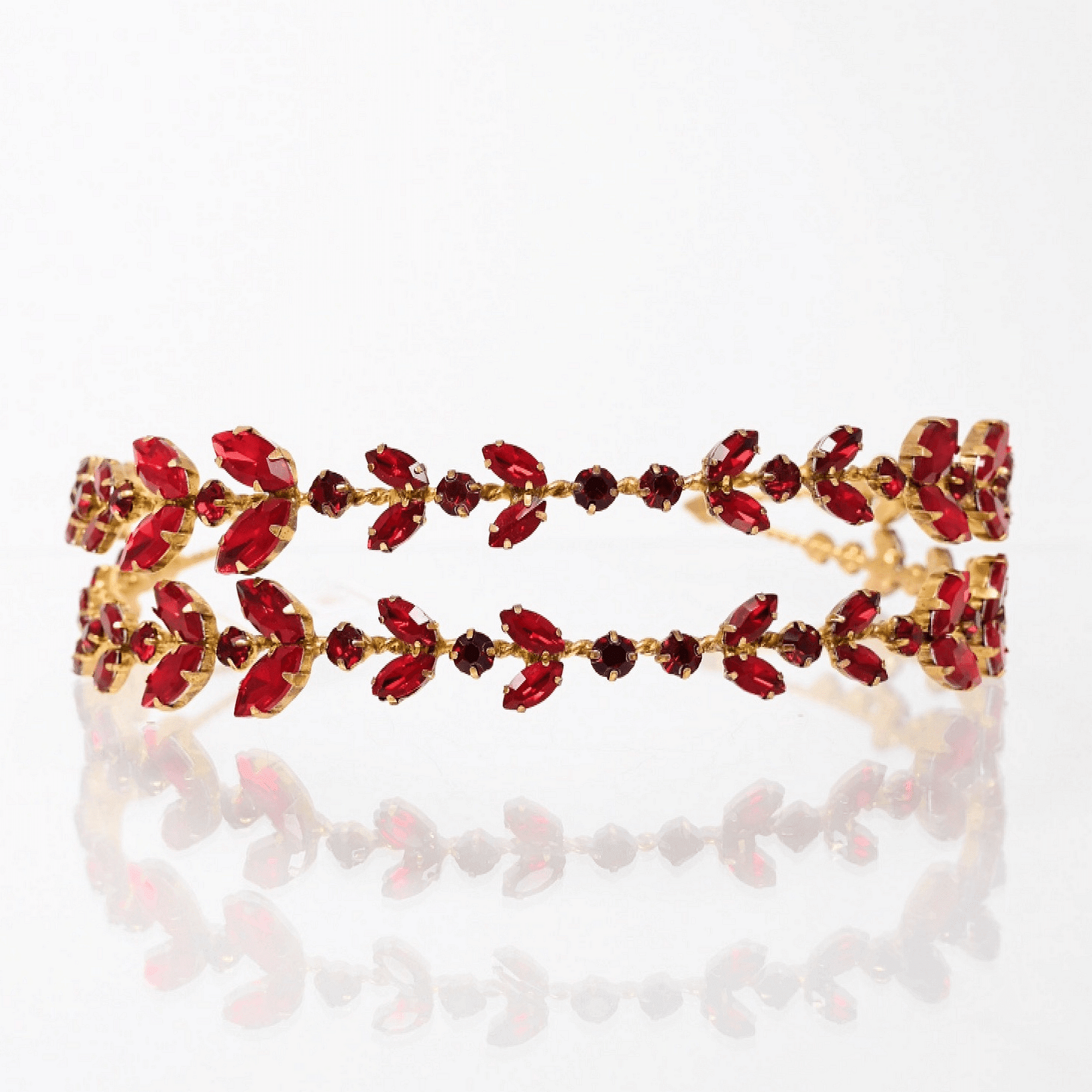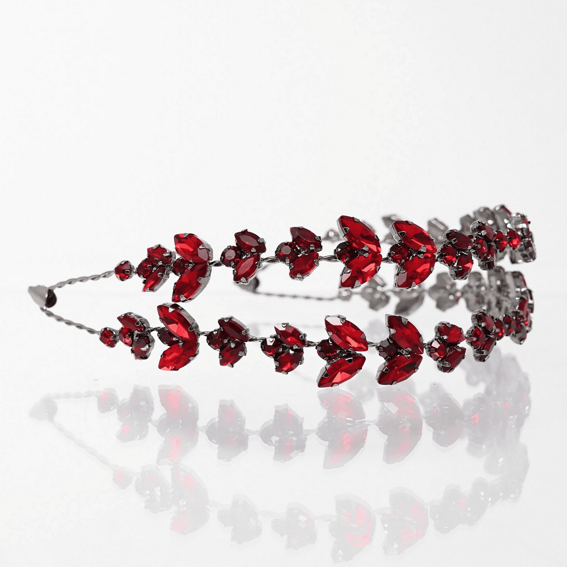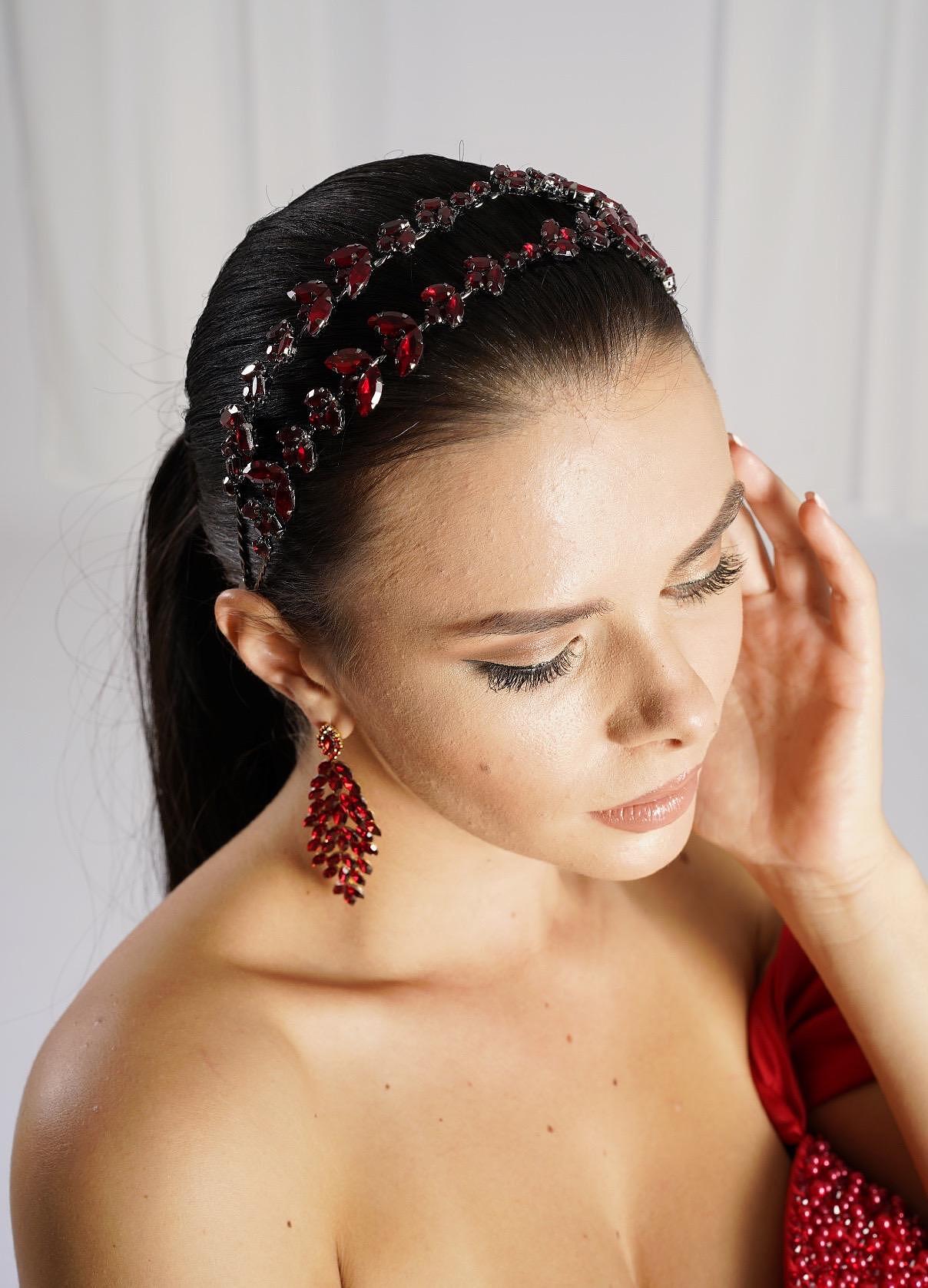 Double silver tiara with red zirconia crystals, about 4 centimeters wide. Suitable for your wedding day. It is made of high quality materials. The size can be adjusted to your head to be comfortable for everyone
