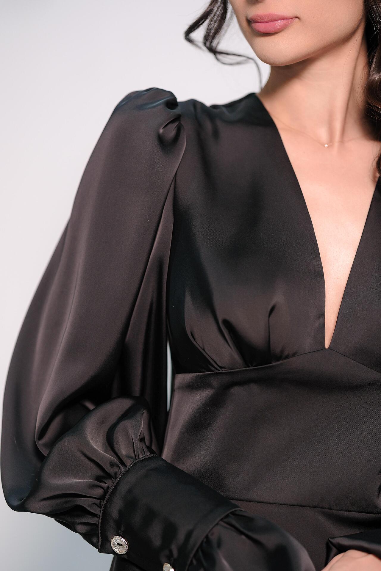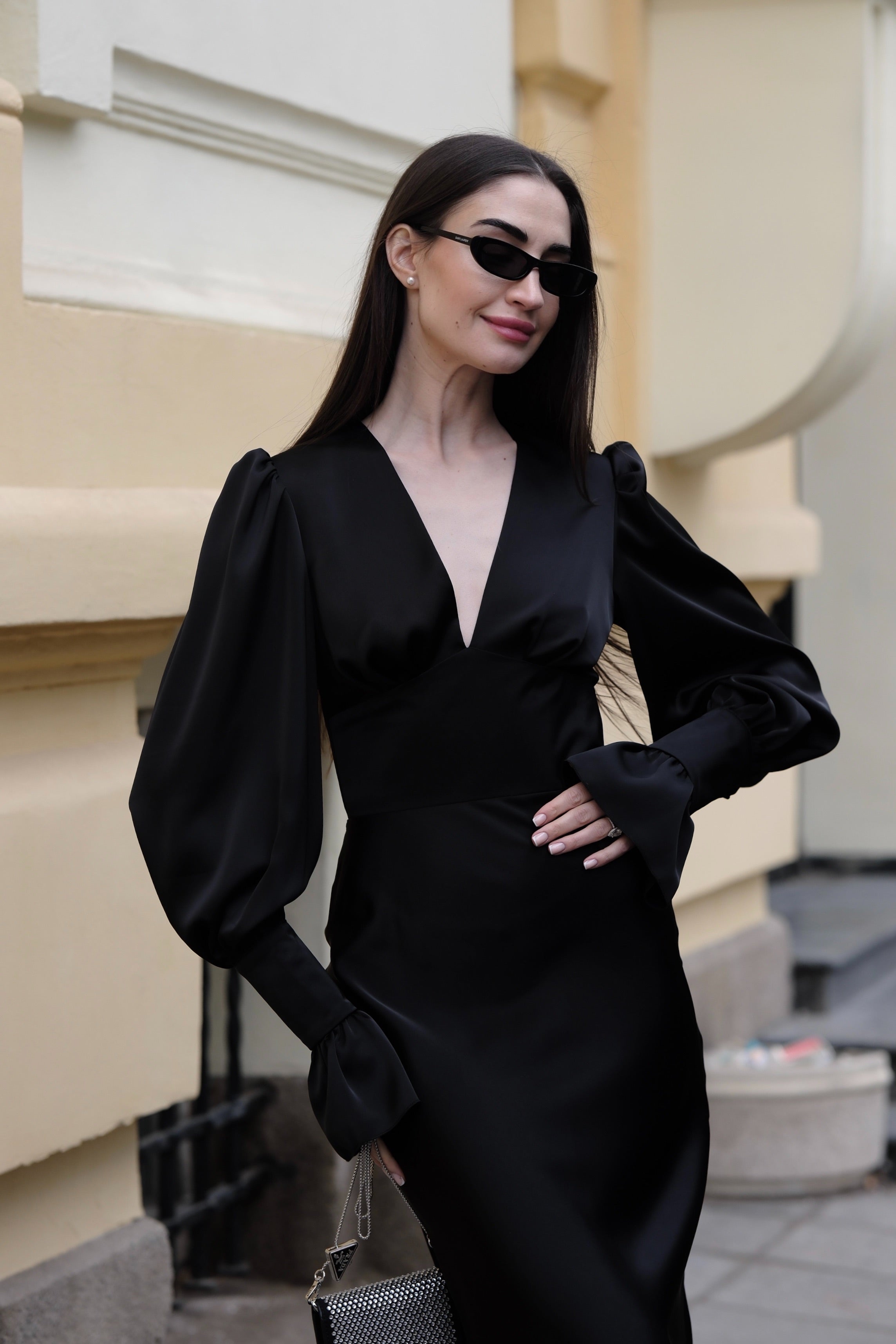 An elegant dress, whose design was created with femininity and comfort in mind. The soft satin fabric falls smoothly, emphasizing the curves of the body. It has a deep V-neck and voluminous sleeves with cuffs and elegant buttons, which give completeness and class. The back is clean and elegant, with a hidden zipper that ensures easy dressing. The skirt is long, with a slight flare, which creates a smooth movement when walking. The fabric is a luxurious satin with a slight sheen that reflects the light in an elegant way, making the dress extremely stylish and spectacular.